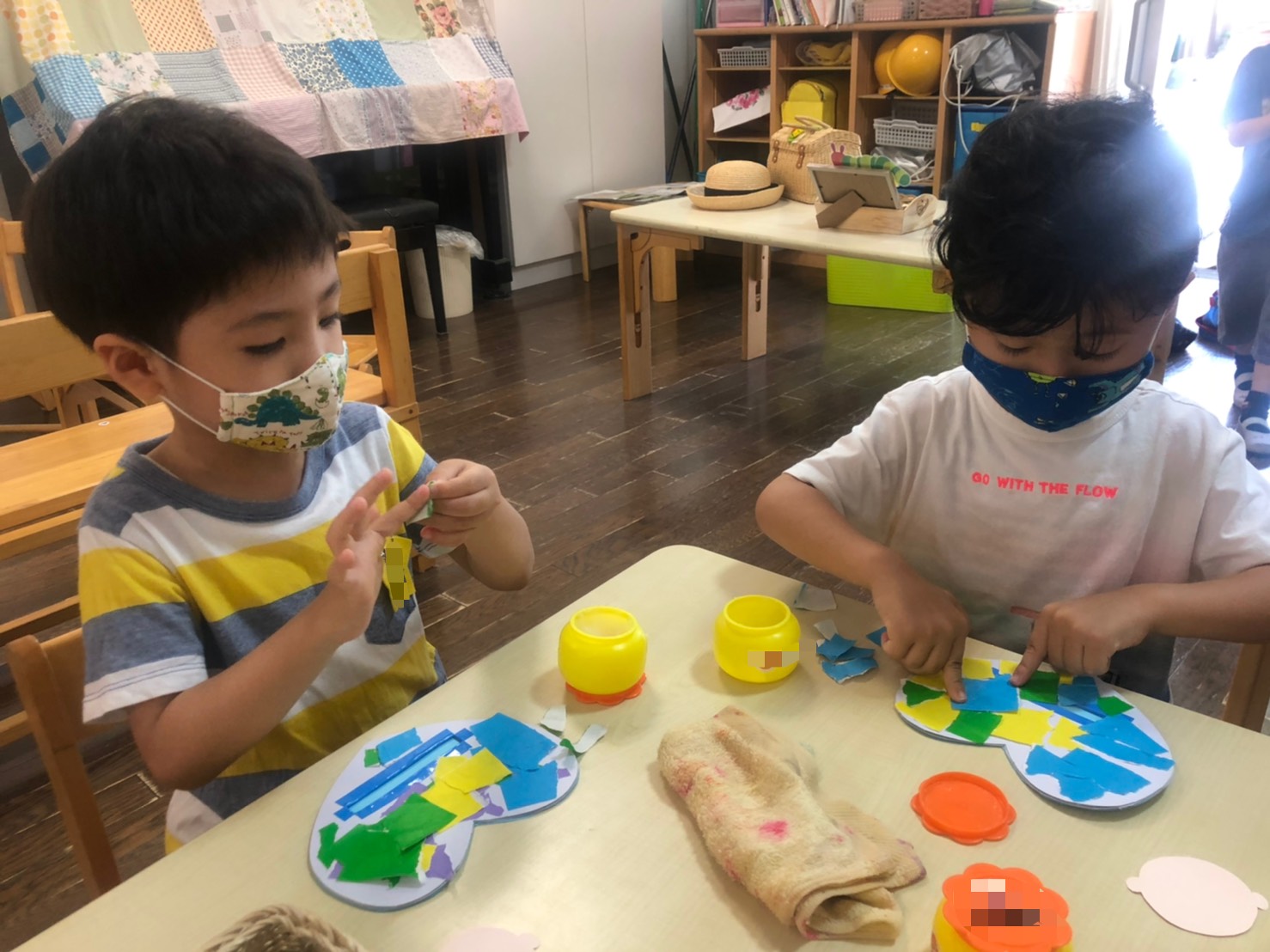 たんぽぽ組では、父の日のプレゼントを作りました。折り紙をちぎってのりでペタペタ…