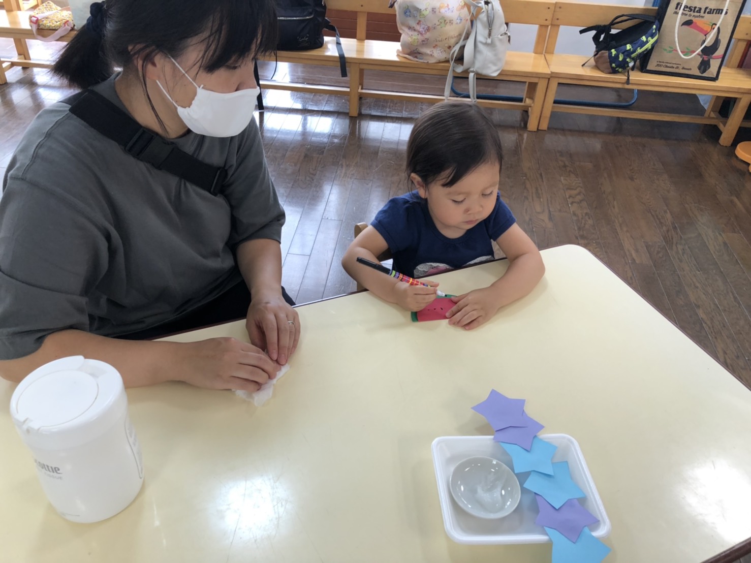今日は星つなぎとすいかを作りました。のりで貼って、小さな種を書いたり。とても上手でしたね。