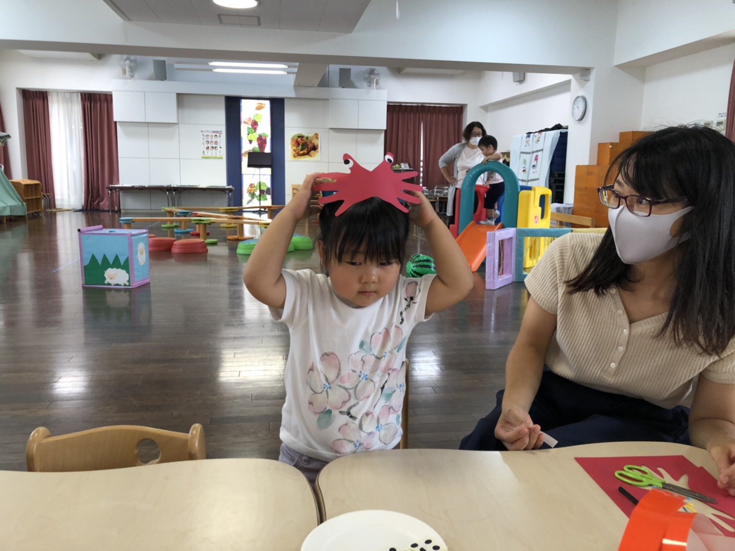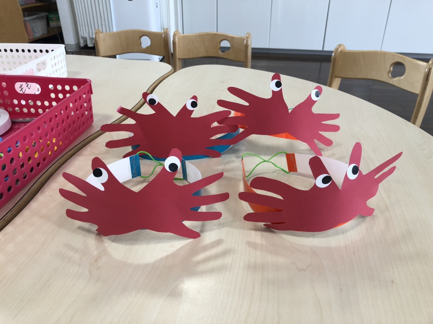 前回切った手型に目をつけてバンドをつけたらカニのお面の出来上がり!