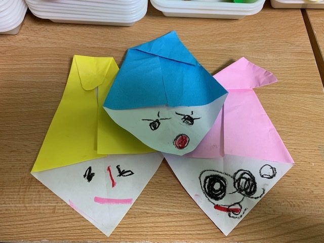 初めての折り紙 今日のひとこま 2020.07.13 ゆり組では初めての折り紙に挑戦!小人と犬をおりました。「かどとかどをあわせてー」「きれいにおってー」など難しい事がたくさんありましたが、頑張って折りました。お顔を描くのはとても上手!可愛い小人さんと犬さんができましたね。