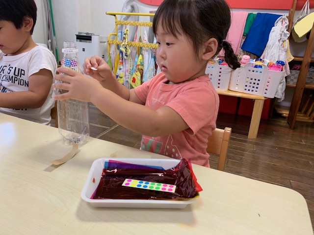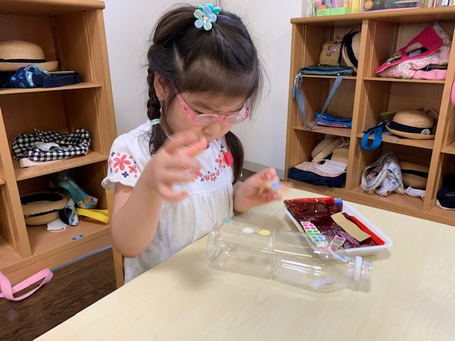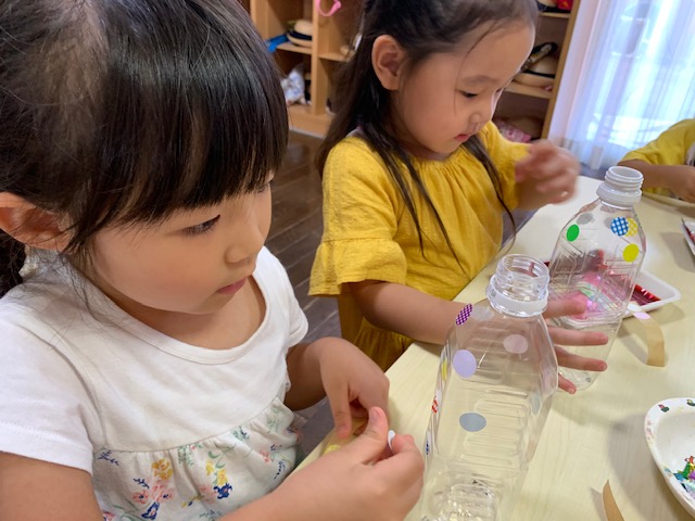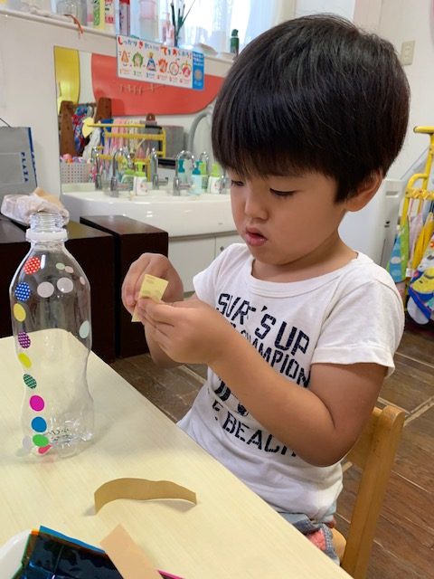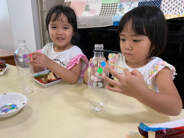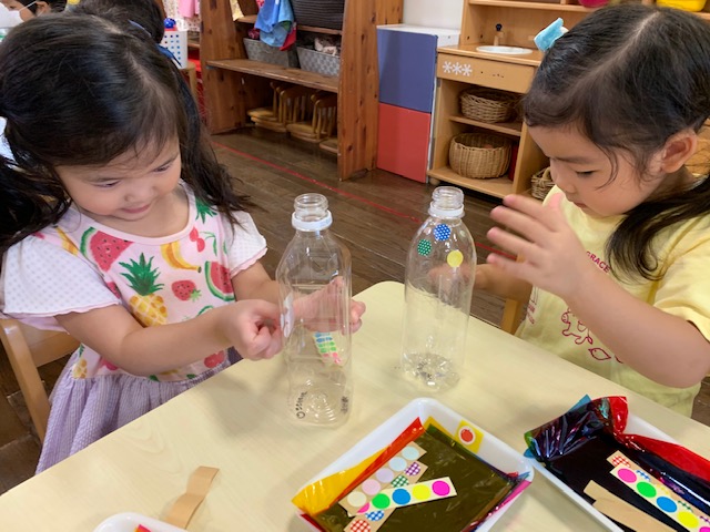 シールを貼ったりセロファンをペットボトルの中に入れたりして、丁寧に作りあげました。めぐみフェスで遊ぶのが楽しみですね♪