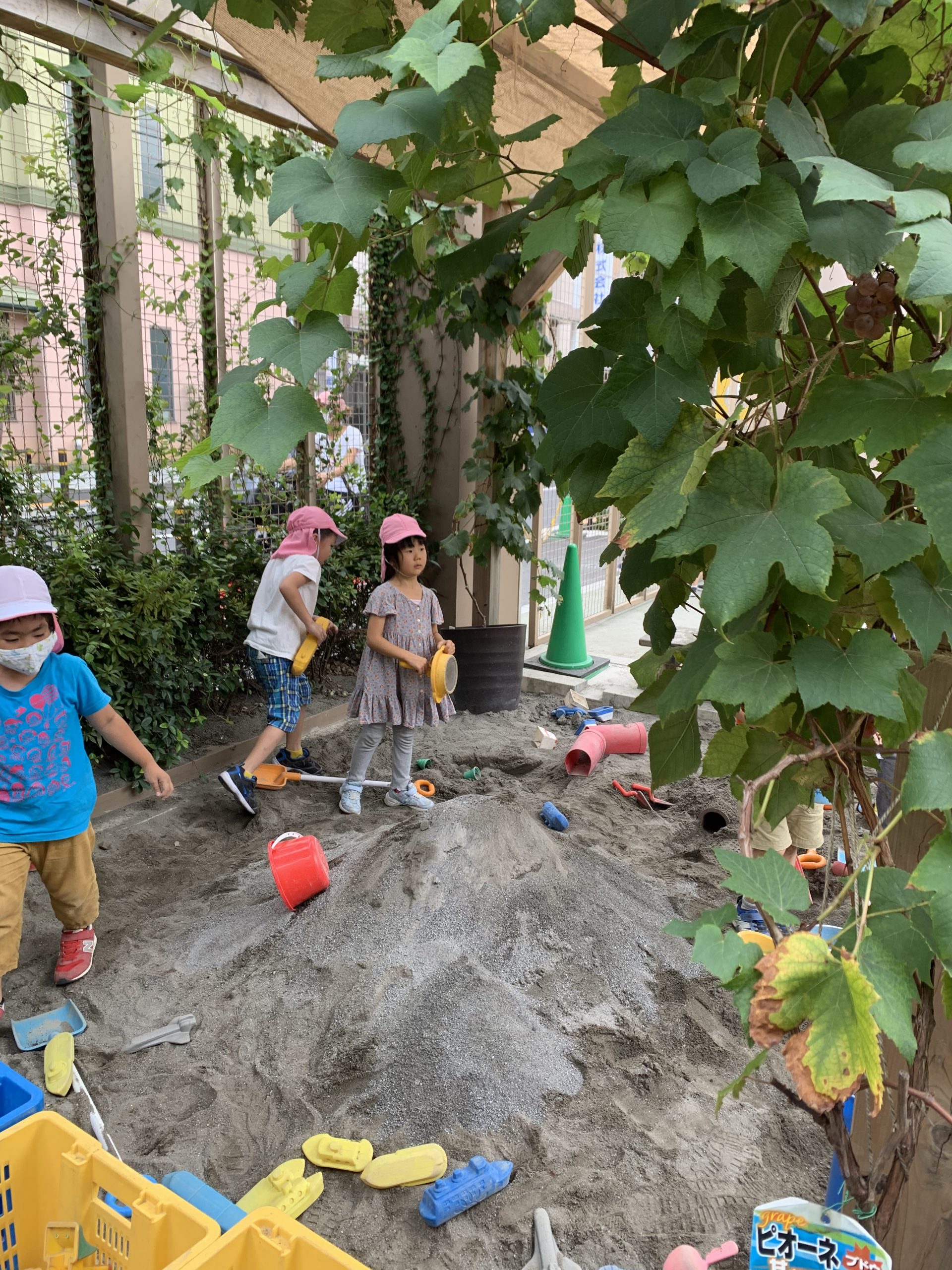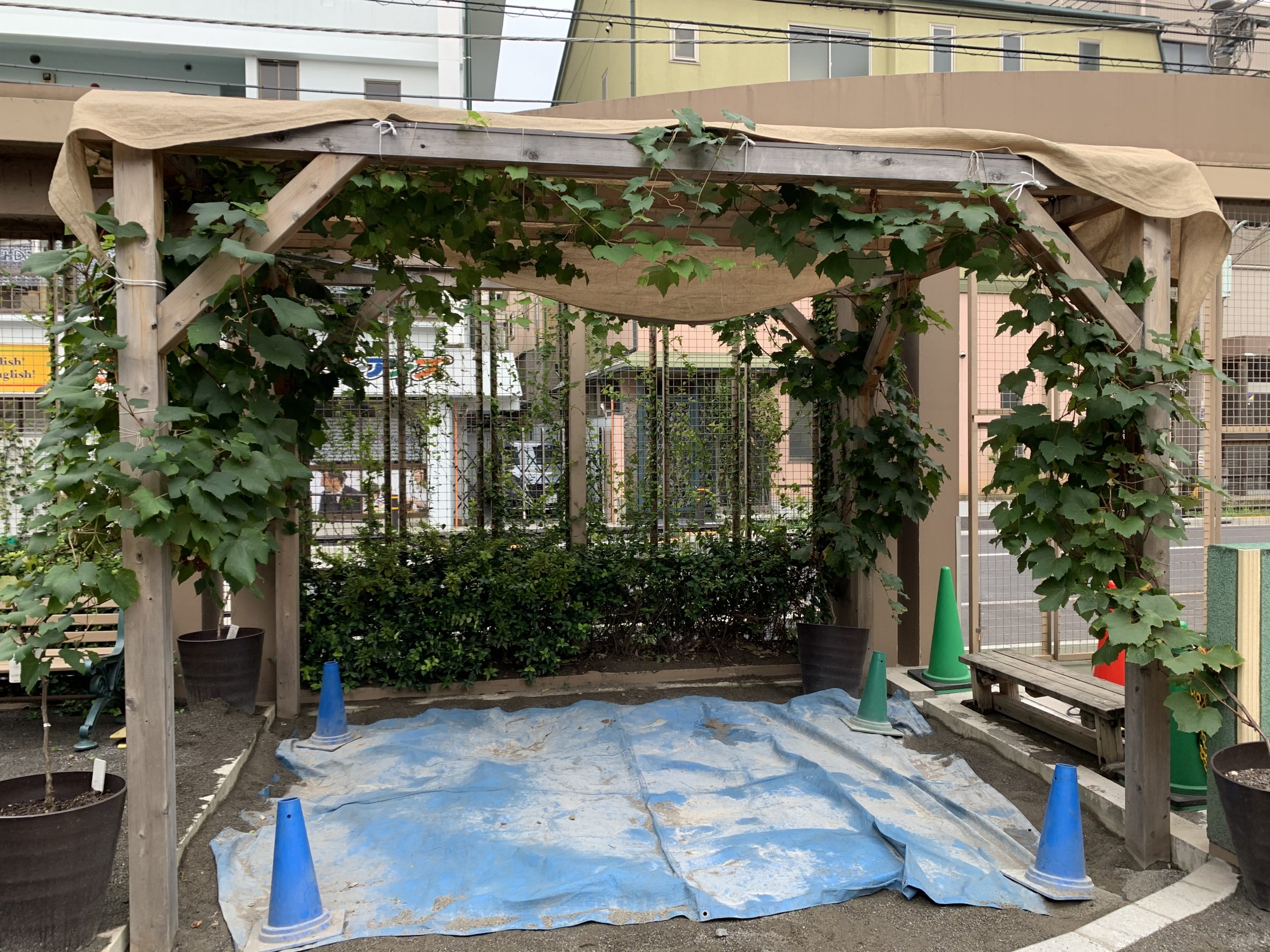 昨年、めぐみ幼稚園は砂場にぶどうの木を植えました。砂場で、子どもたちが日差しを気にせずにゆっくり遊べるようにです。