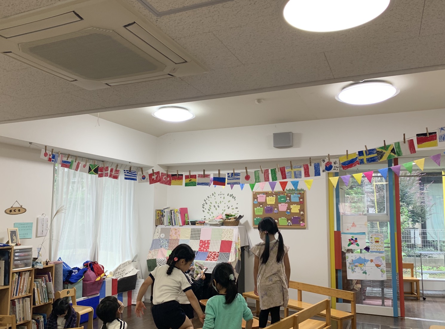 いよいよ運動会が近づいてきました。年長さくら組ではいろいろな国の国旗を描きました。運動会当日に飾る予定です。国旗の本などを見ながら、楽しく描いていました。