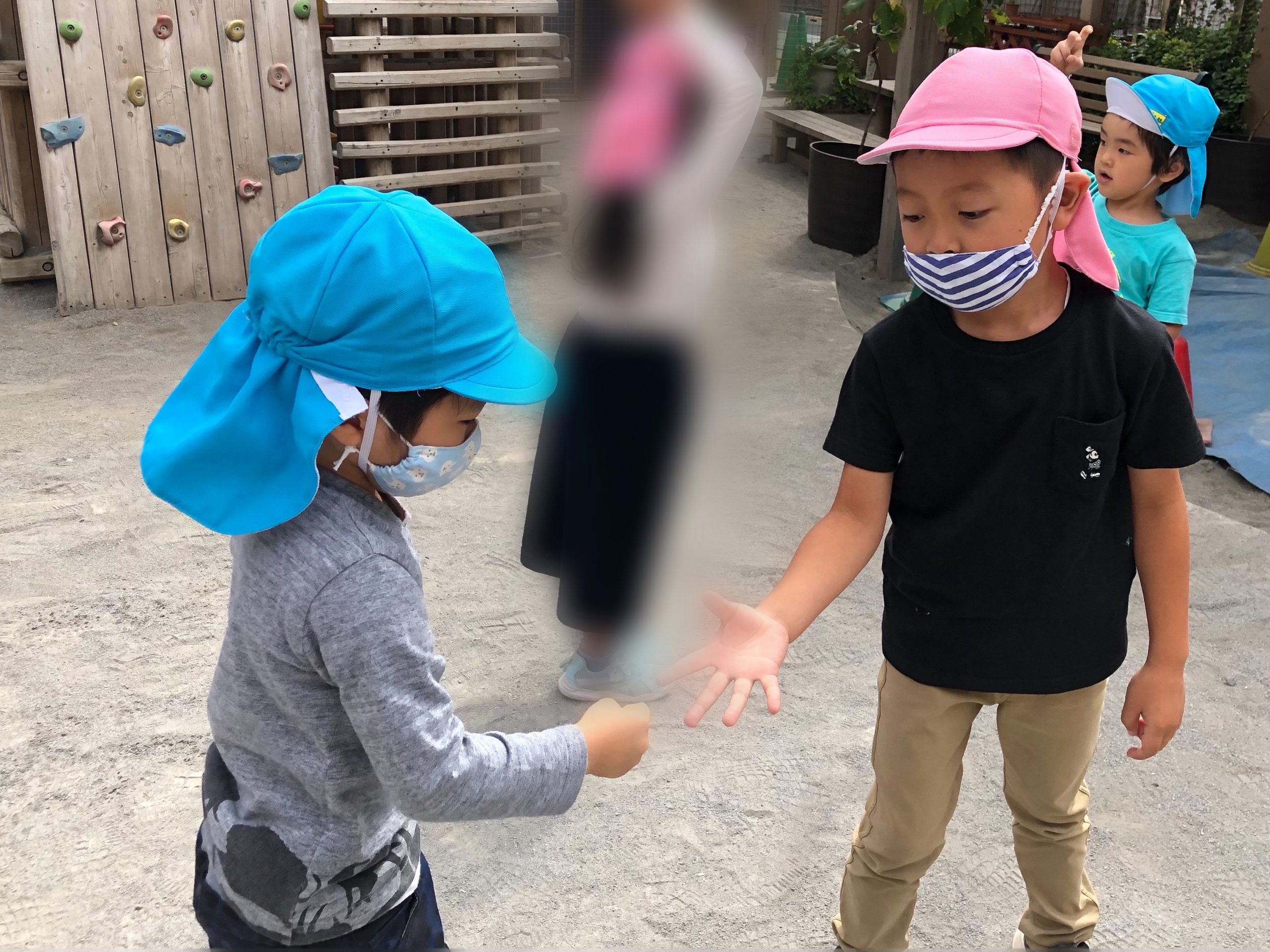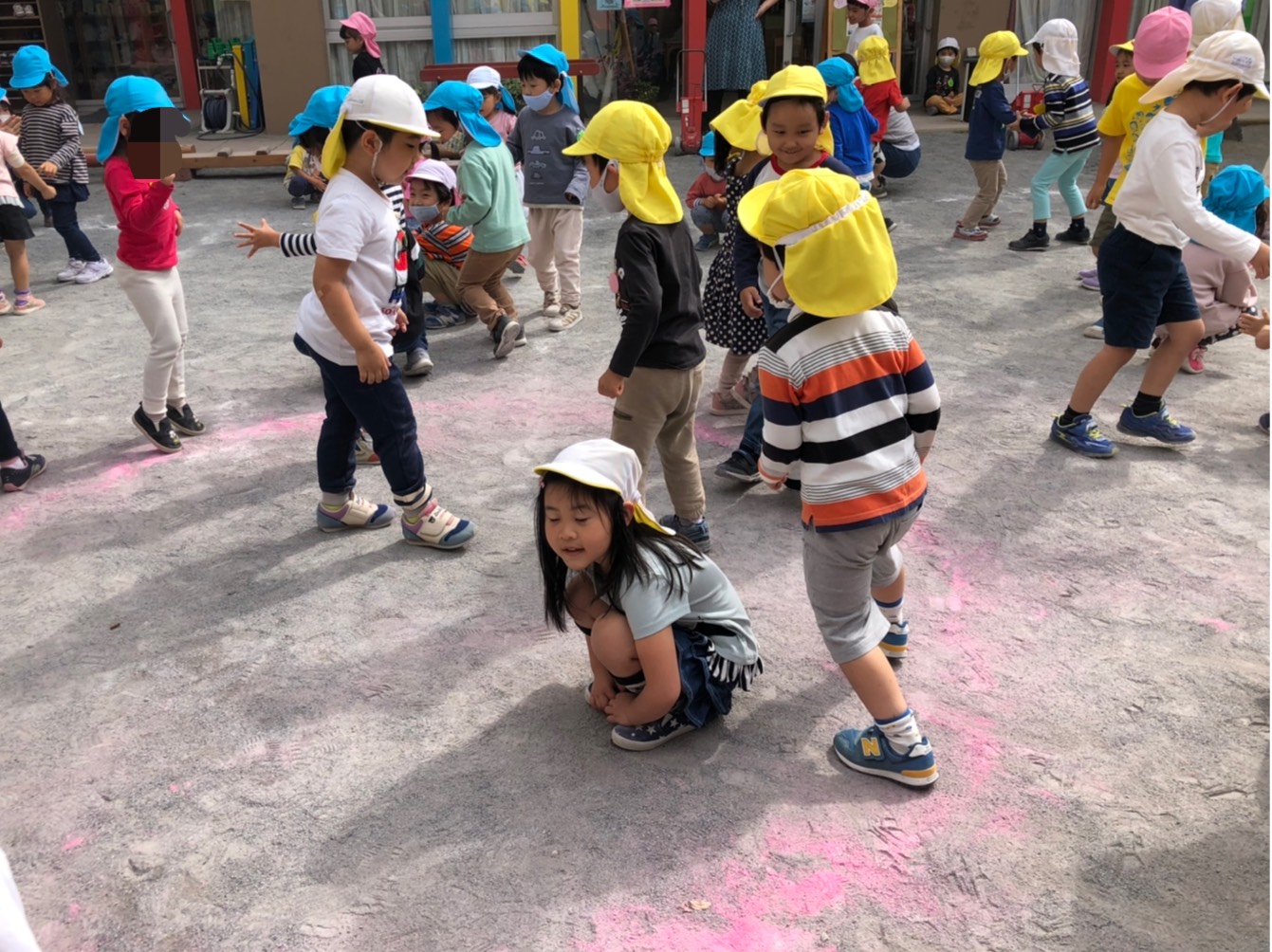 体操 今日のひとこま 2020.10.07 今日は外で開会式の練習と、体操をしました。体操では、お友達とのじゃんけんをし、負けたら座り手拍子をし・勝ったらお友達の周りをスキップ…を2人組で『アルプス一万尺』の音楽に合わせて楽しんでいますね。皆…とても楽しそうにしていました。明日も元気に登園してくださいね!