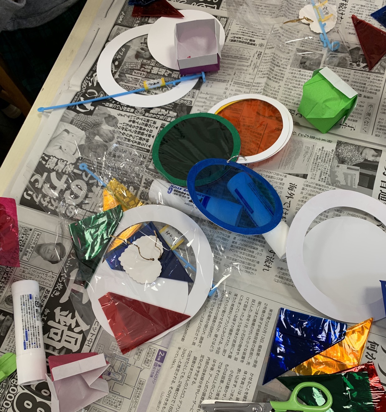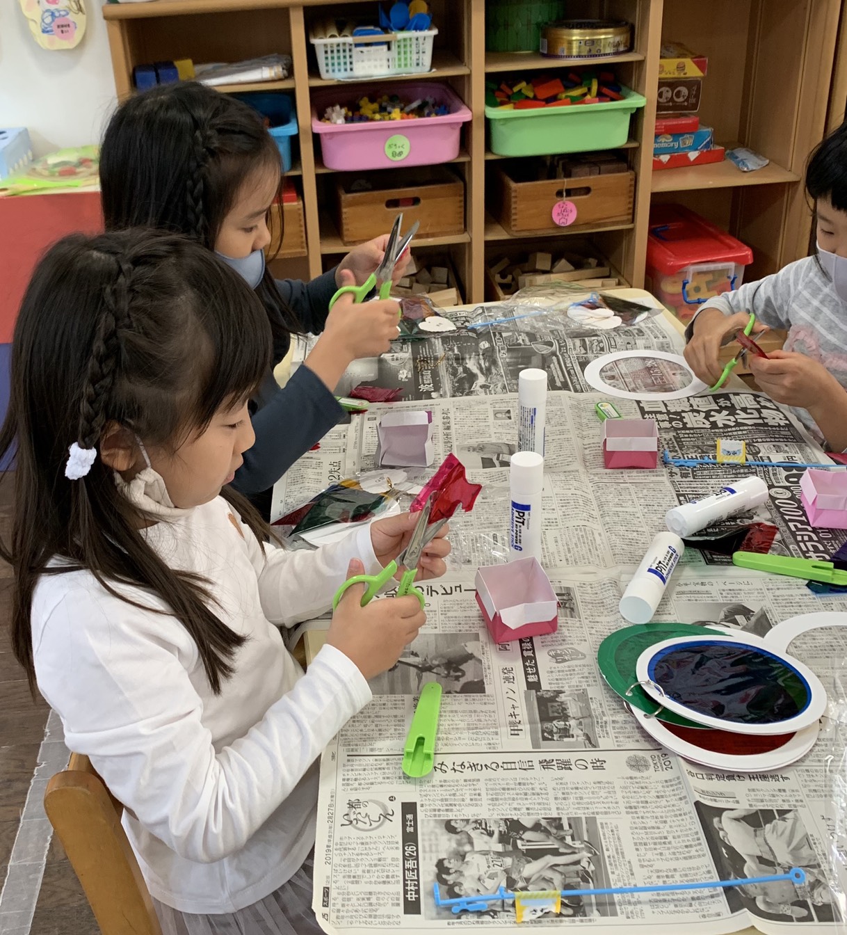 年長さくら組では、おうちの方が楽しい製作を用意して下さいました。色のお話をみんなで聞いた後、カラーセロファンを切って、きれいな模様を作りました。丸い台紙にはさんで。。。これから素敵なものに仕上がるそうです!後日、それを飾る日を予定しています。とても楽しみですね!
