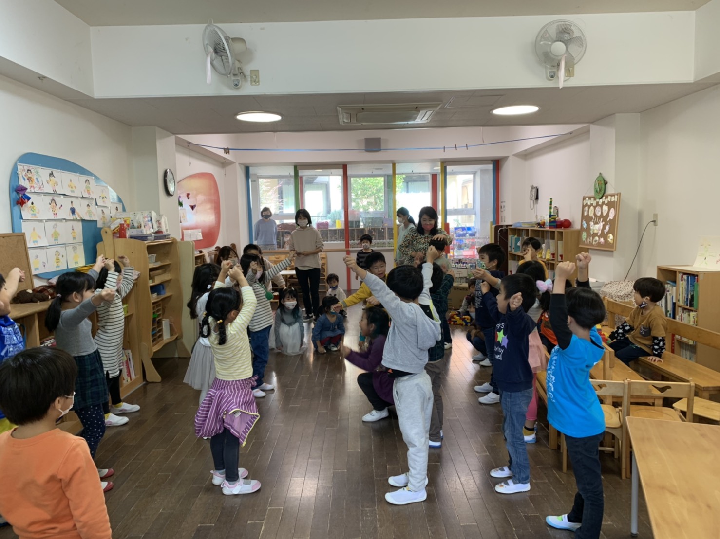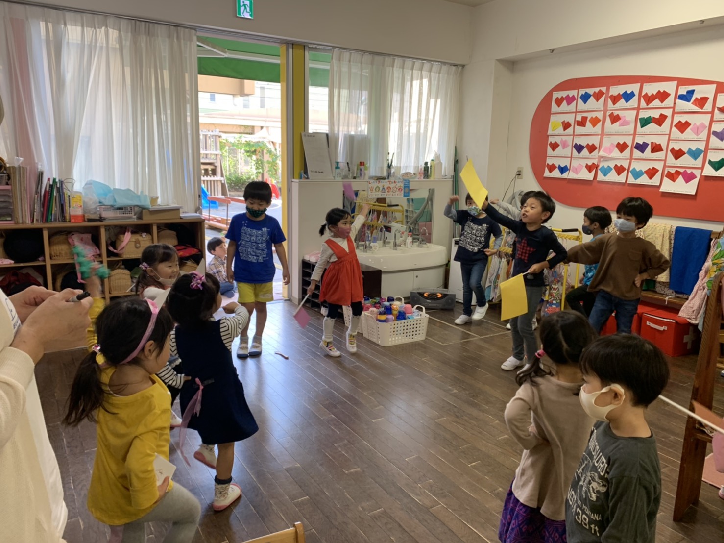 今日は年少さんや年中さんのお部屋におでかけして、運動会の旗ダンスを一緒に踊った年長さん。みんなで踊ってとても楽しい交わりの時となりました。