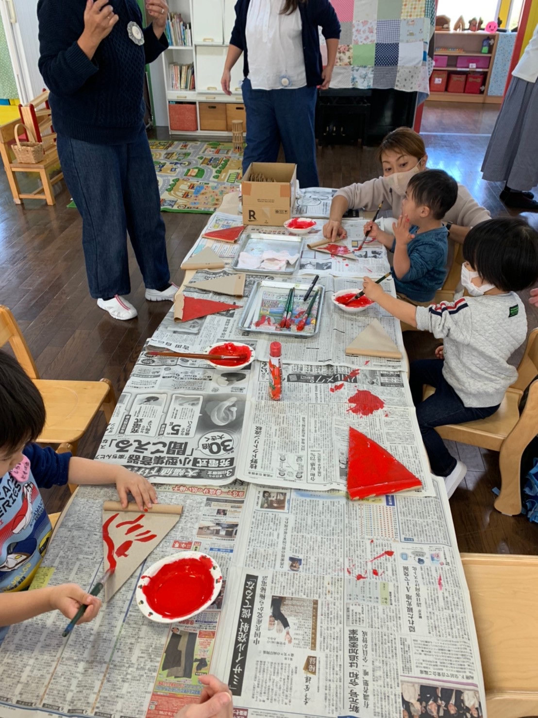 トマトソースに見立てた赤い絵の具をピザ型の紙に塗りました。