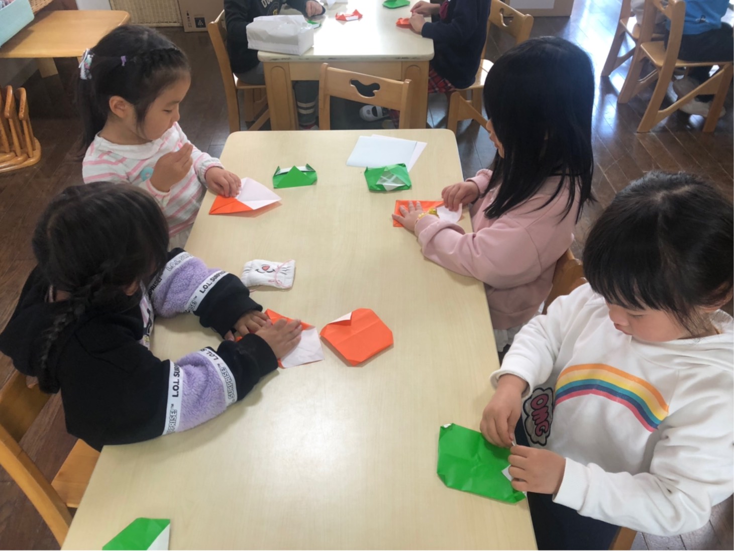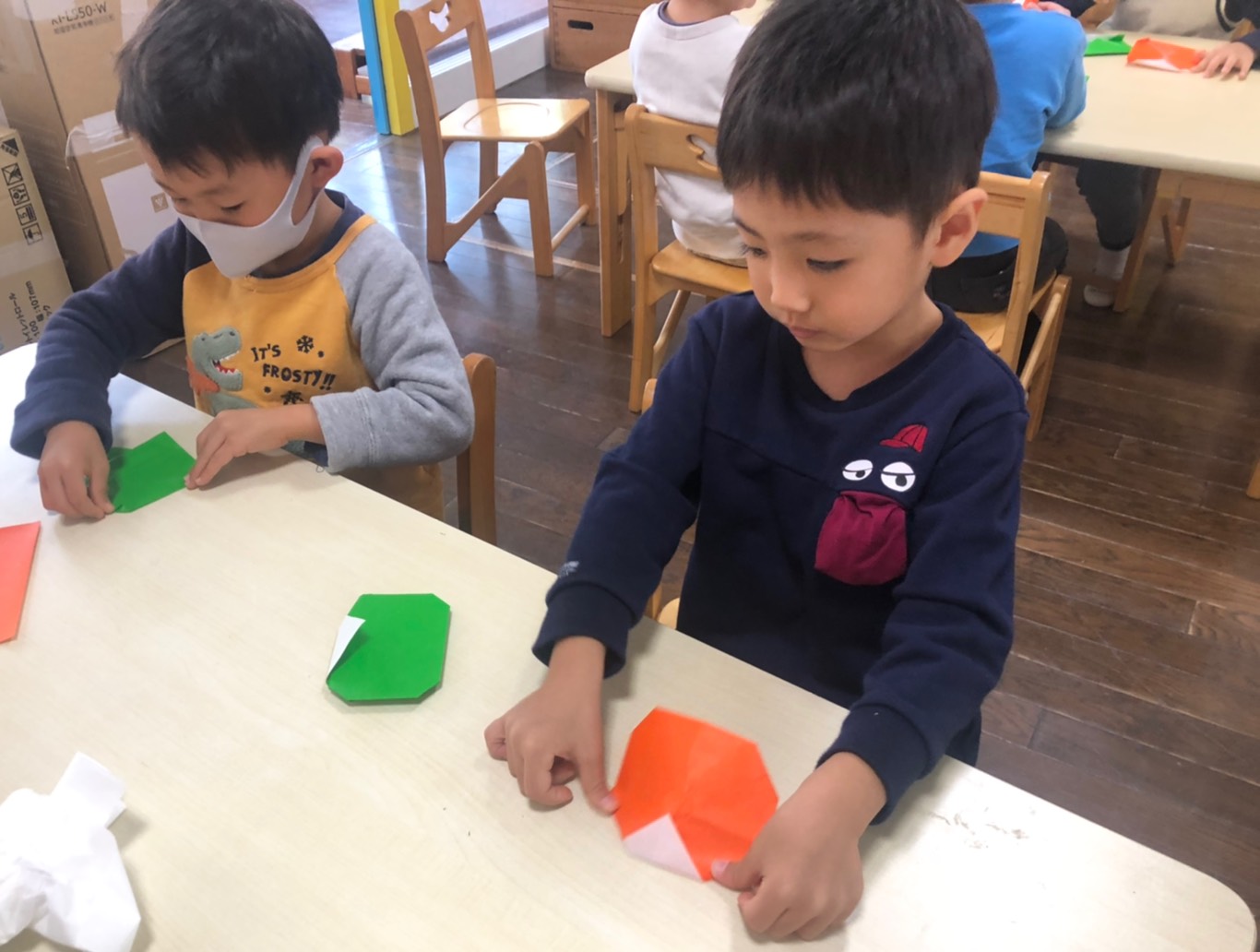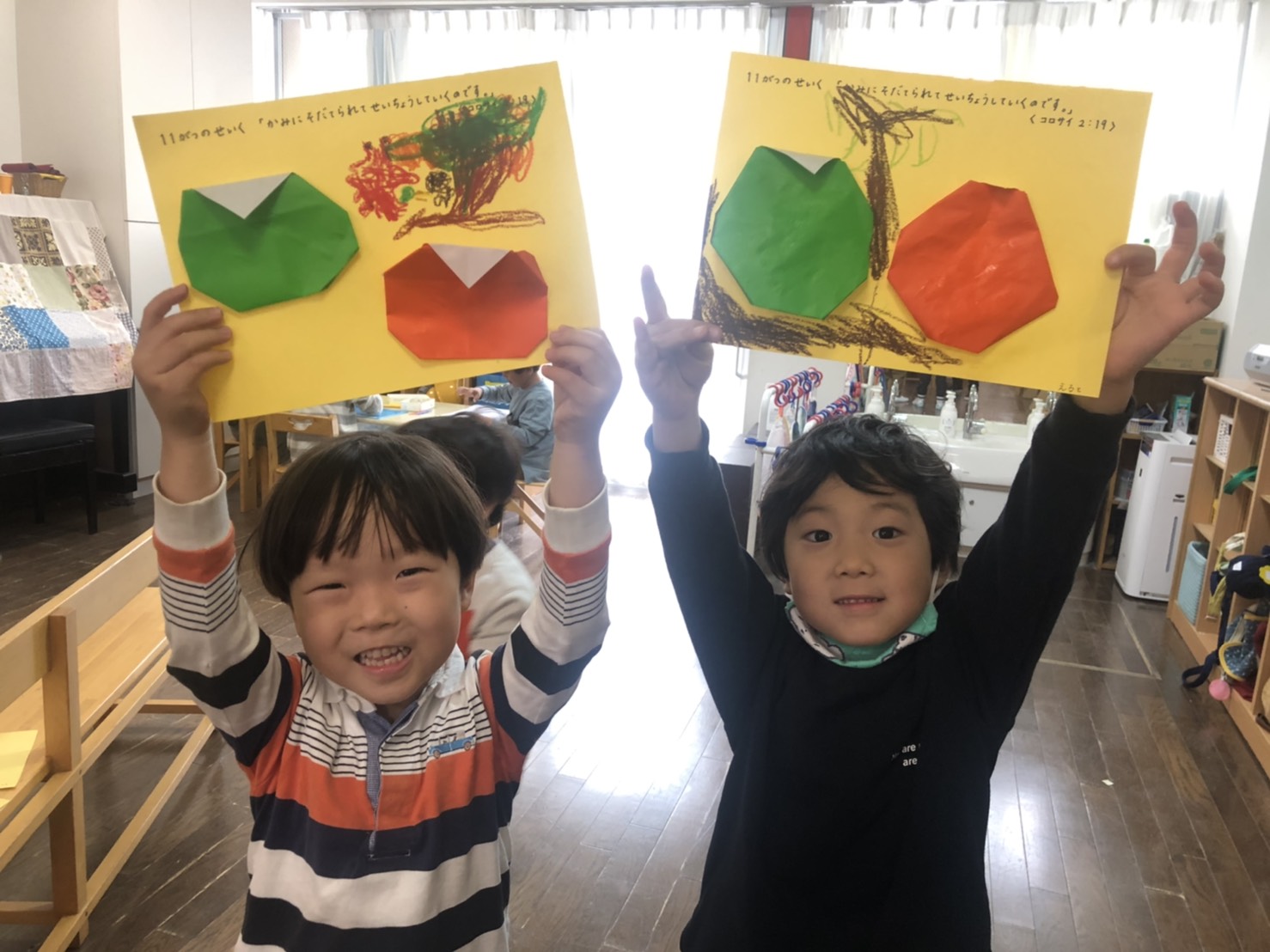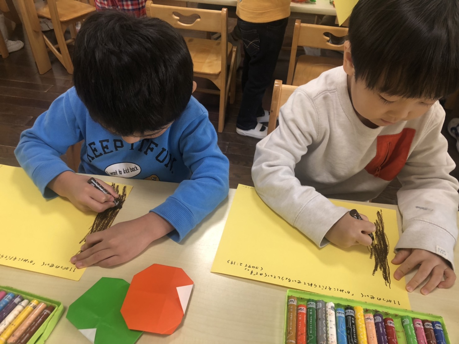 柿 今日のひとこま 2020.11.02 たんぽぽ組では、折り紙で柿を折りました。 色々な形の柿ができました。 折ったあとは11月の聖句が書かれた紙に貼り付け、お絵描き。柿の木や、木に登る猿を描いているお友達など…様々でした。 水曜日も元気に登園してくださいね♪
