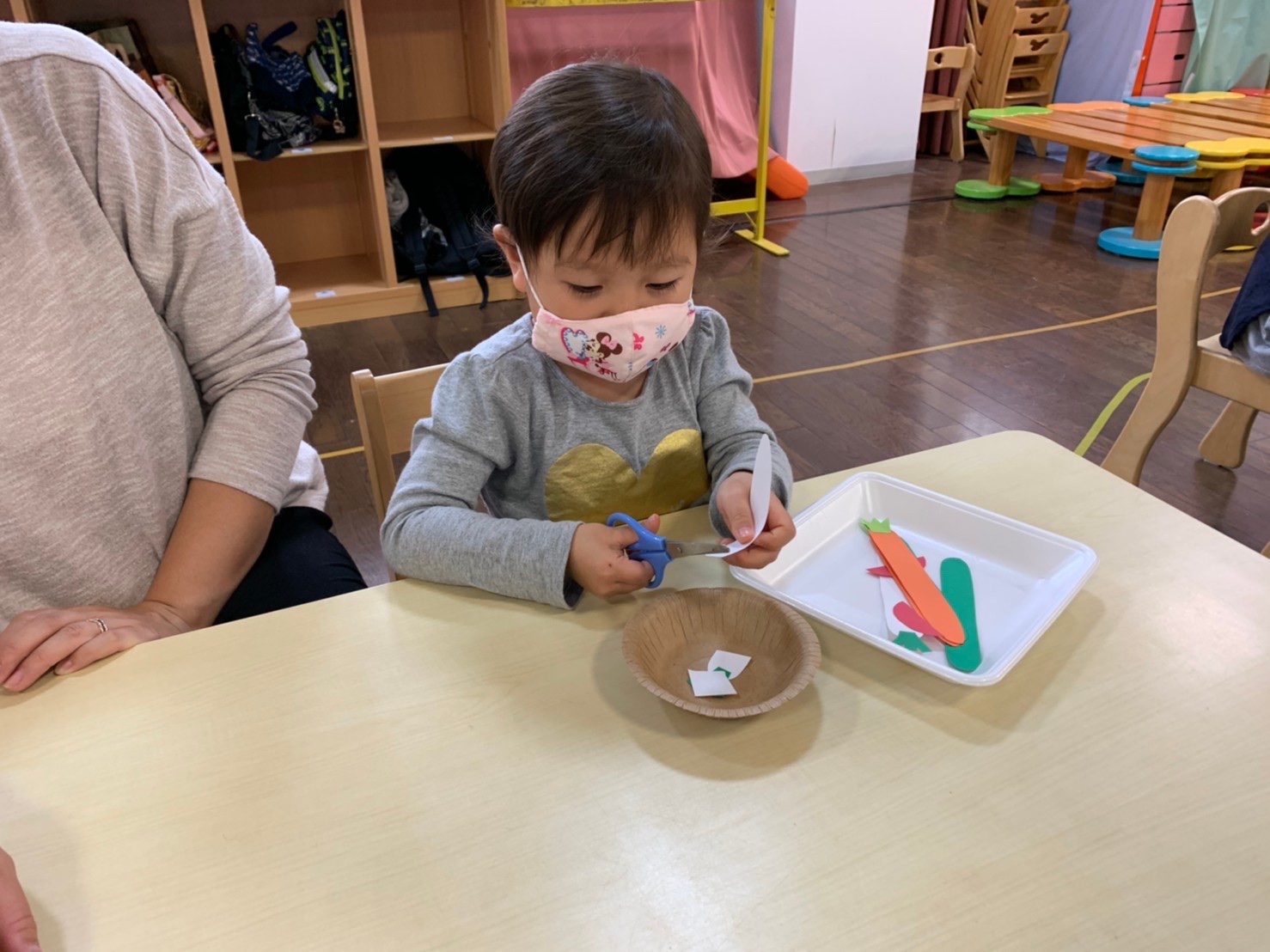 今日のもも組は、お買い物ごっこで色紙の野菜を買って、ハサミで切ってサラダ作りをしました。