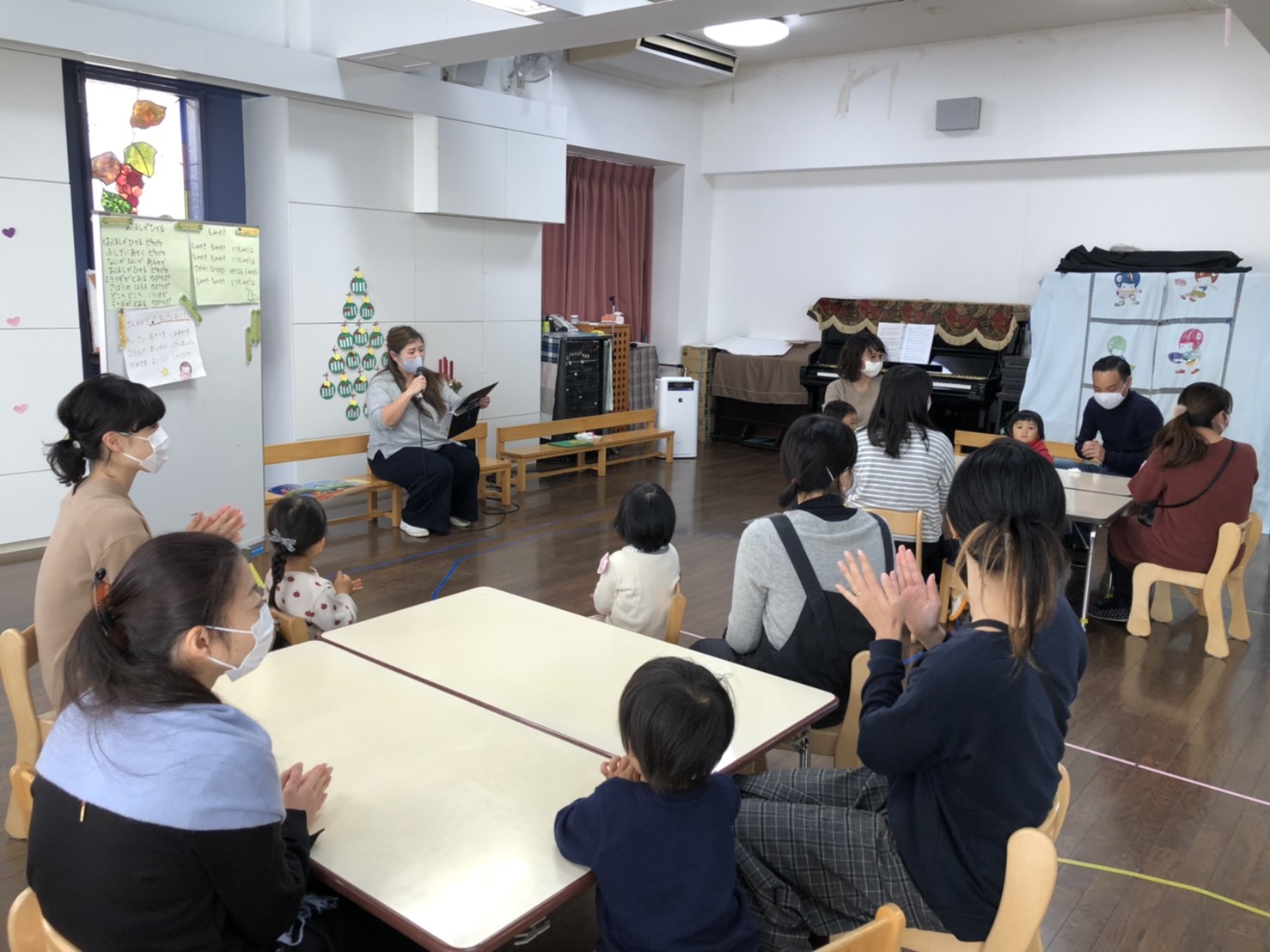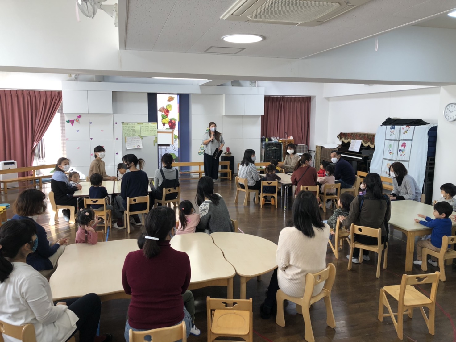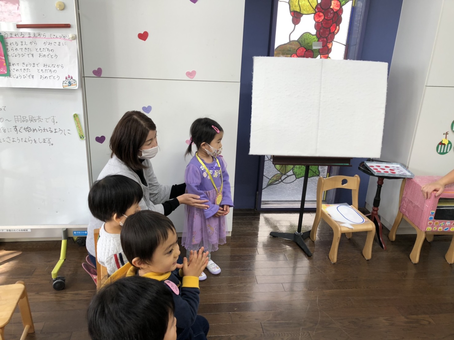 誕生会をして、パネルシアターのケーキ作りをみんなで楽しみました。