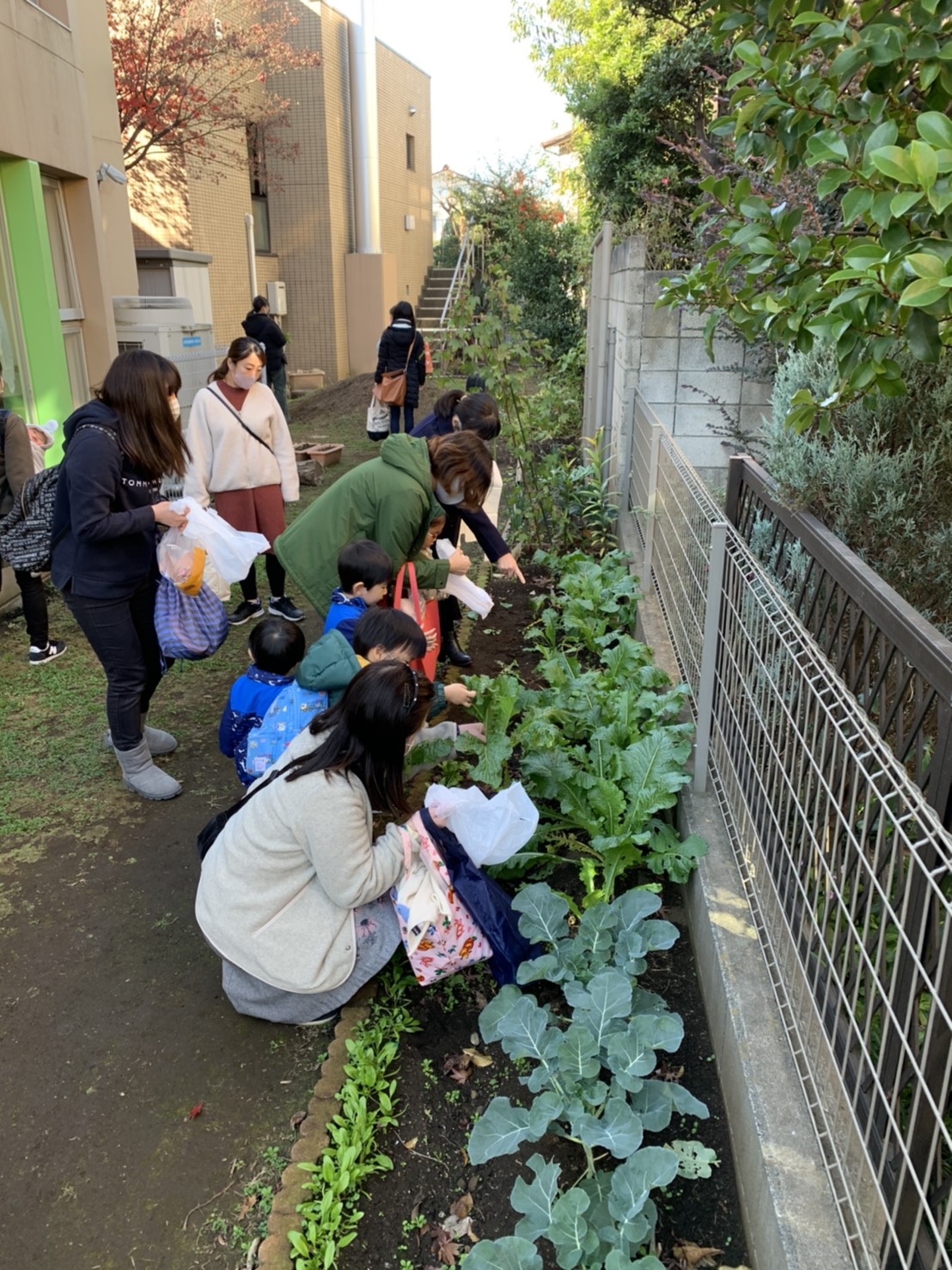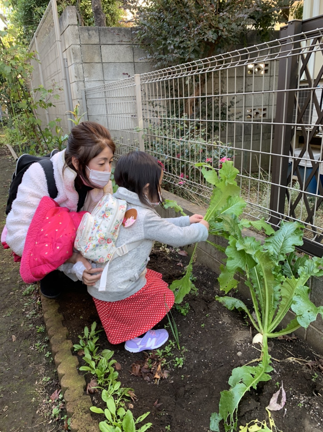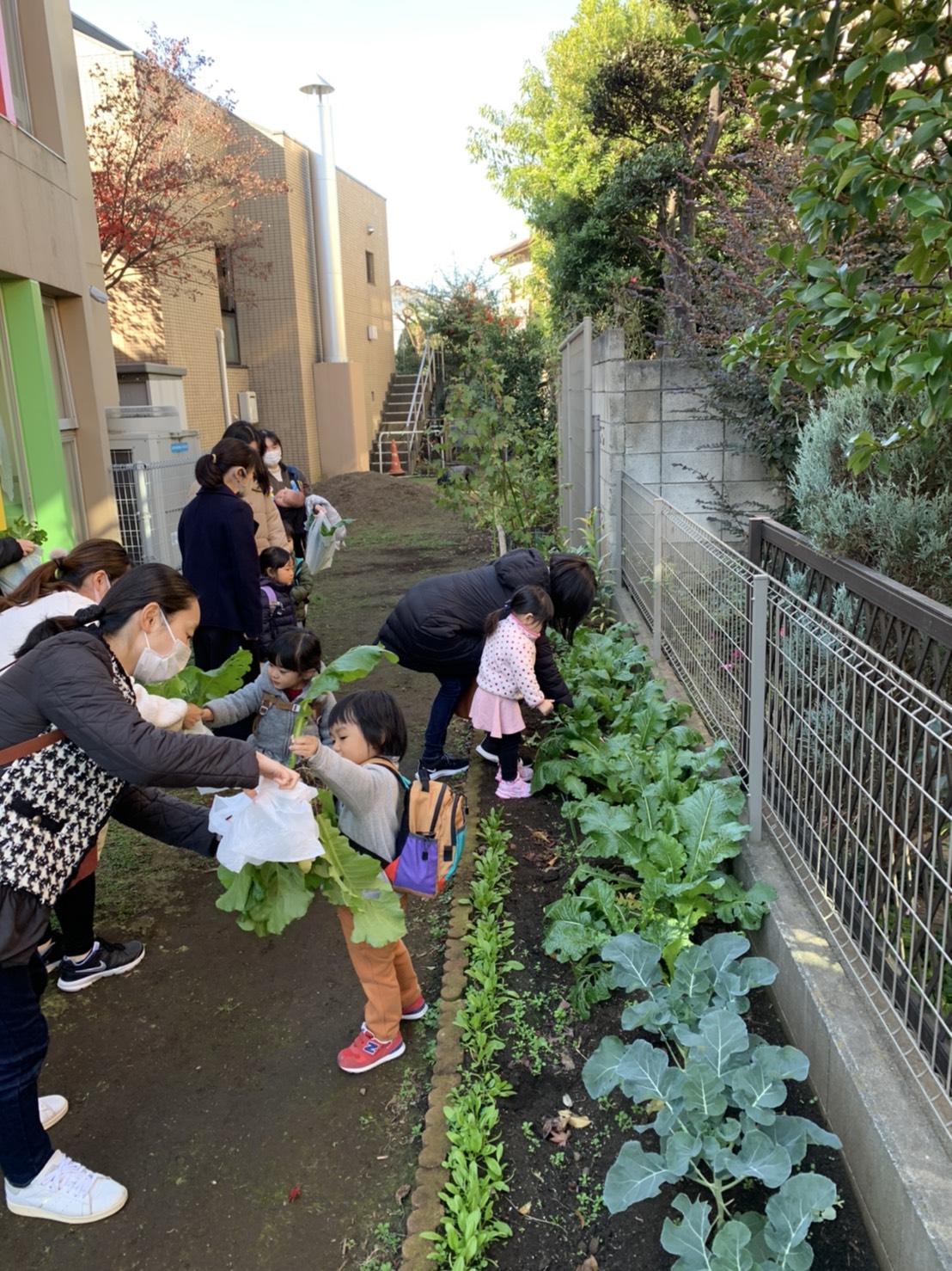 大きなかぶのお話を聞いてから、裏庭でかぶの収穫体験をしました。