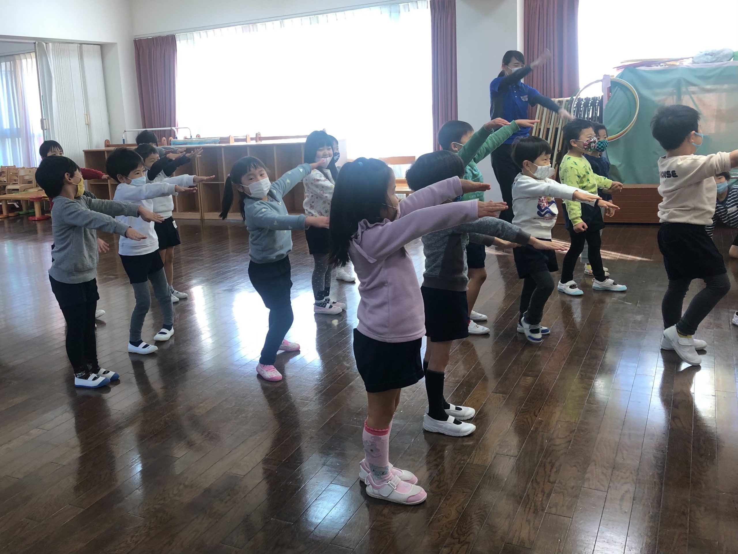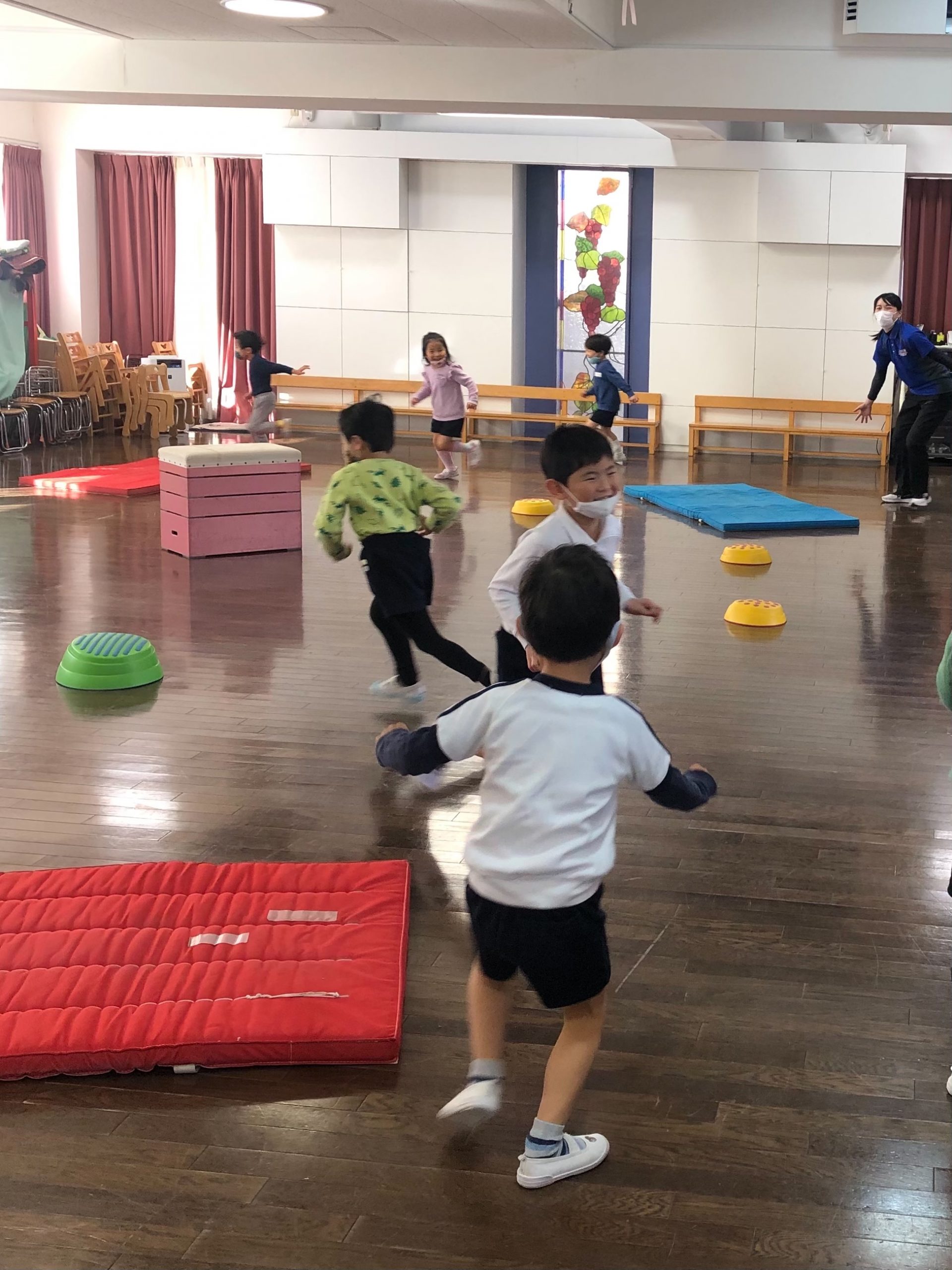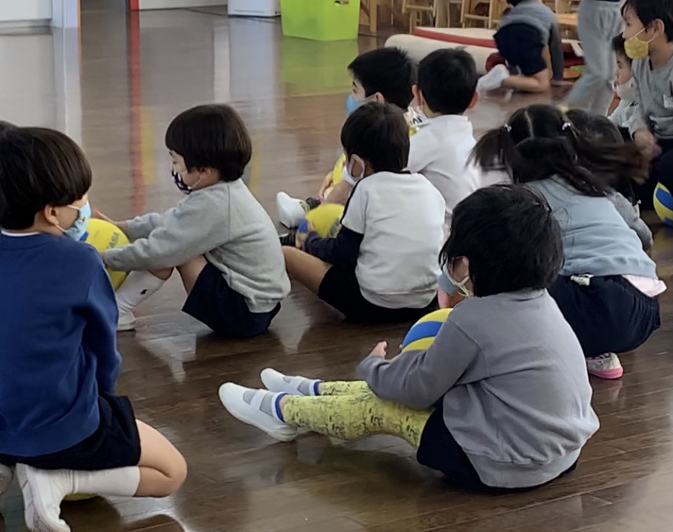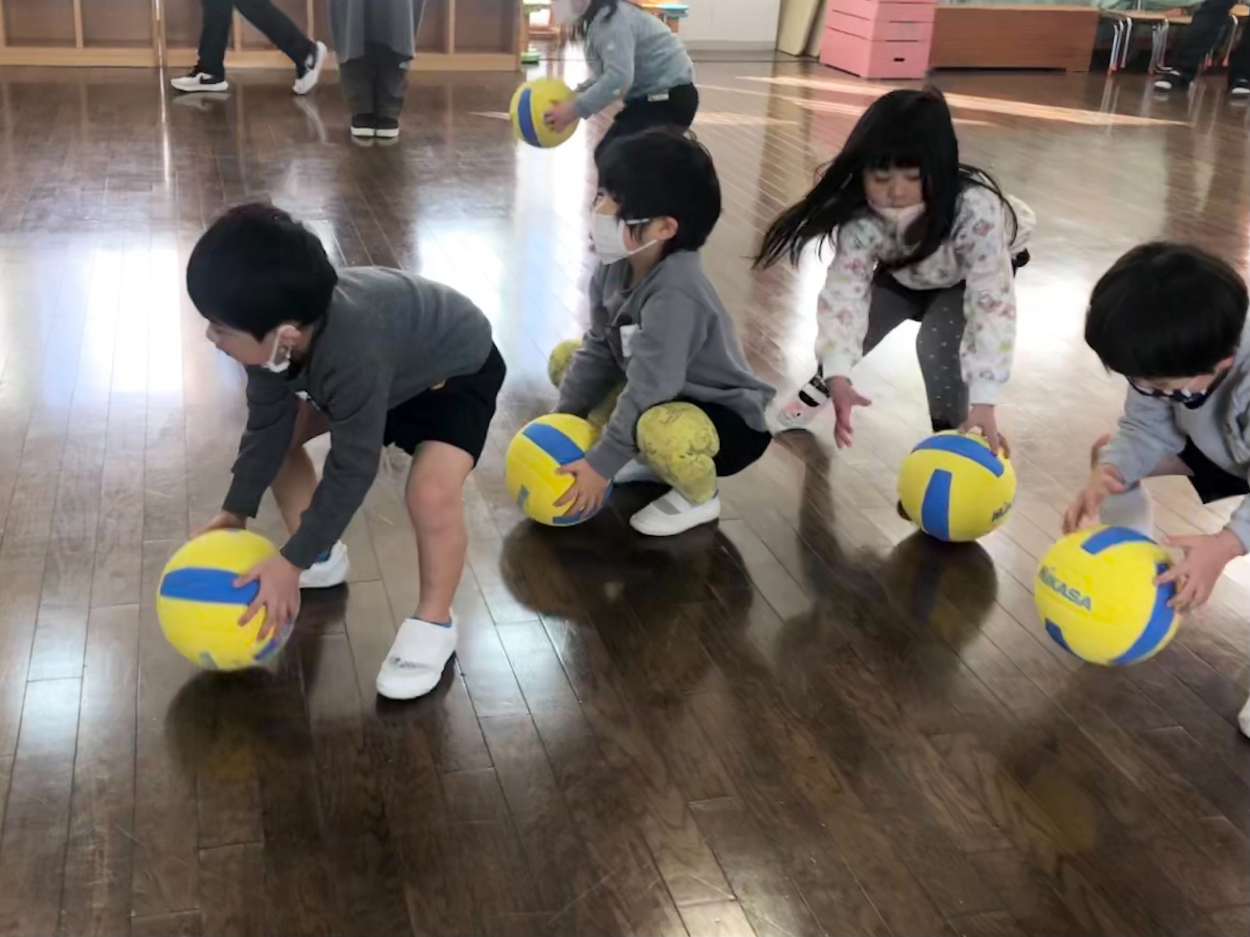 先生の身体の動きを真似したり、ボールを投げてキャッチしたり、タッチされないように上手に走って逃げたり…