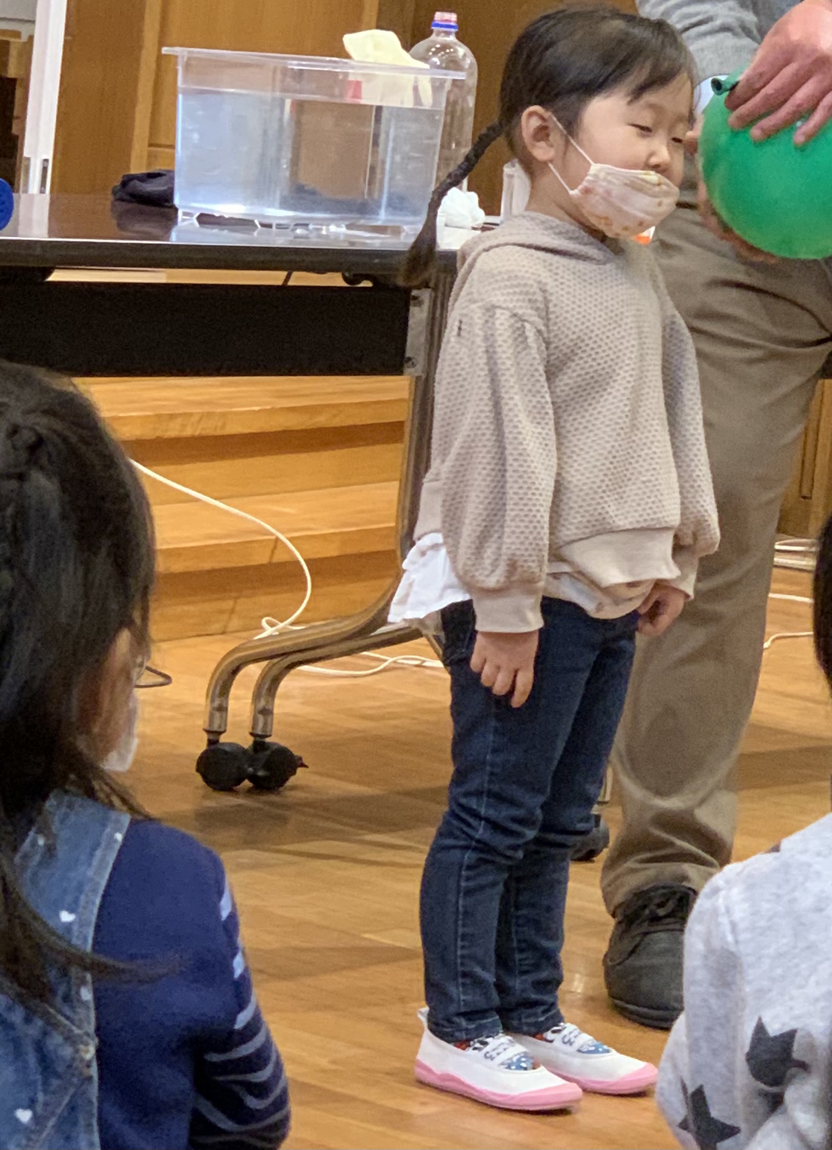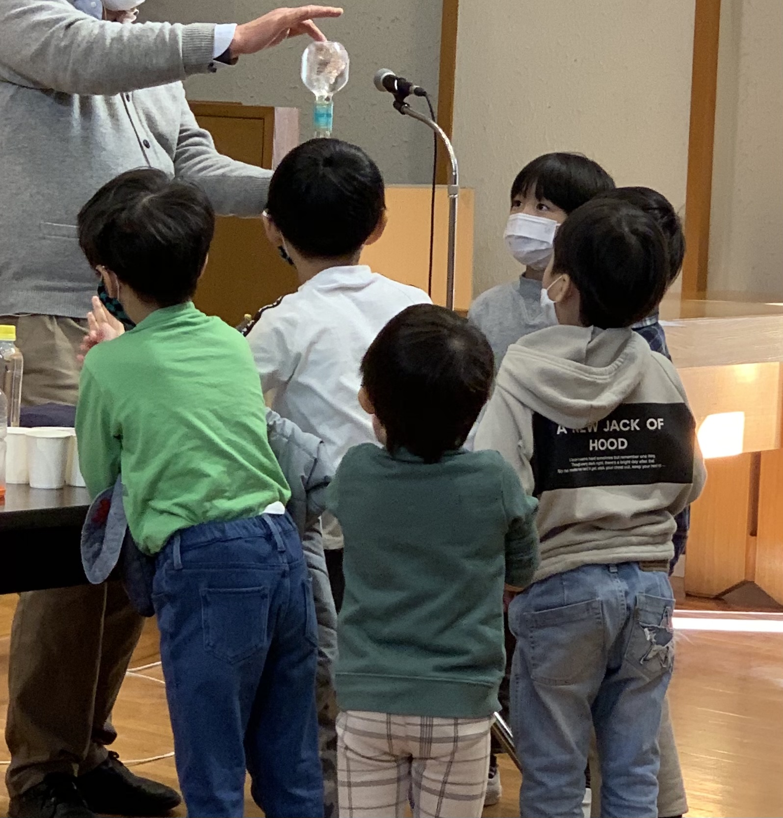 今日は、麻布科学実験所教室の阿部先生がいらしてくださいました。ペットボトルや風船など、身の回りの物を使っての不思議をたくさん経験することが出来、よく見て・よく聞いて、色々感じることのできる貴重な時間となりました。