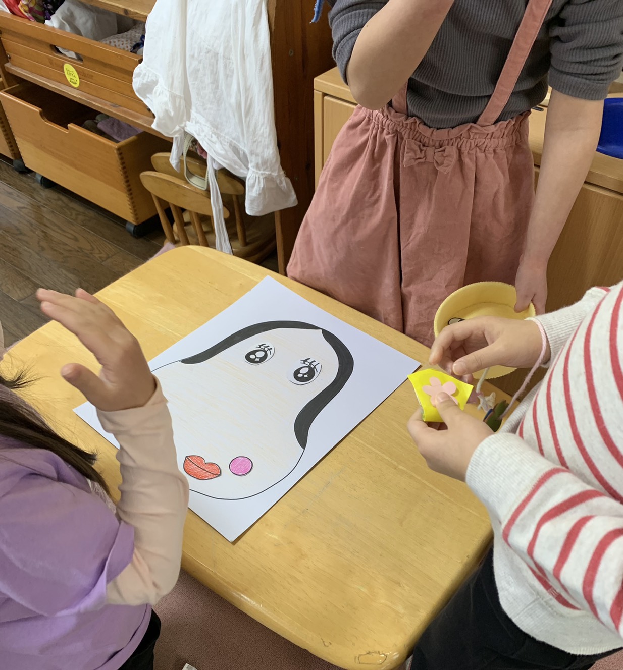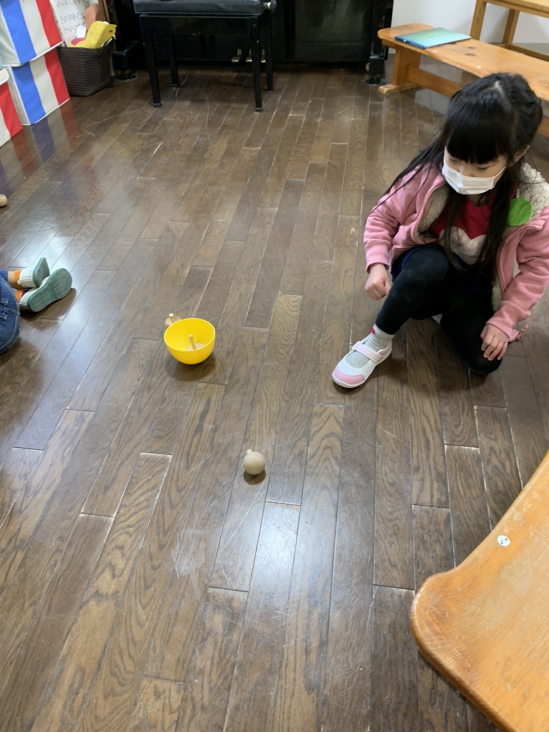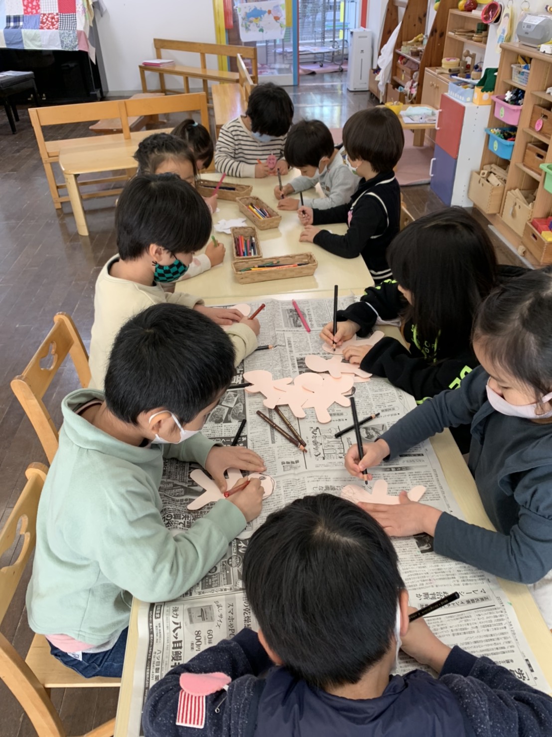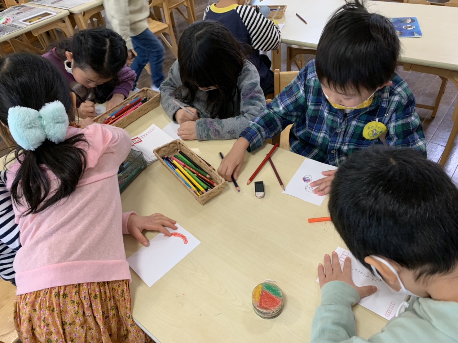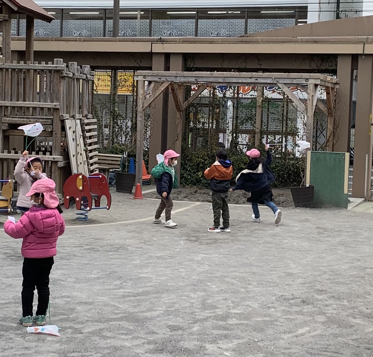 年長さくら組ではお正月遊びを楽しんでいます。年賀状ごっこ、コマ回し、福笑い。。。たこあげは、とても楽しいようです。寒さに負けず、元気に遊びましょうね。