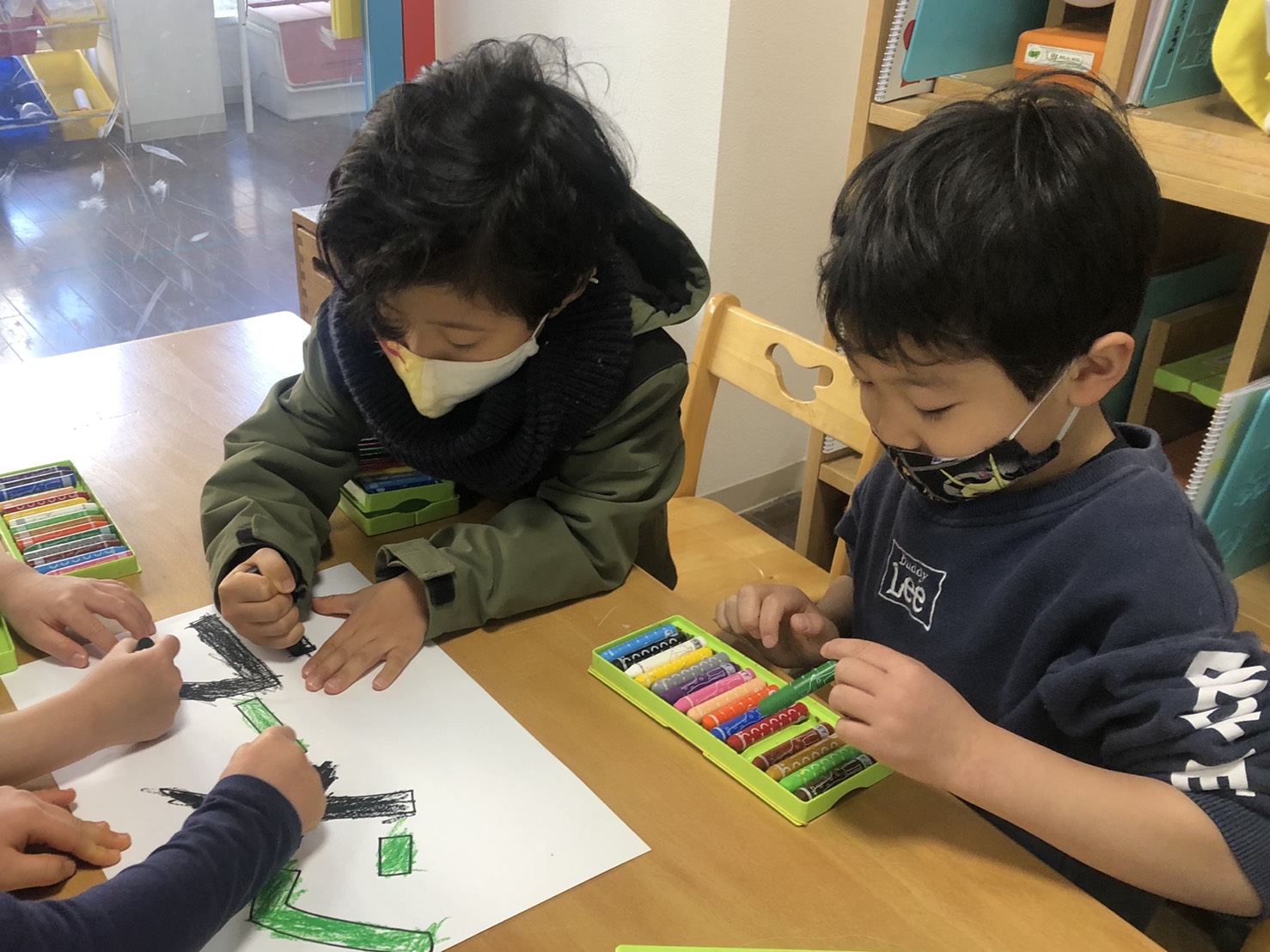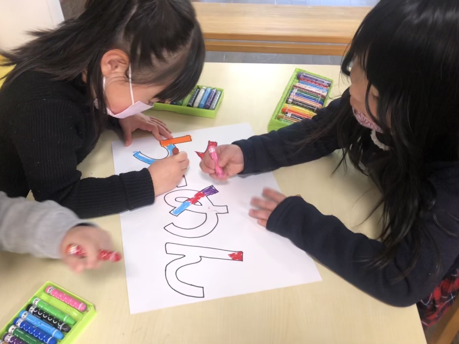 文字にクレヨンで色を塗り、周りに絵を描きました。