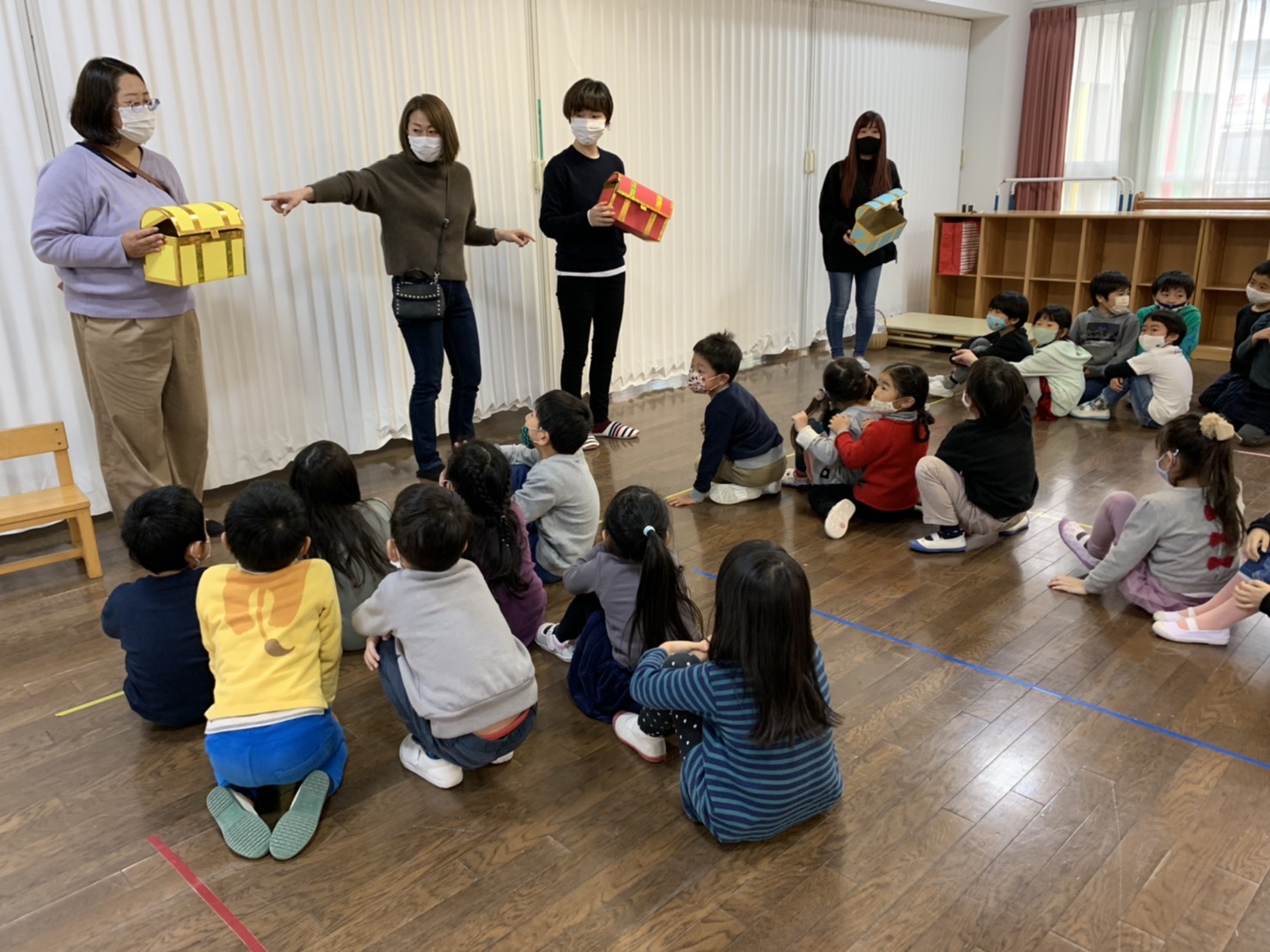 年長組のお母さま方企画、お楽しみ会は…宝箱に探した宝を集めるゲームをしました。