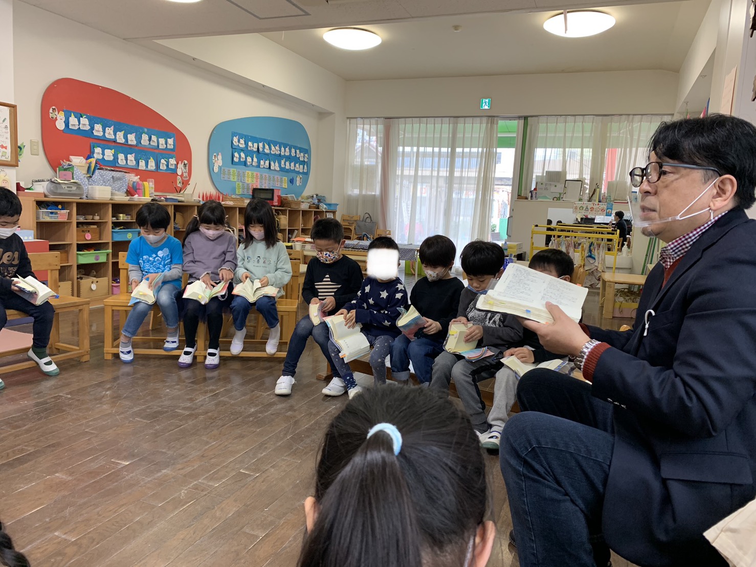 年長さくら組では、聖書を開く時間を園長先生と持ちました。