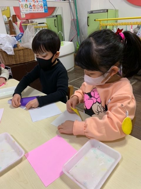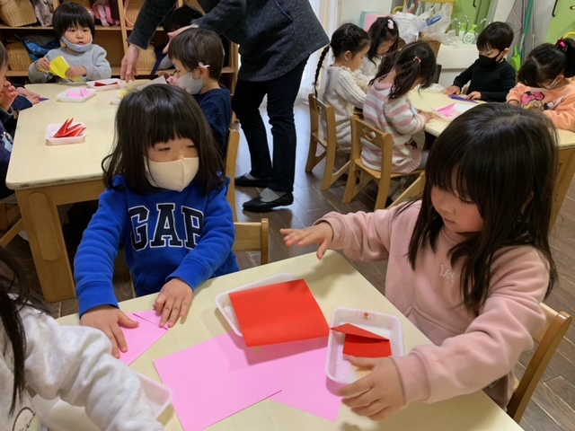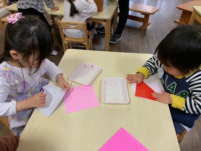 今年度は、6月からのスタートでしたが、、、ゆり組でたくさんの作品を作りました。今日は、1年間の作品を入れるあゆみの袋に貼るチューリップを折りました。