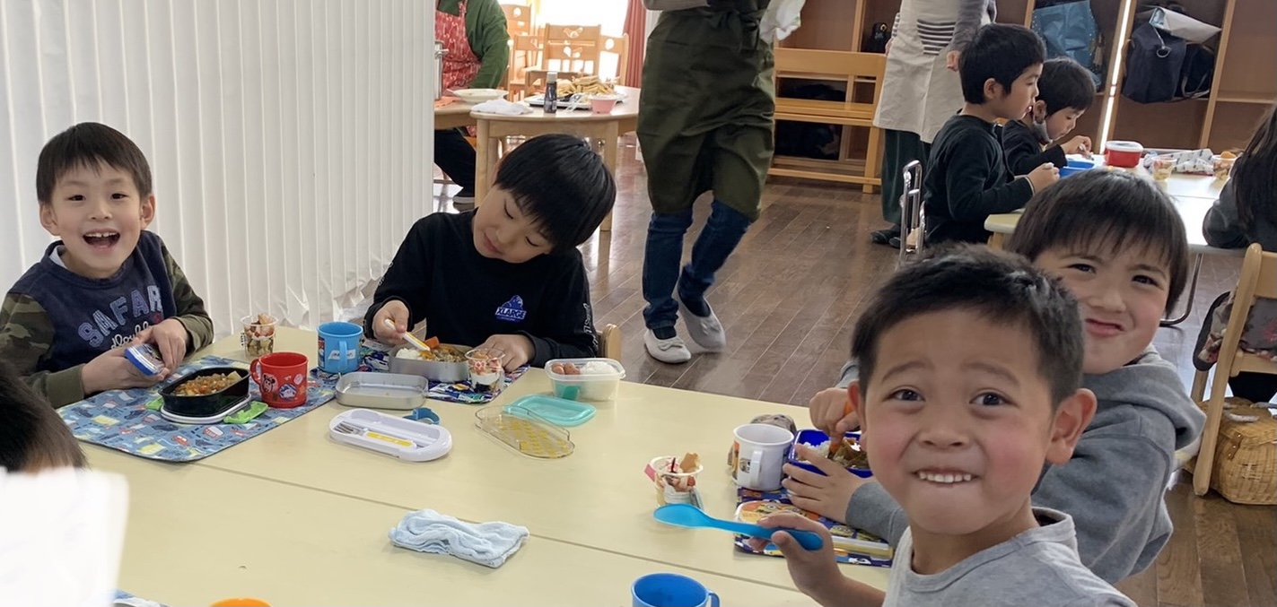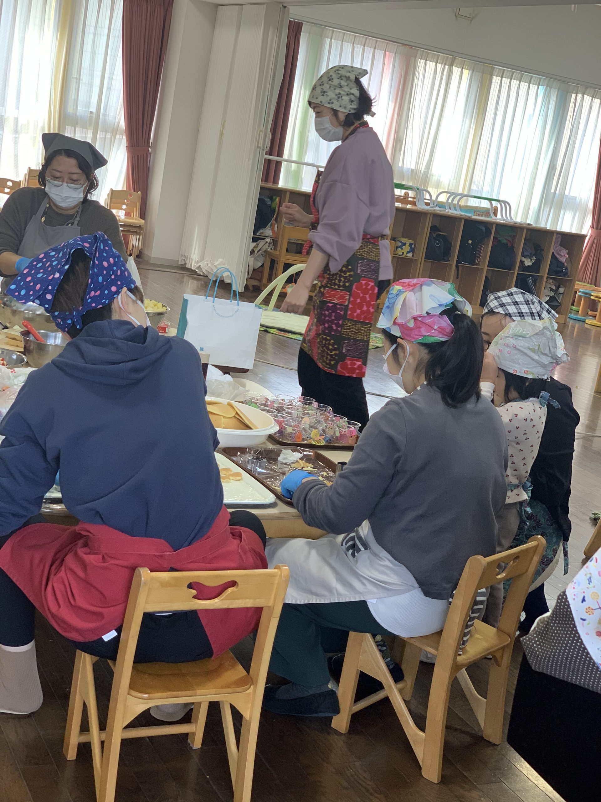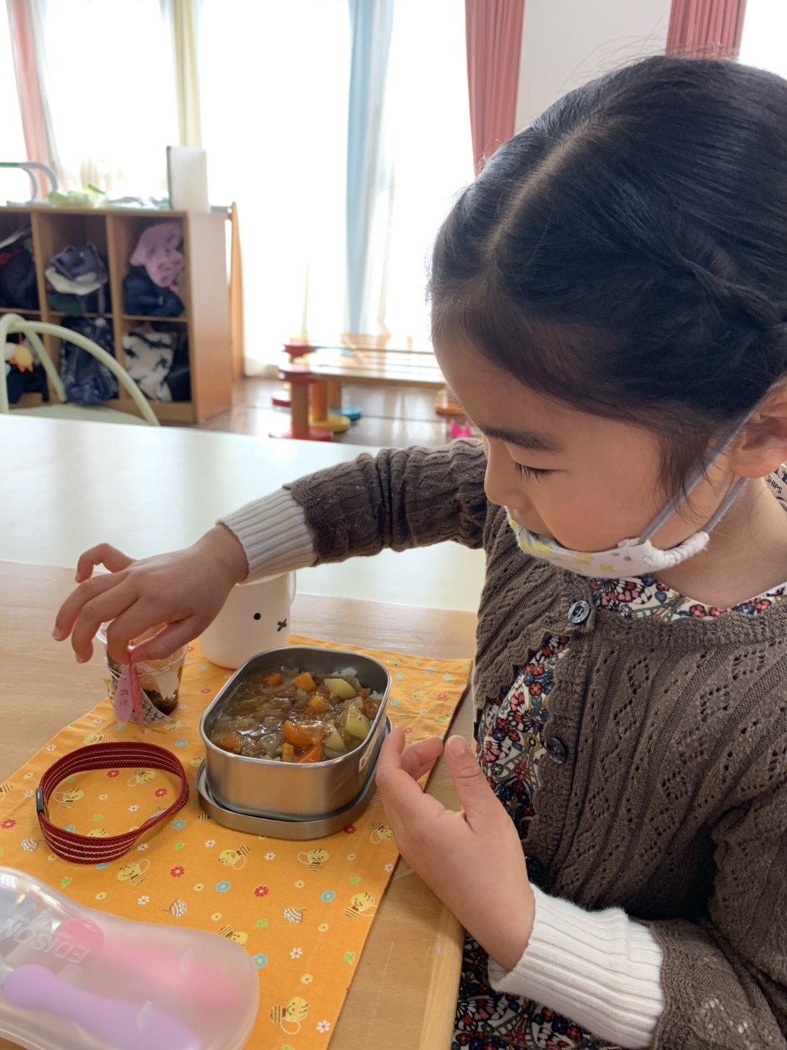 今日は今年度最後の親子会食でした。年長組のおうちの方が美味しいカレーを作って下さいました。デザートはかわいいデコレーションパンケーキ!プレゼントのキーホルダーも付いていました。うれしかったですね。おうちの方々、ありがとうございました!