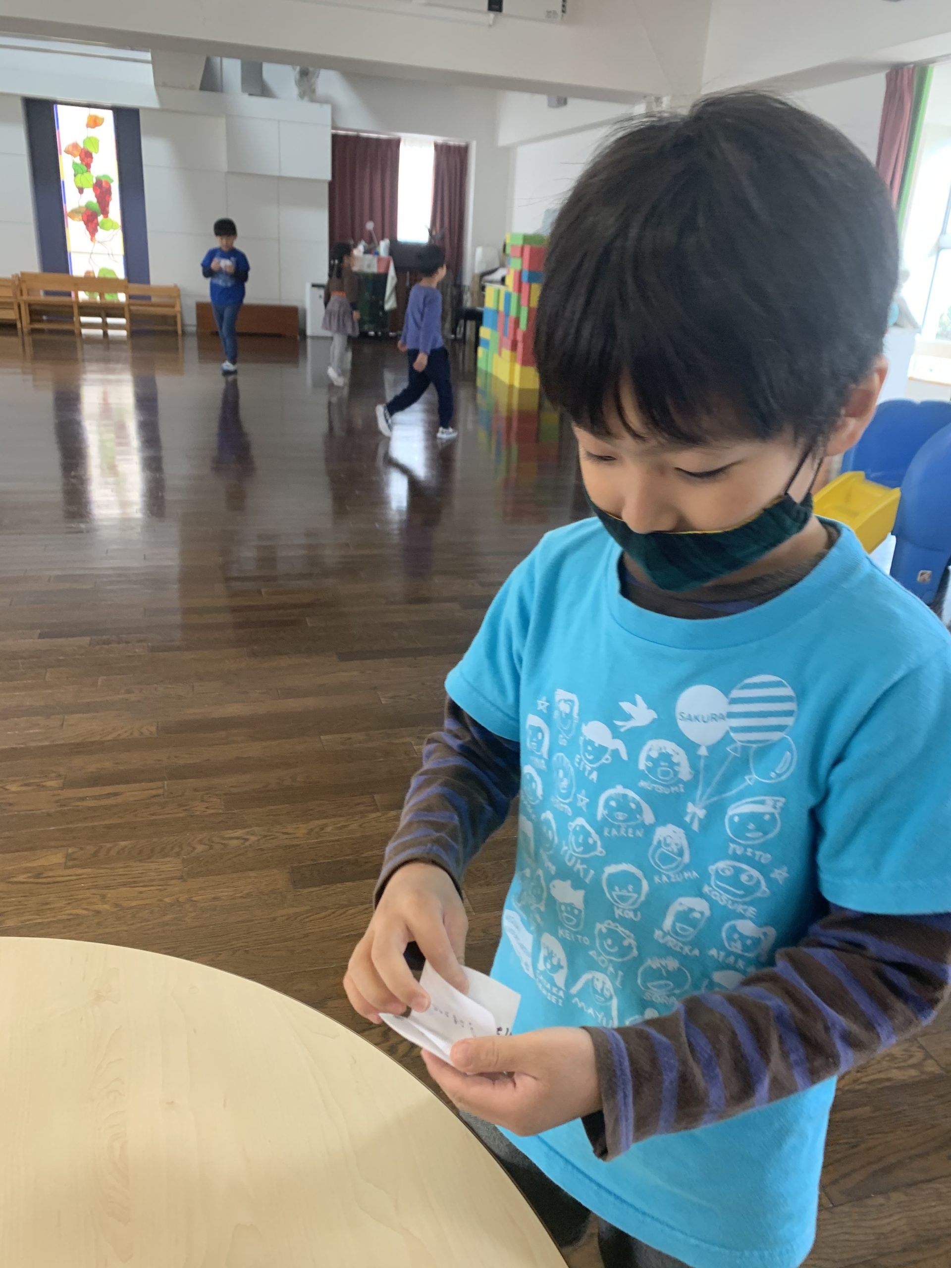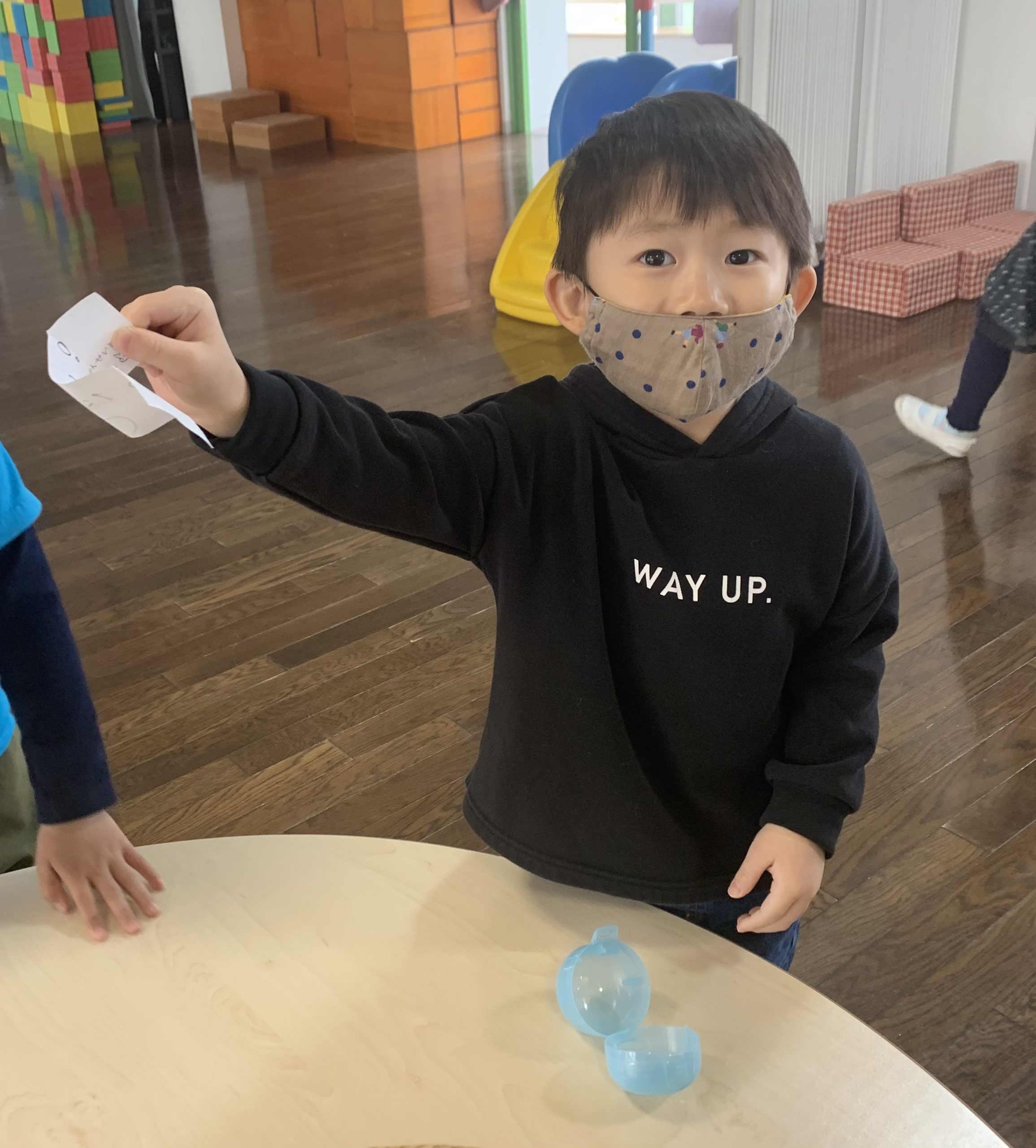 幼稚園を全部使って、宝探しをしました。カプセルを見つけて開けると、ミッションが書かれた紙が入っており、それをクリアすると宝物がもらえます。みんな張り切ってカプセルを探していました!宝物は名前入りのバッジでした。好きなところに付けて、幼稚園のことを思い出してくれるとうれしいです。