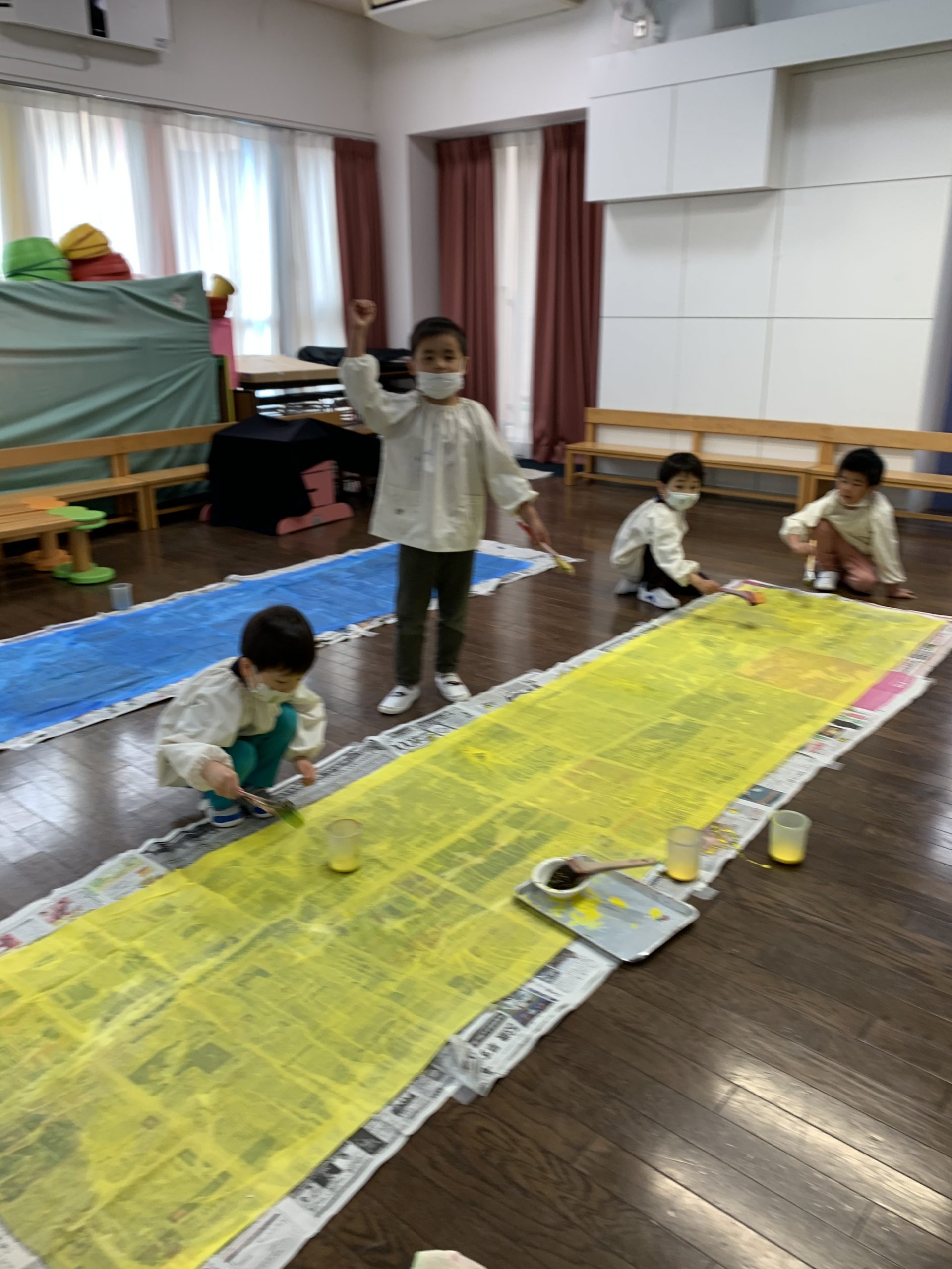 さくら組は、屋根より高い大きなこいのぼりを作ります!水曜日には、はけを使って、大きなこいのぼりのからだの色塗りをしました。