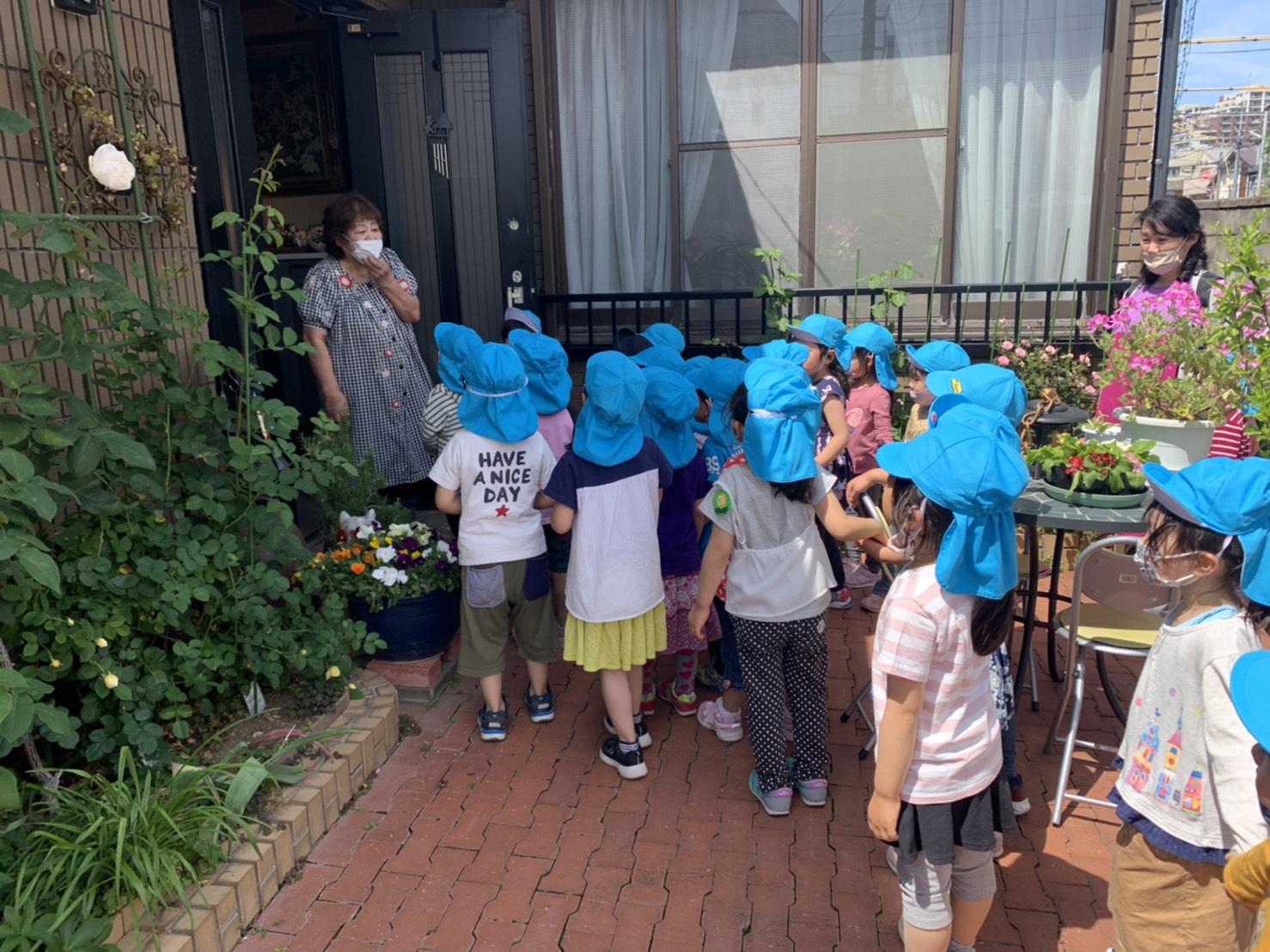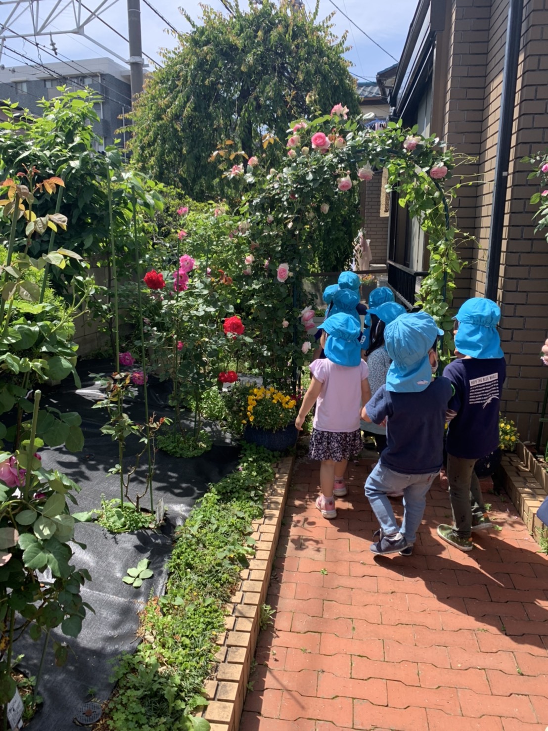 気持ちのよい天候の中、年中たんぽぽ組はおさんぽに出かけました。公園へ向かう途中、以前、園長をされていた先生のお宅へ。とても素敵なバラがたくさん咲いていました!子どもたちはバラ園の中へ。。。!