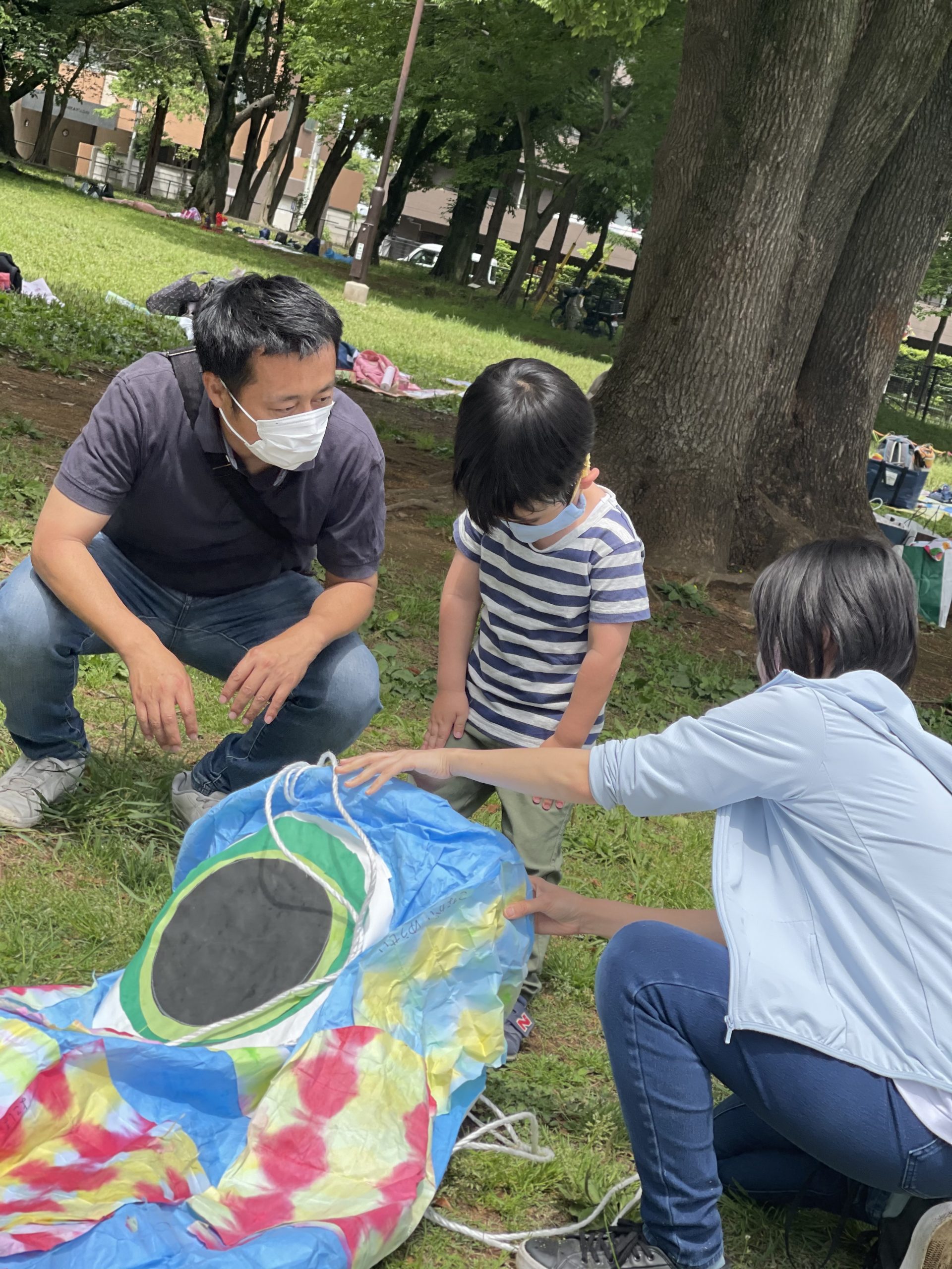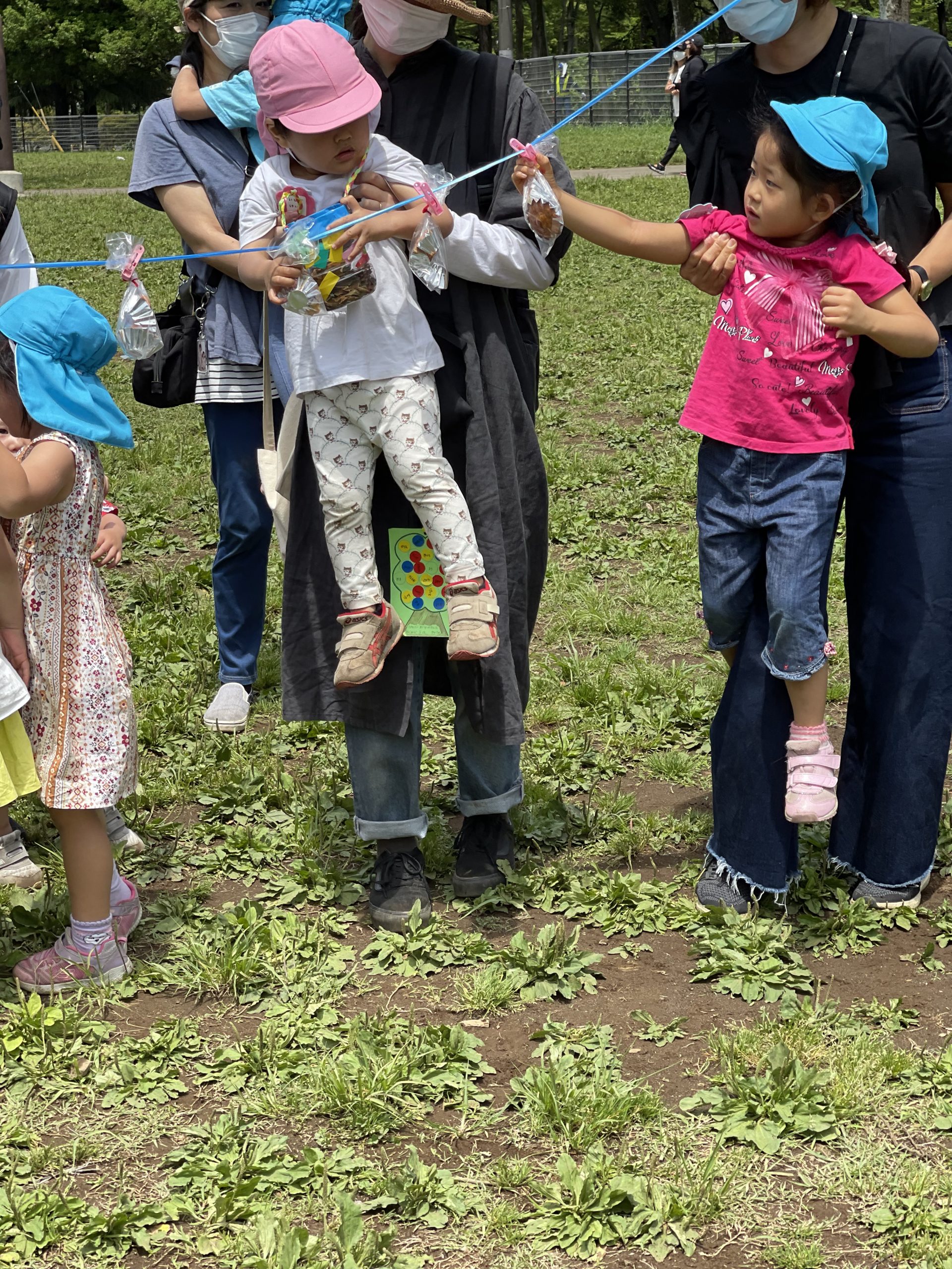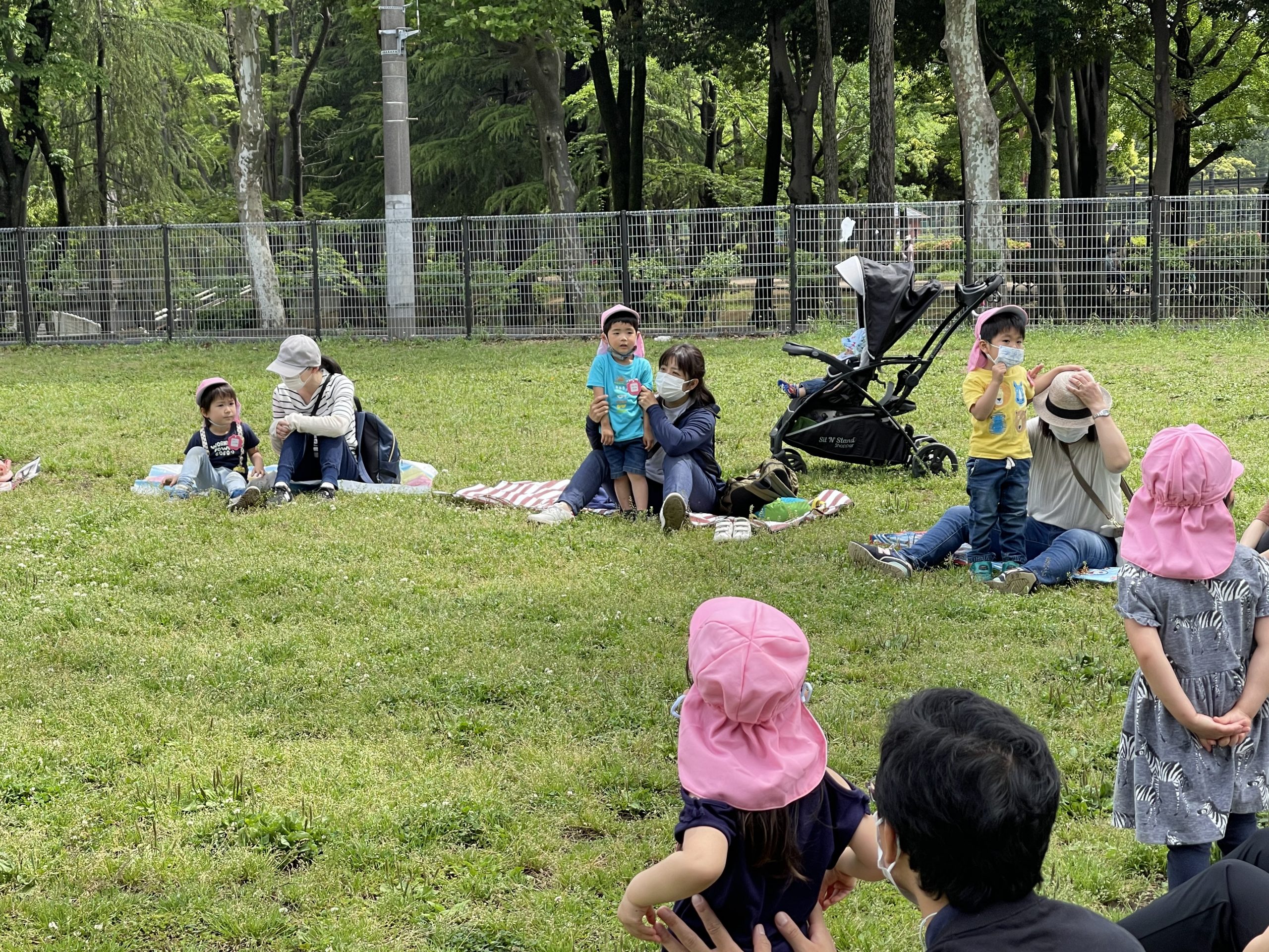 自己紹介ゲームやでかぱん競争・飛行機を作って飛ばしたり、広い公園内、広い空の下…気持ちの良い自然を全身で感じながら、お友だちやおうちの方・先生方で楽しむことができました。