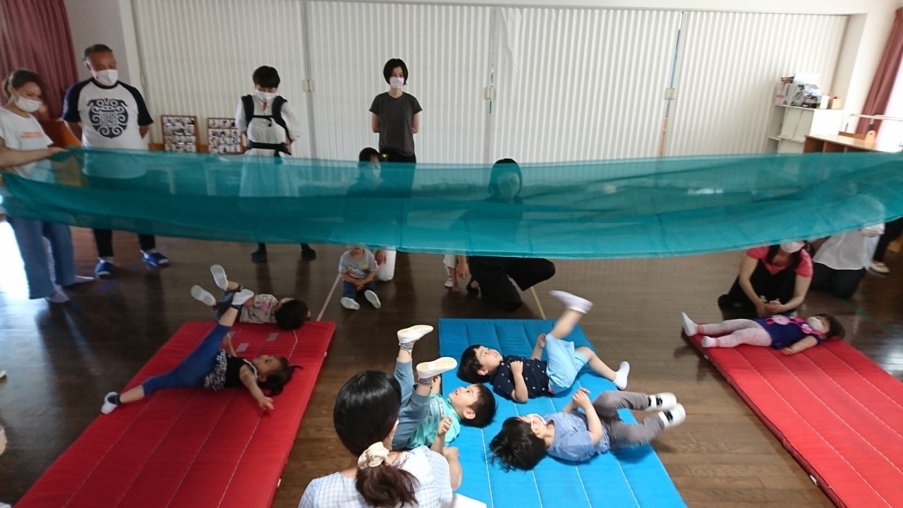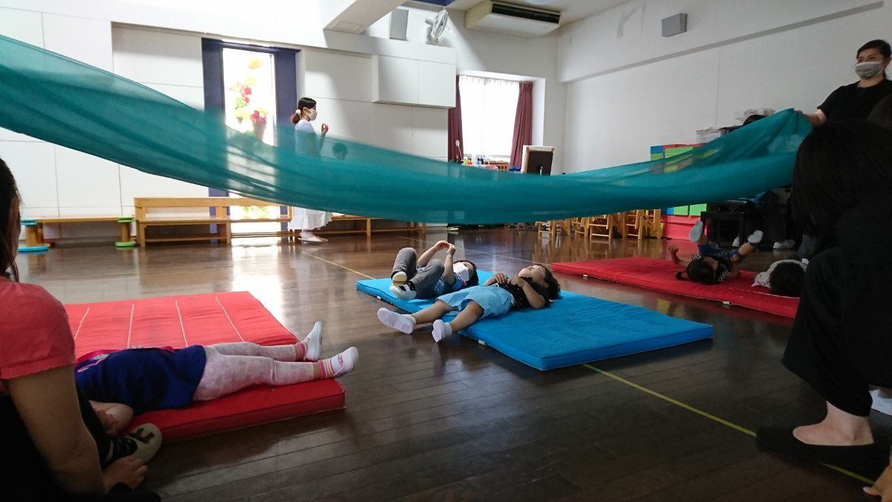 ガタゴト電車、楽器遊びを楽しんだ後は、マットに寝転んで大きな布がゆらめく様子を見ました。