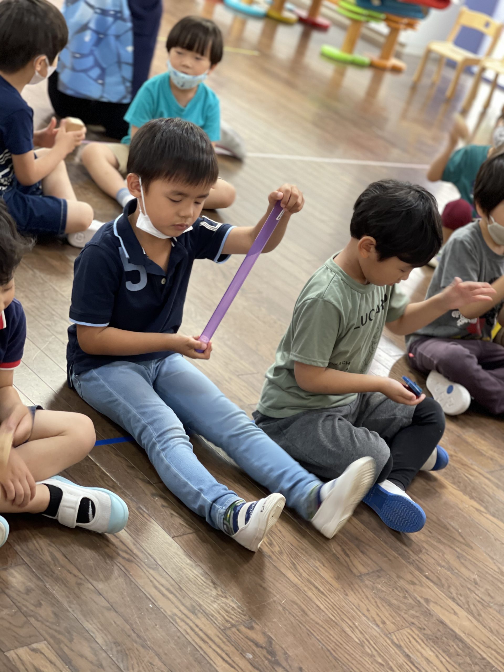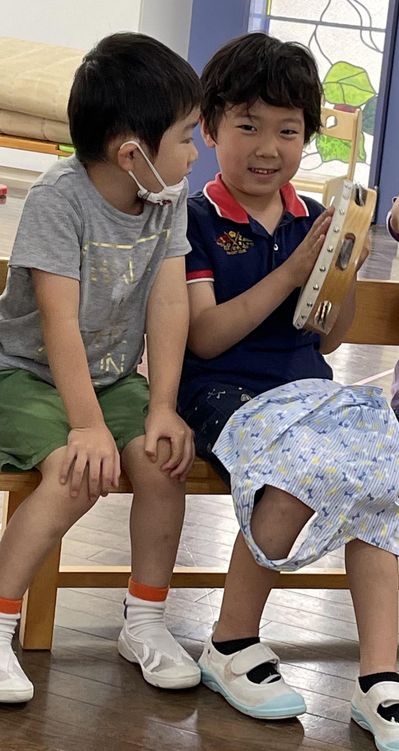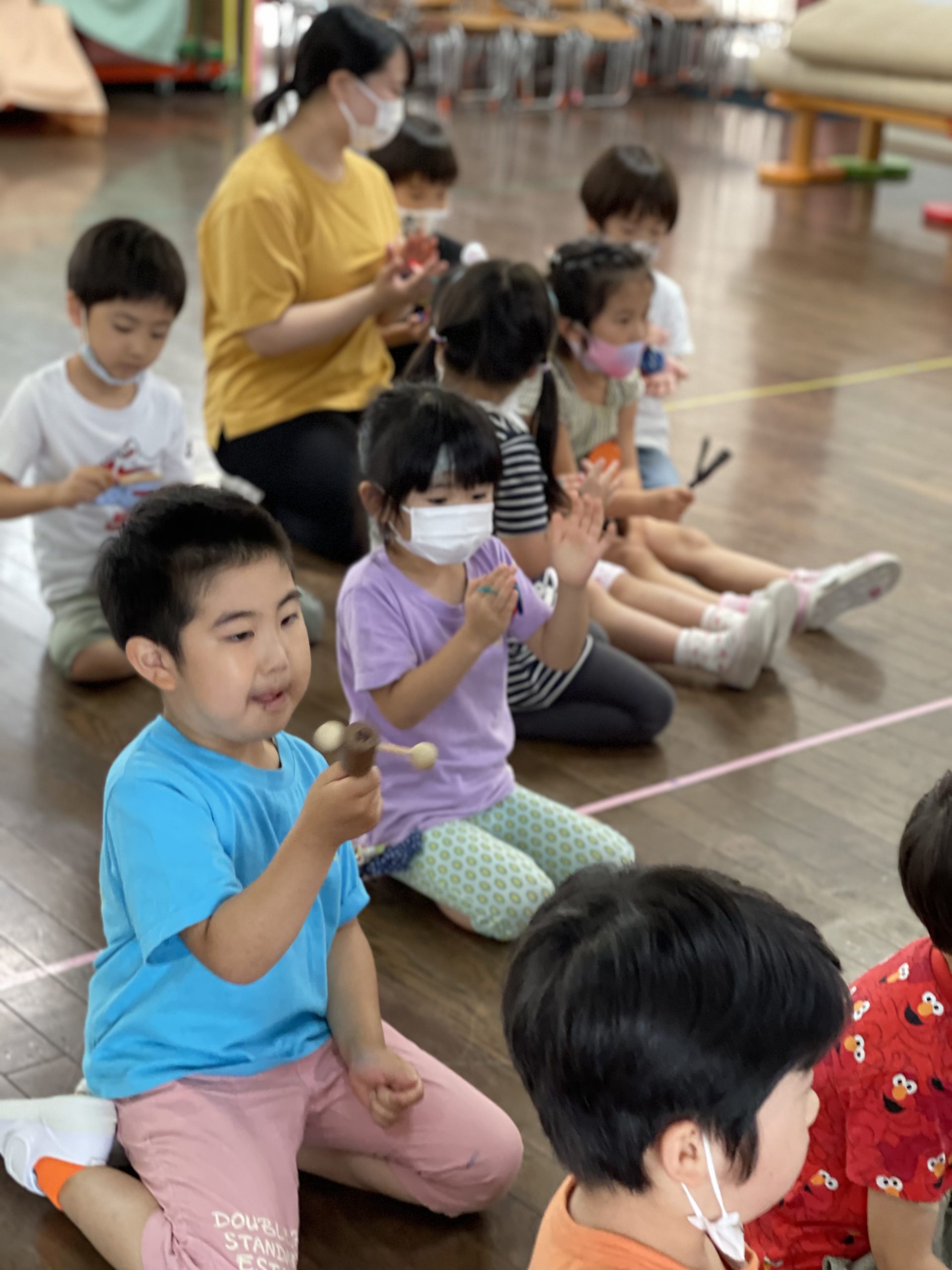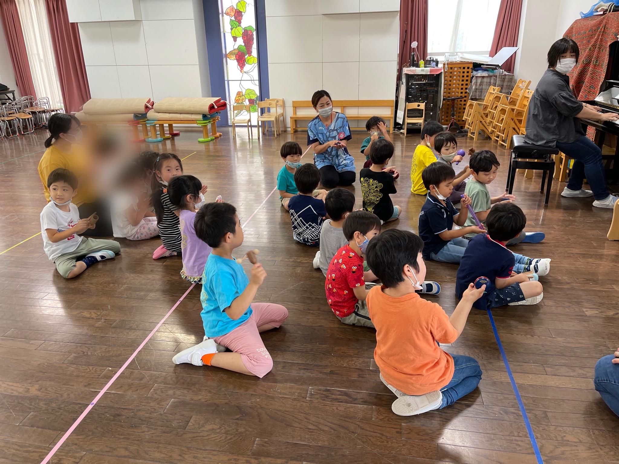 音楽あそび…。 今日のひとこま 2021.05.31 今日は、ホールではじめての音楽遊びでした。楽器の入った袋をピアノの音色に合わせてお友だちに回してみたり、マットに寝転がり、ゆらゆら揺れる布を眺めたり、楽器で自由に演奏しました。楽しかったですね♪ 何が出来るかな???