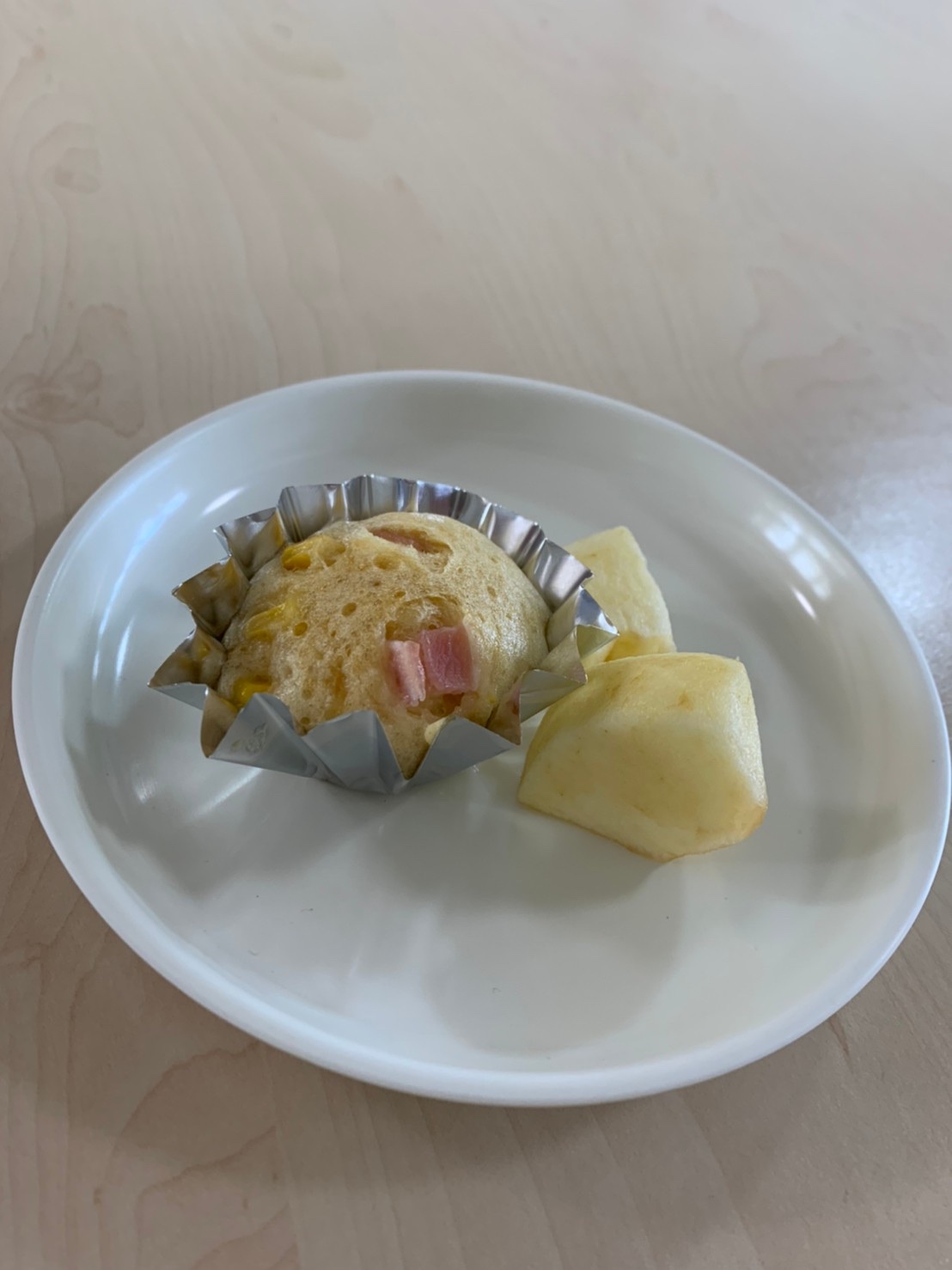 今日はハムとコーンの蒸しパンとりんごをいただきました。