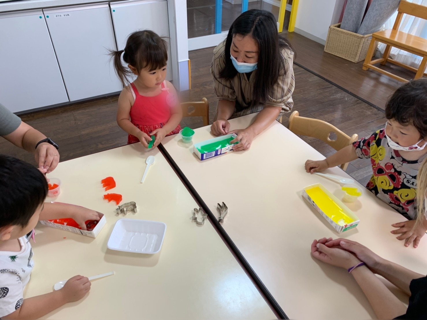 赤、青、黄、緑に色付けした綺麗な寒天を、スプーンですくってみたり型抜きをしてみたり。