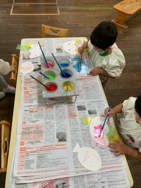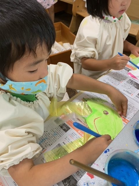 その後、魚とくらげに顔を描いて色を塗りました。可愛い魚とくらげが出来上がりました!