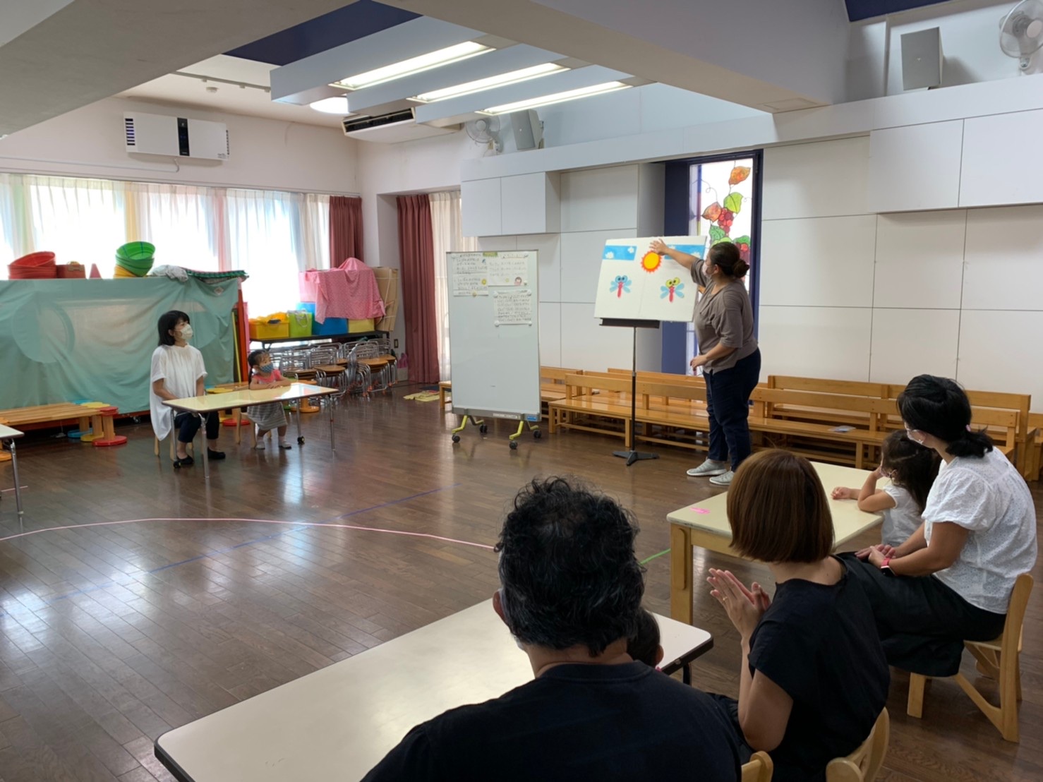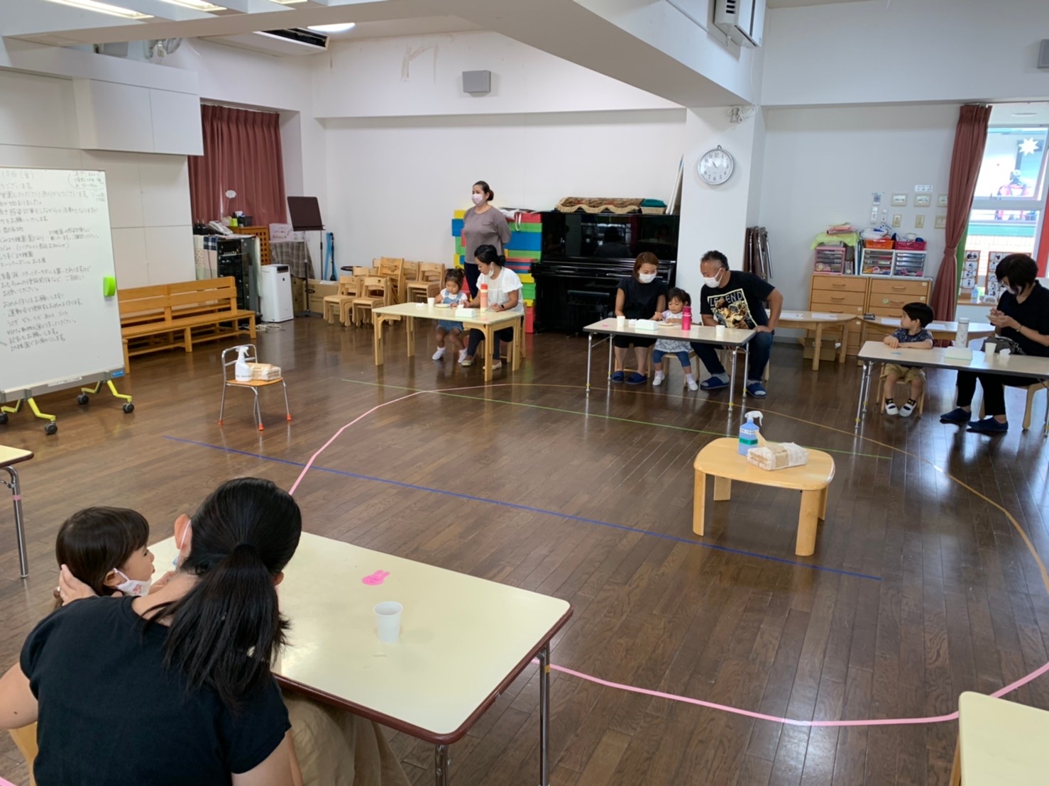 2学期からは、感染対策のために間隔を取りながら、親子で座って活動します。