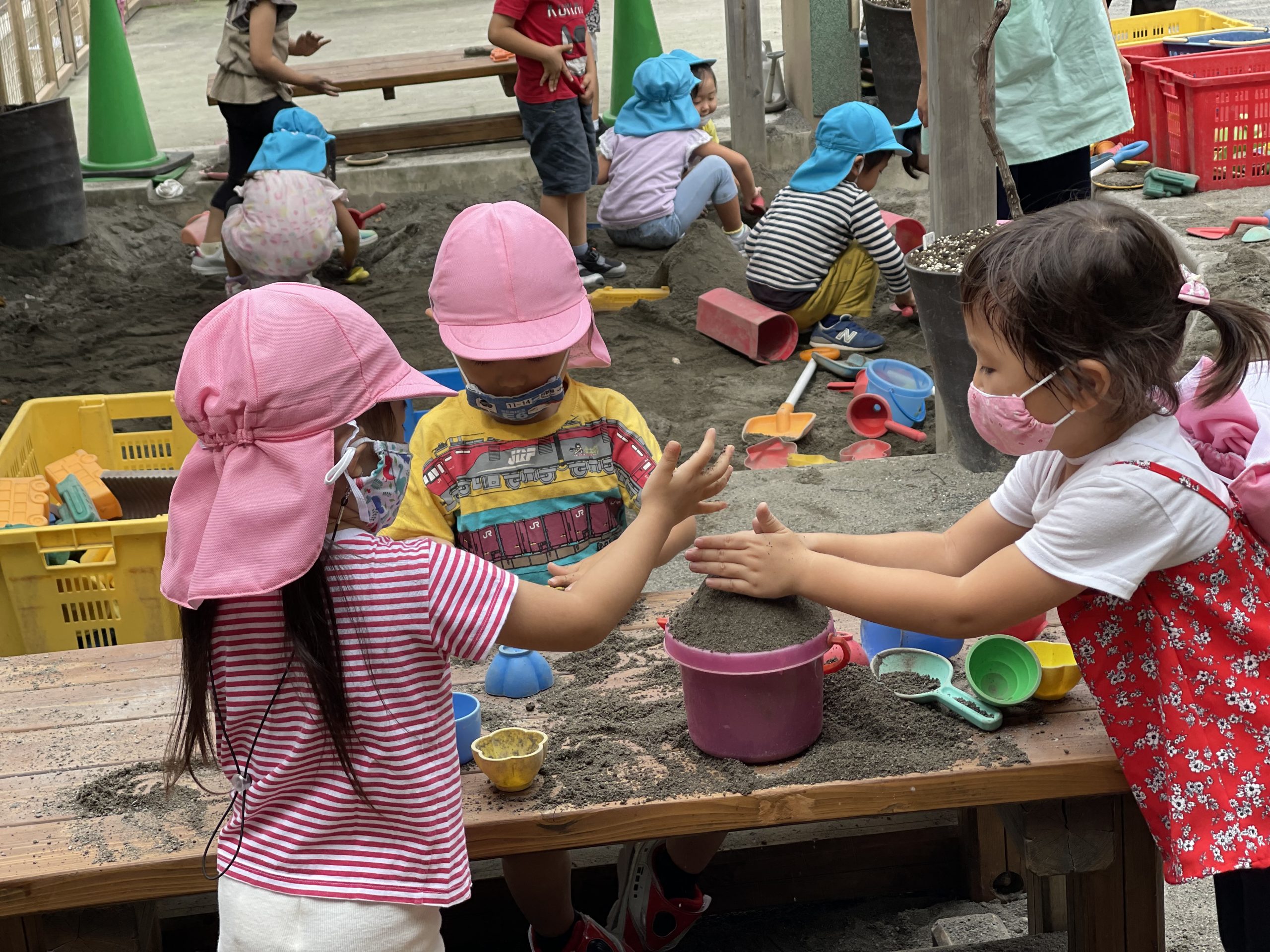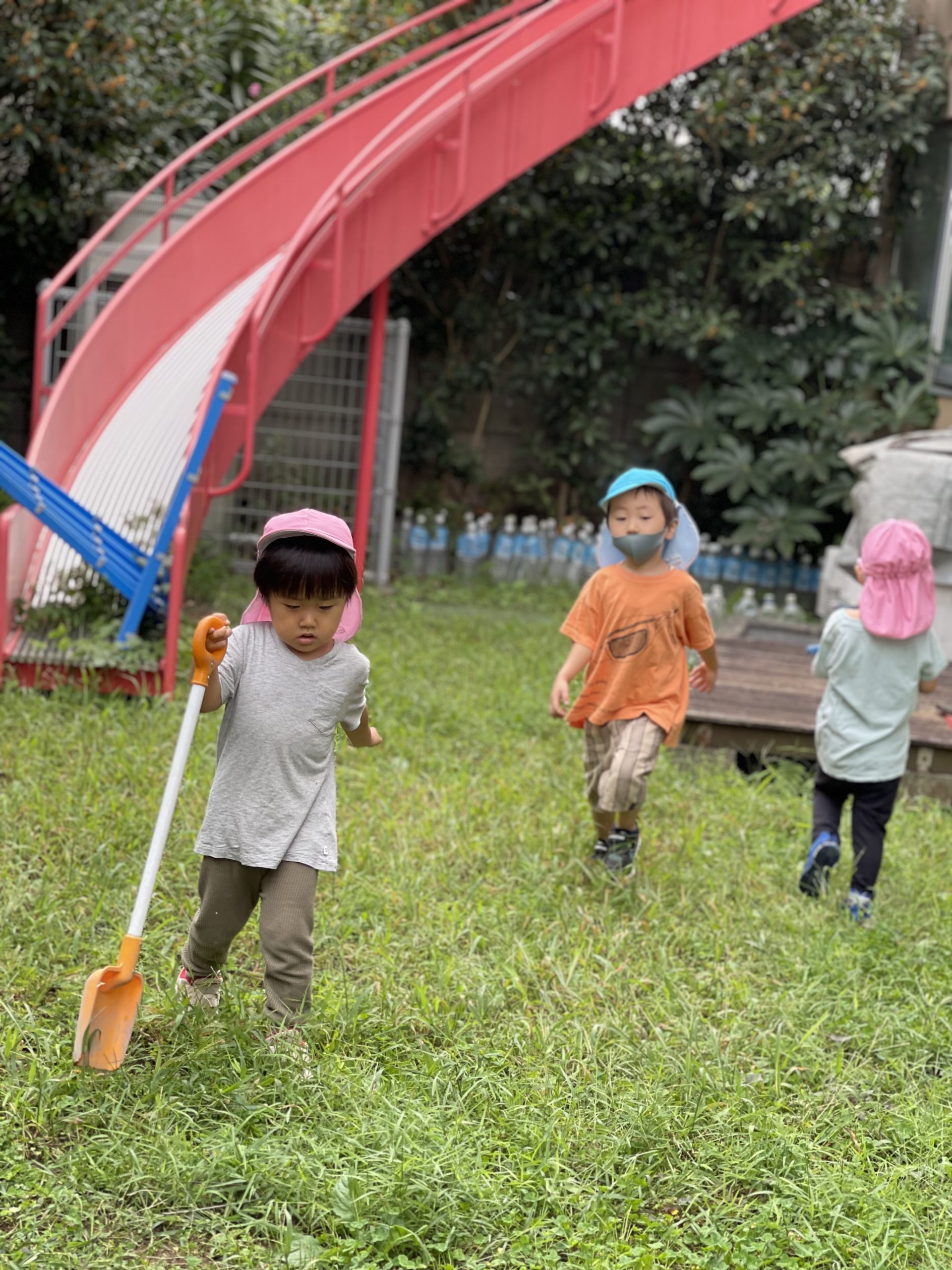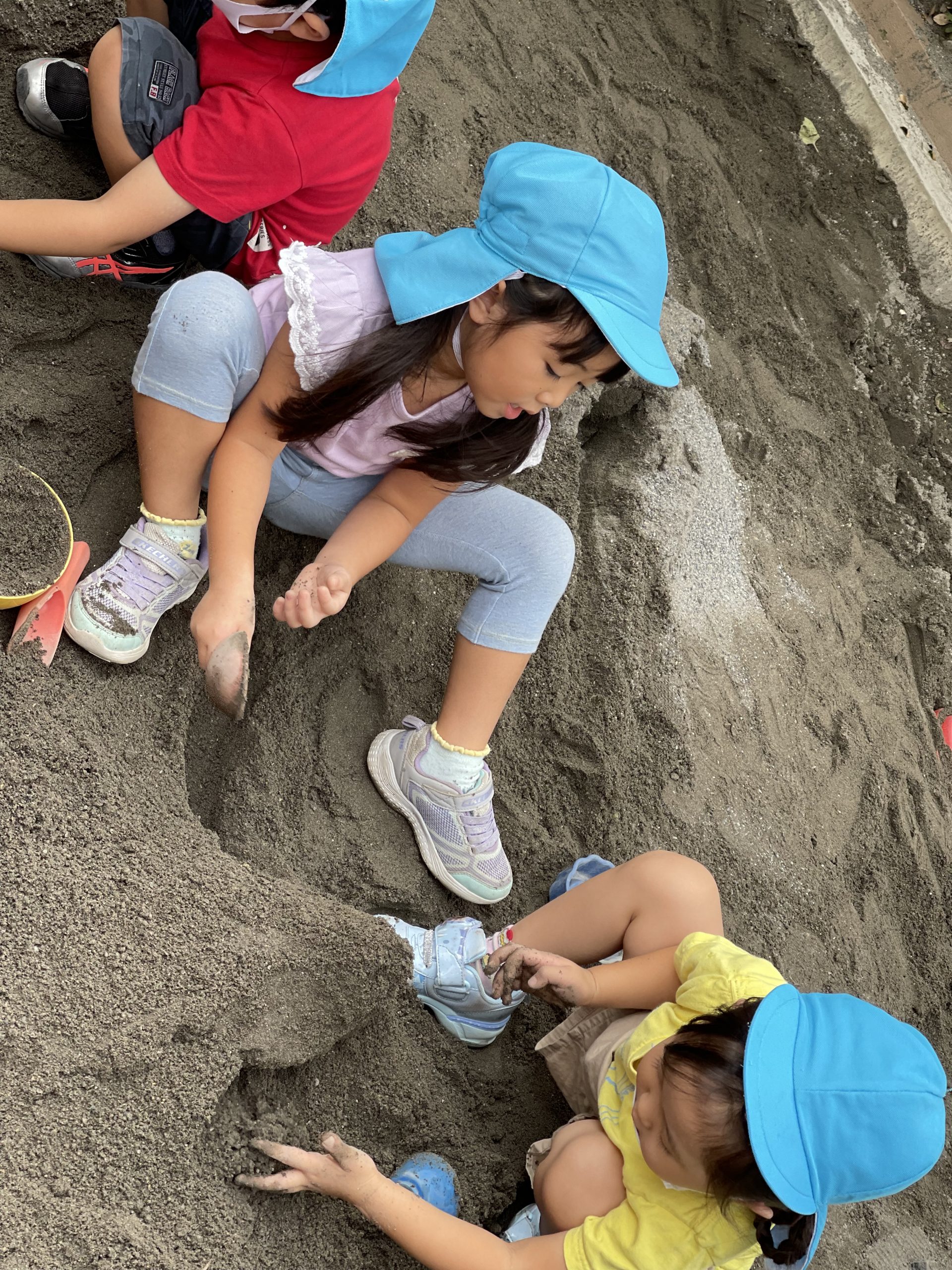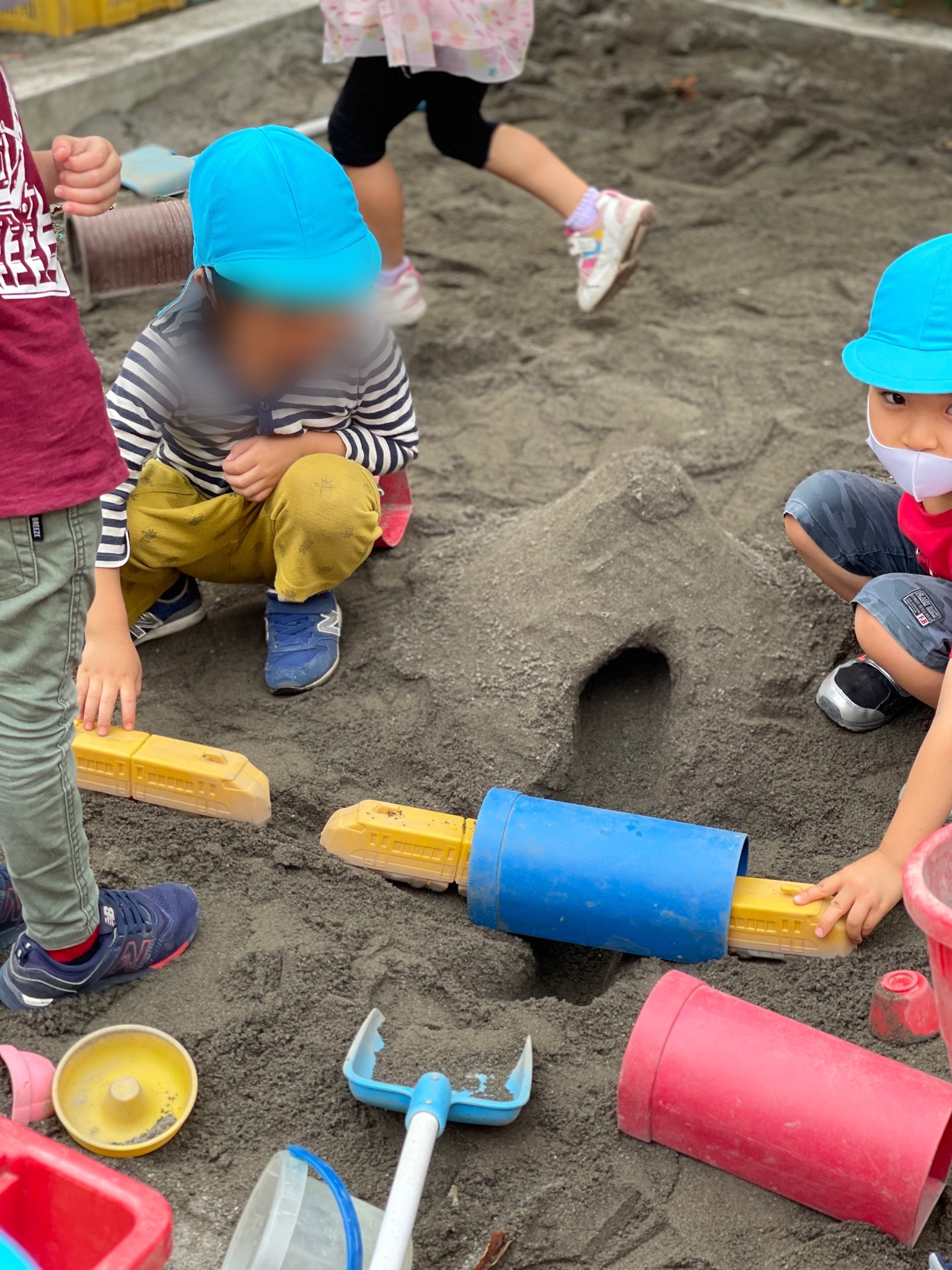 砂場では、シャベルを大小使い分けて、電車が通れるトンネルや山。美味しそうなお料理作りが繰り広げられています。
