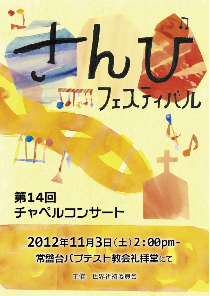 チャペルコンサート(11月3日)のご案内 お知らせ イベント 今日のひとこま 2012.10.29 教会の礼拝堂におきまして、チャペルコンサートが催されます。 幼稚園のスタッフと園児の皆さんで一緒に「かみさまといつもいっしょ」を歌います。 明るく楽しい会ですので、是非、おいで下さい。お待ちしております。