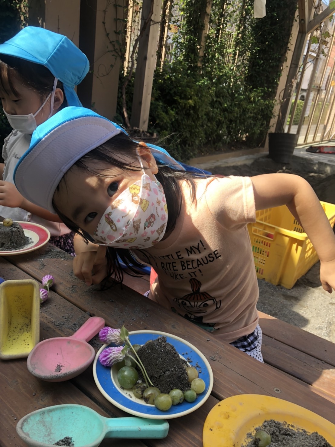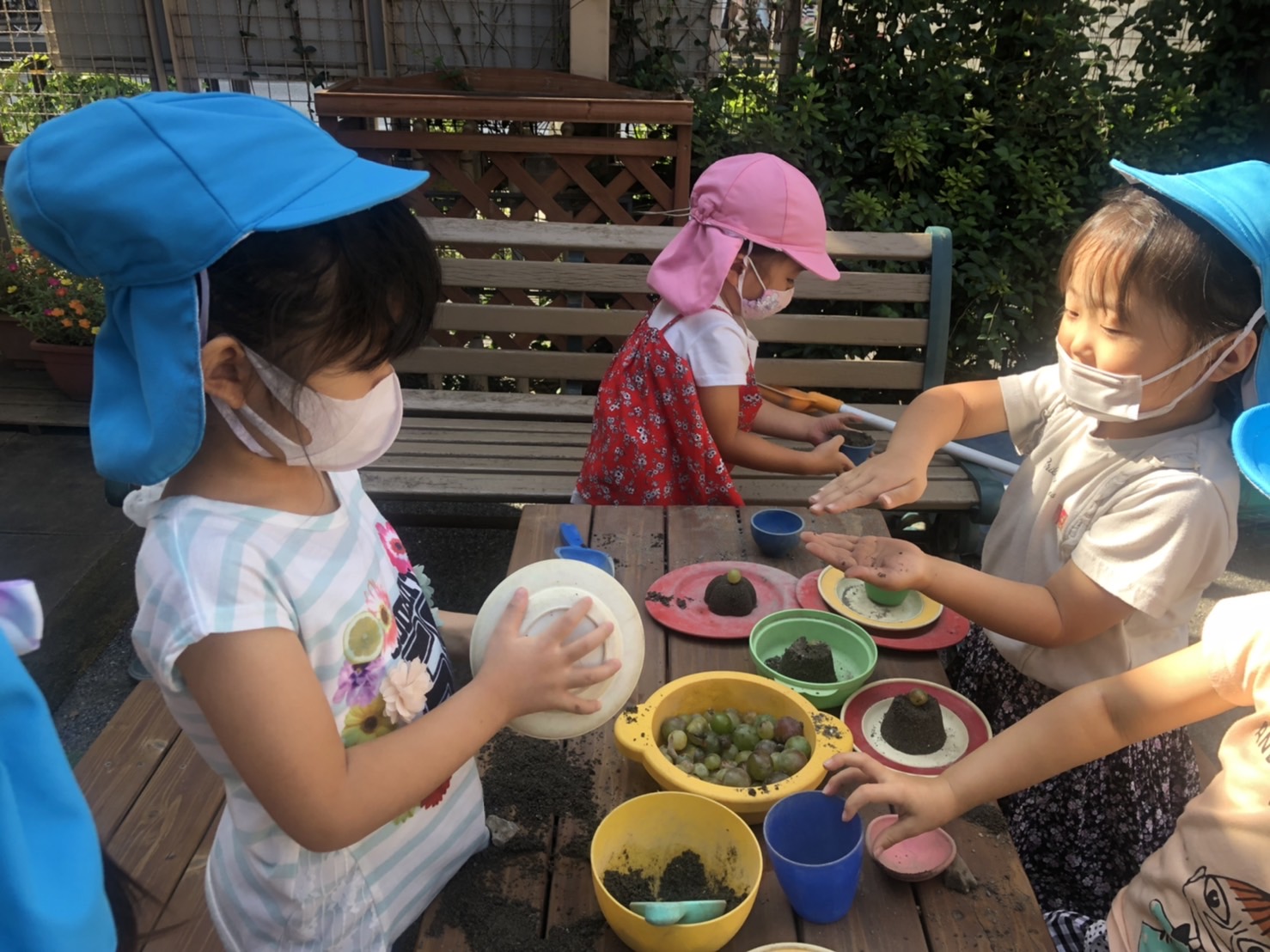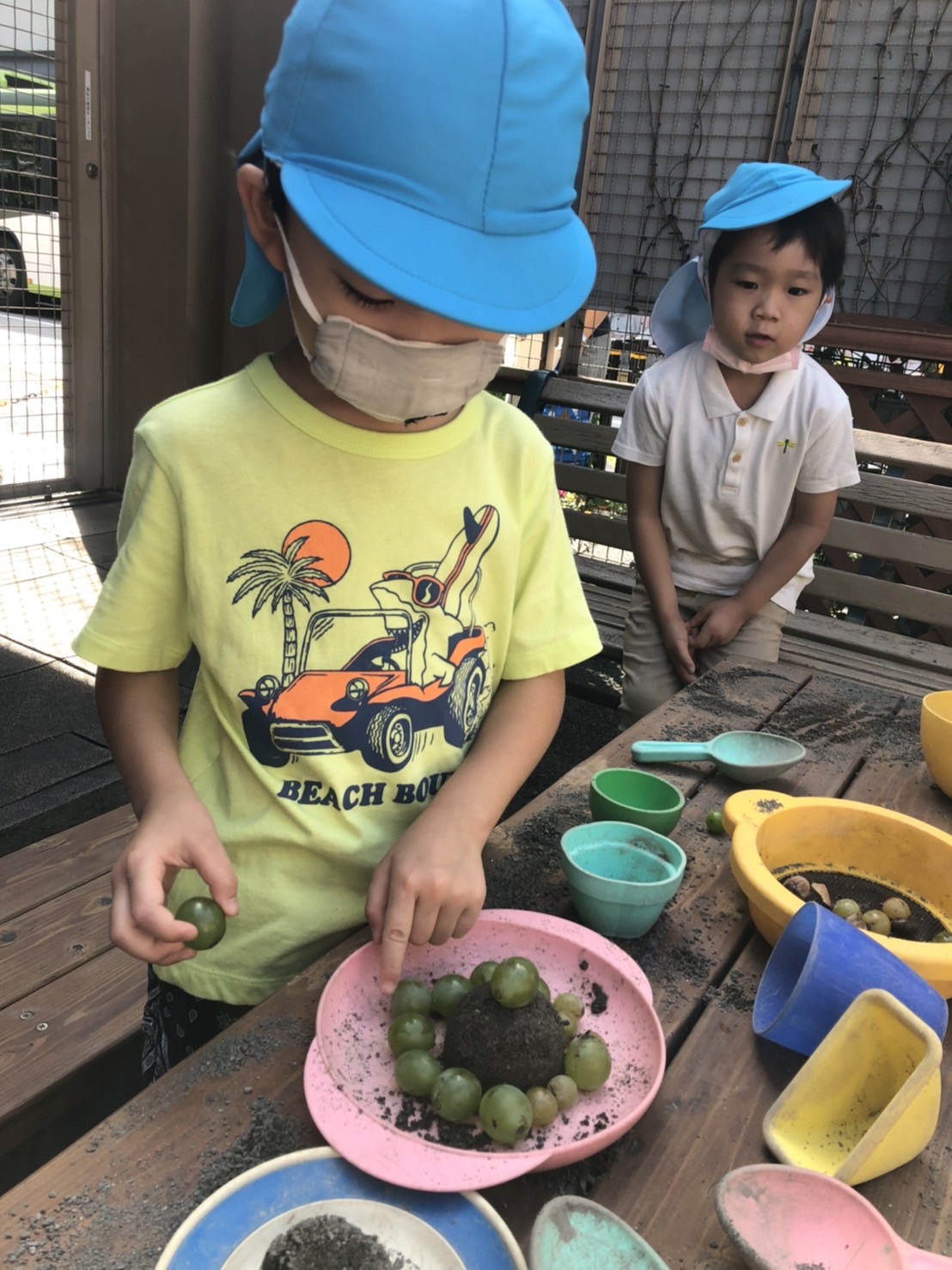 たくさんのお友達が、砂のケーキ・プリン作りをしていました。