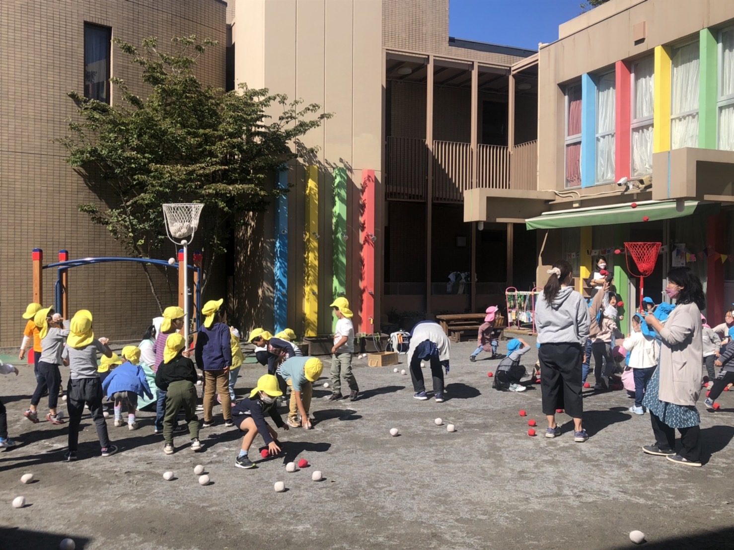 年長のさくら組は、かごを高くのばしてもたくさんの玉を入れていました。