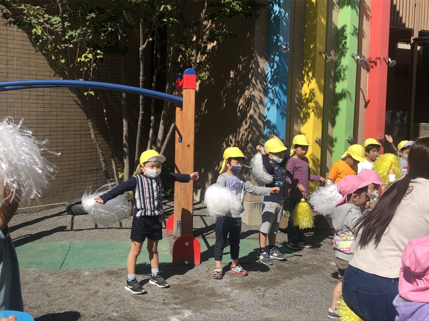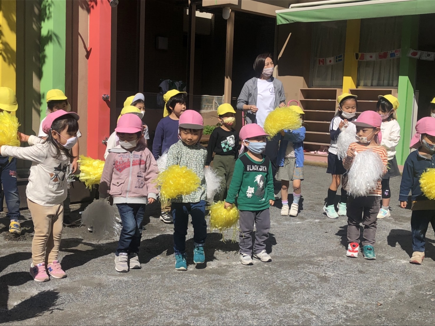 ぽんぽんを持ってダンスをしているところや、玉入れで玉を投げているところ、ゴールテープに向かって走っているところなど…