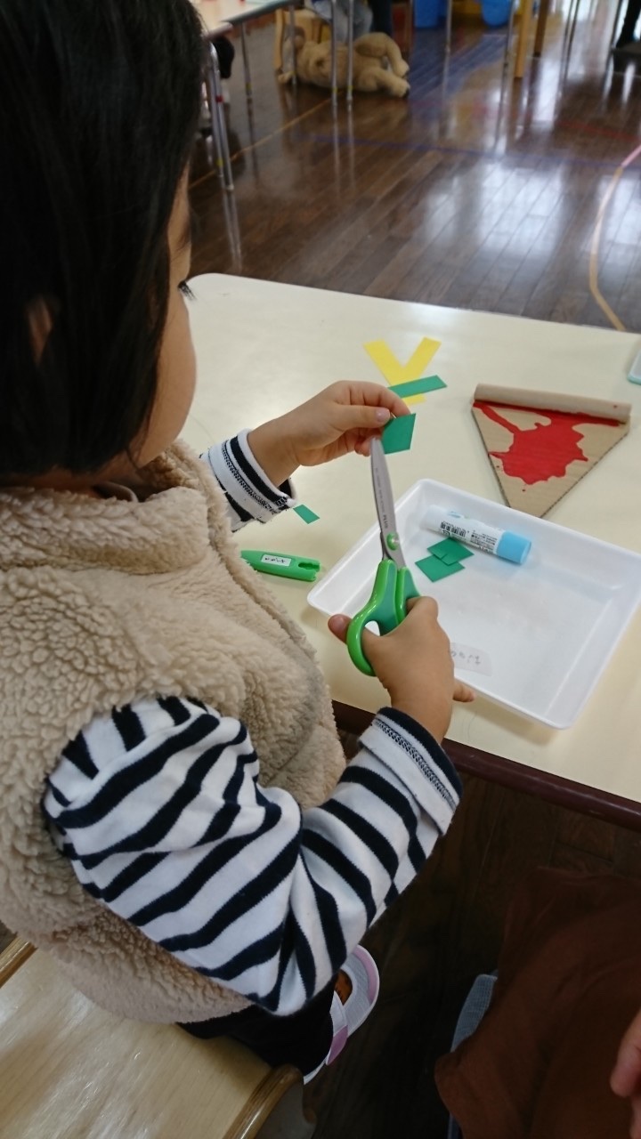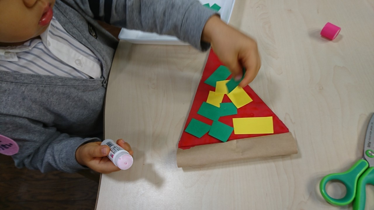 ピーマンとチーズのつもりの緑色と黄色の紙をチョキンと切って、のりで貼って、美味しそうなピザのできあがり!