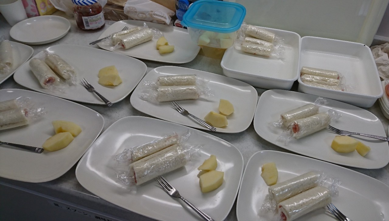 ハムのロールサンドとジャムのロールサンド、りんごをいただきました。