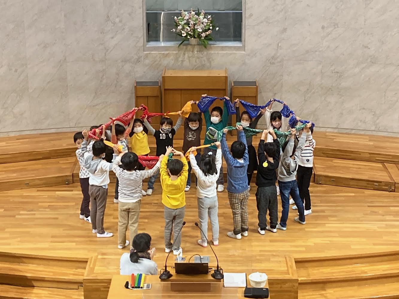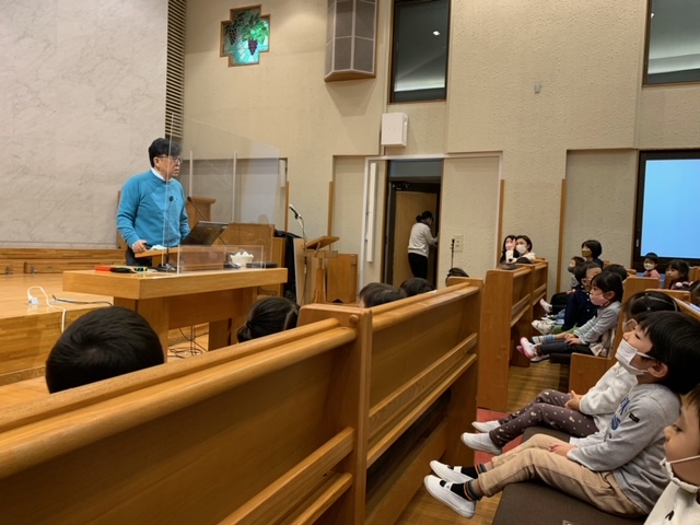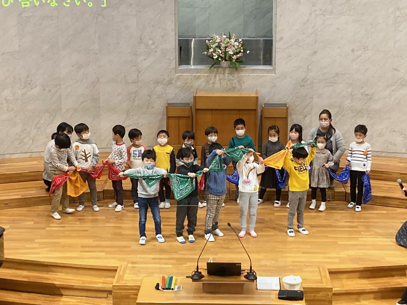 今日は水曜礼拝にめぐみ幼稚園の子ども達も参加しました。さくら組さんは運動会の時のバンダナ結びを思い出してやりました。