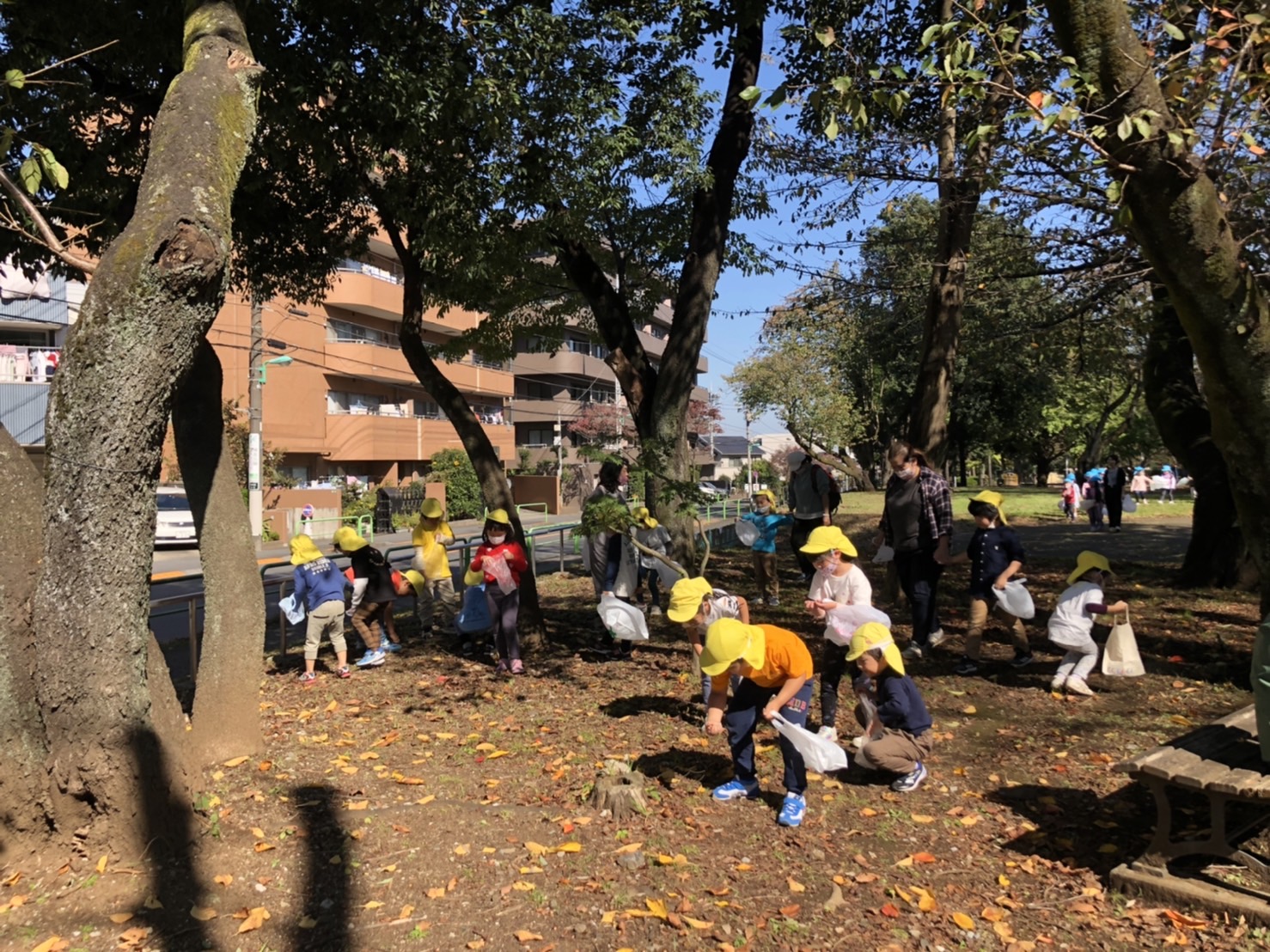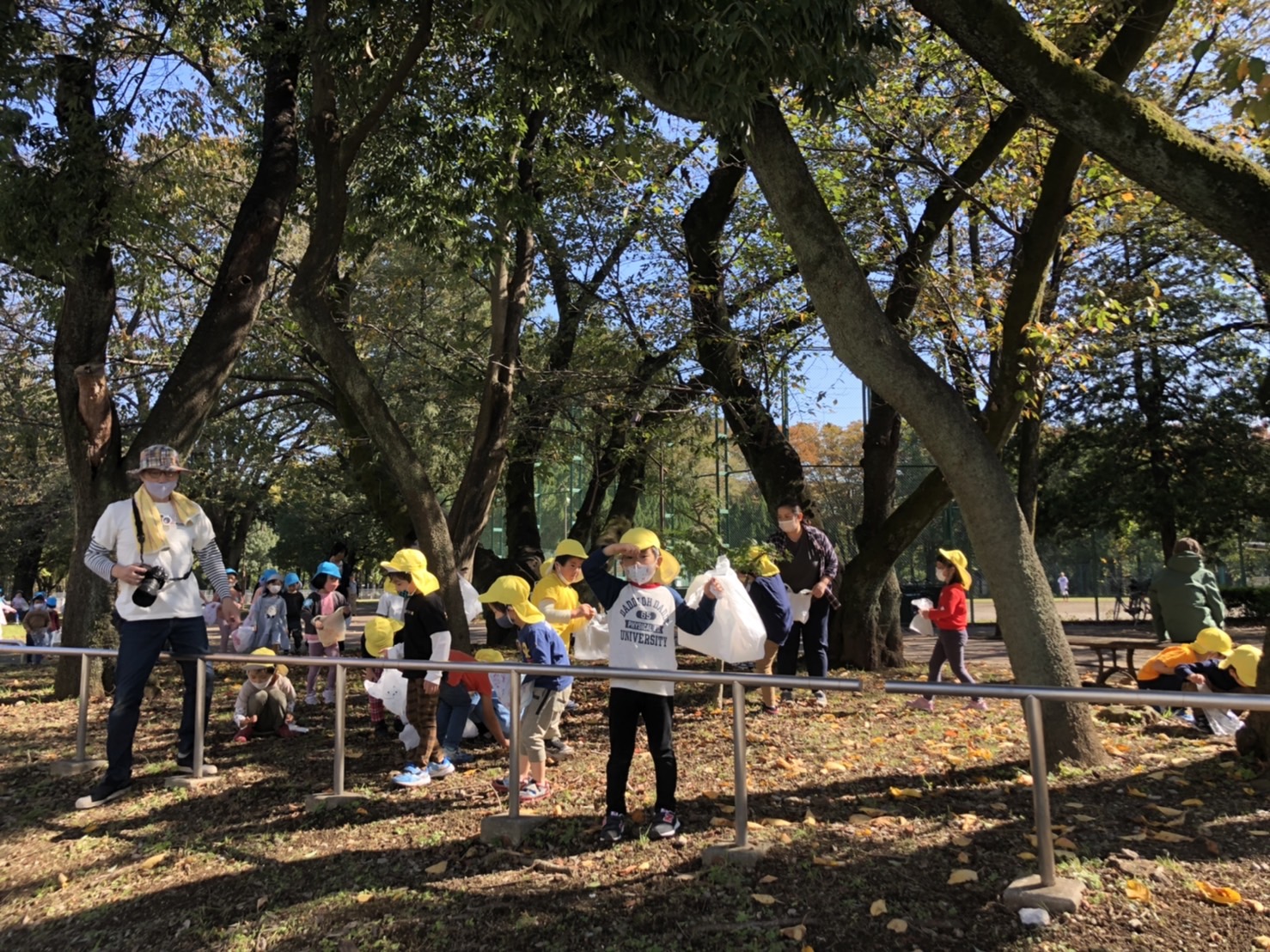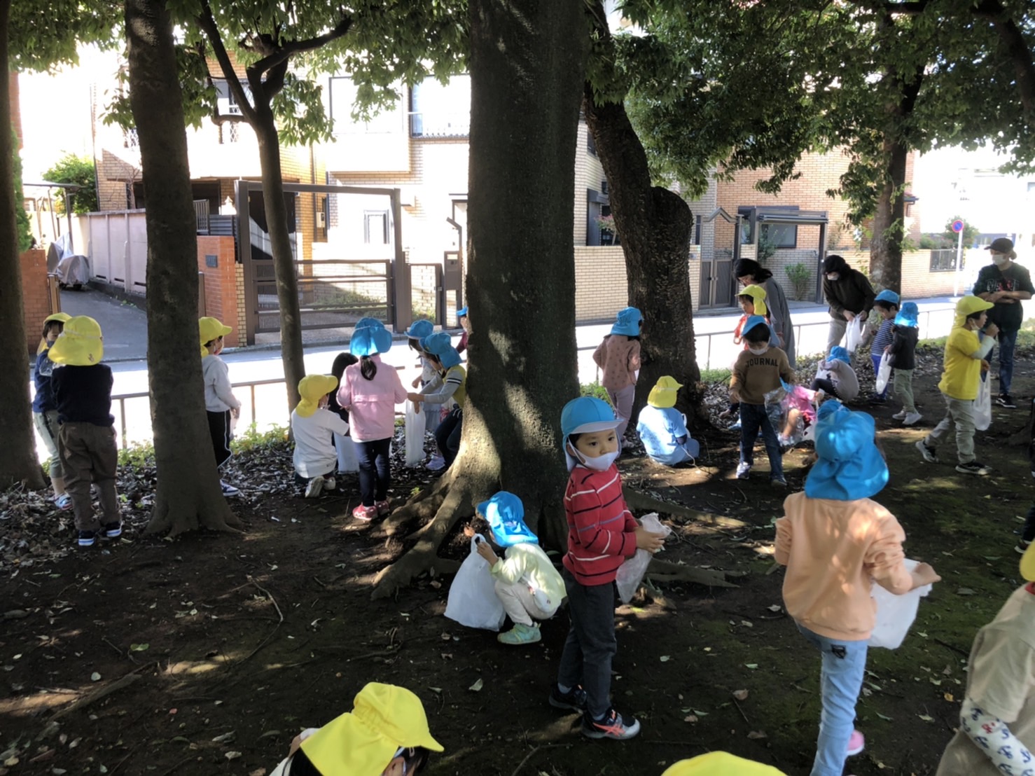 準備をして、どんぐり拾いに行きました。帽子をかぶったどんぐりや、まだ緑色のどんぐりを見つけて、子どもたちは喜んでいました。