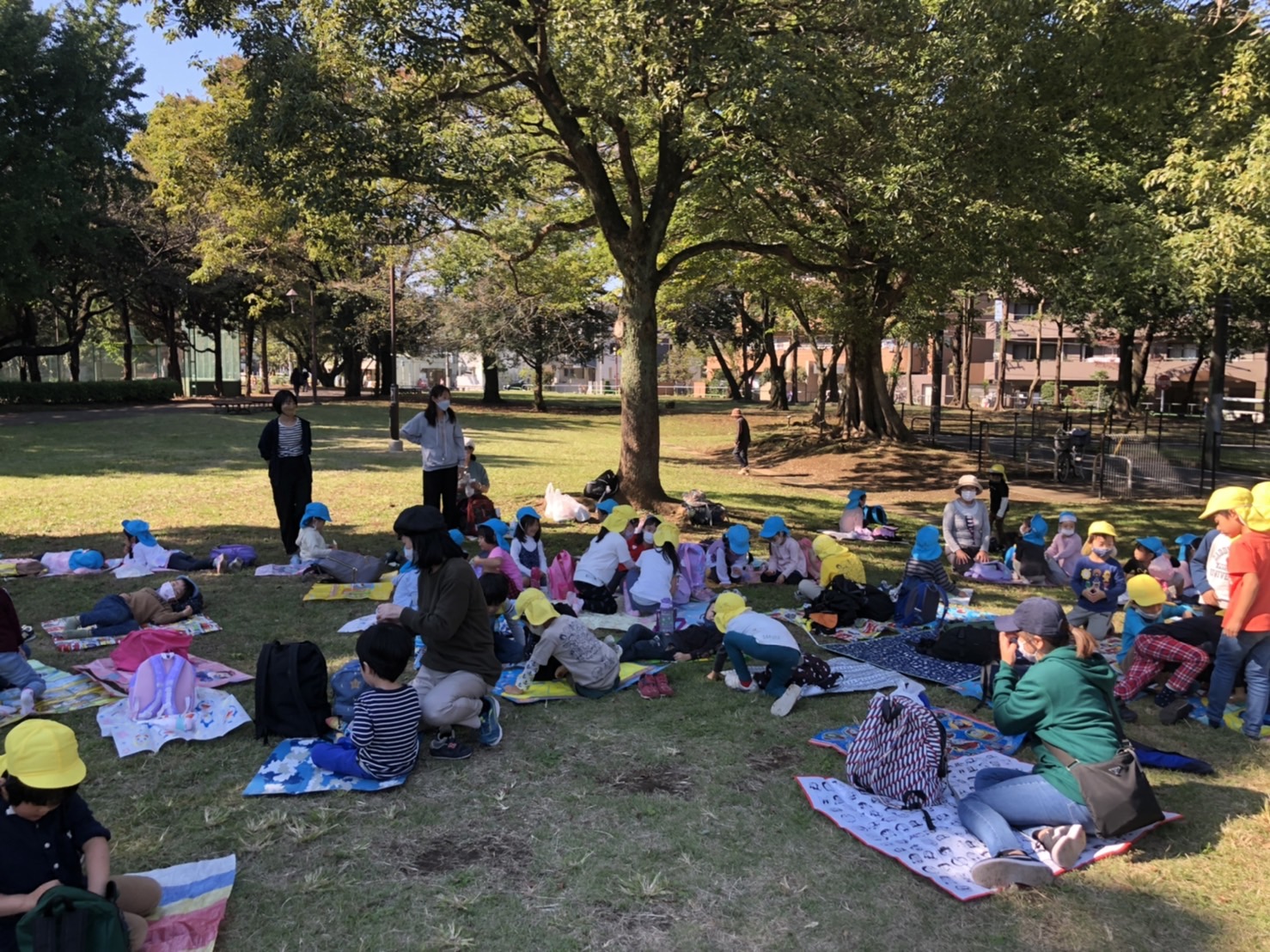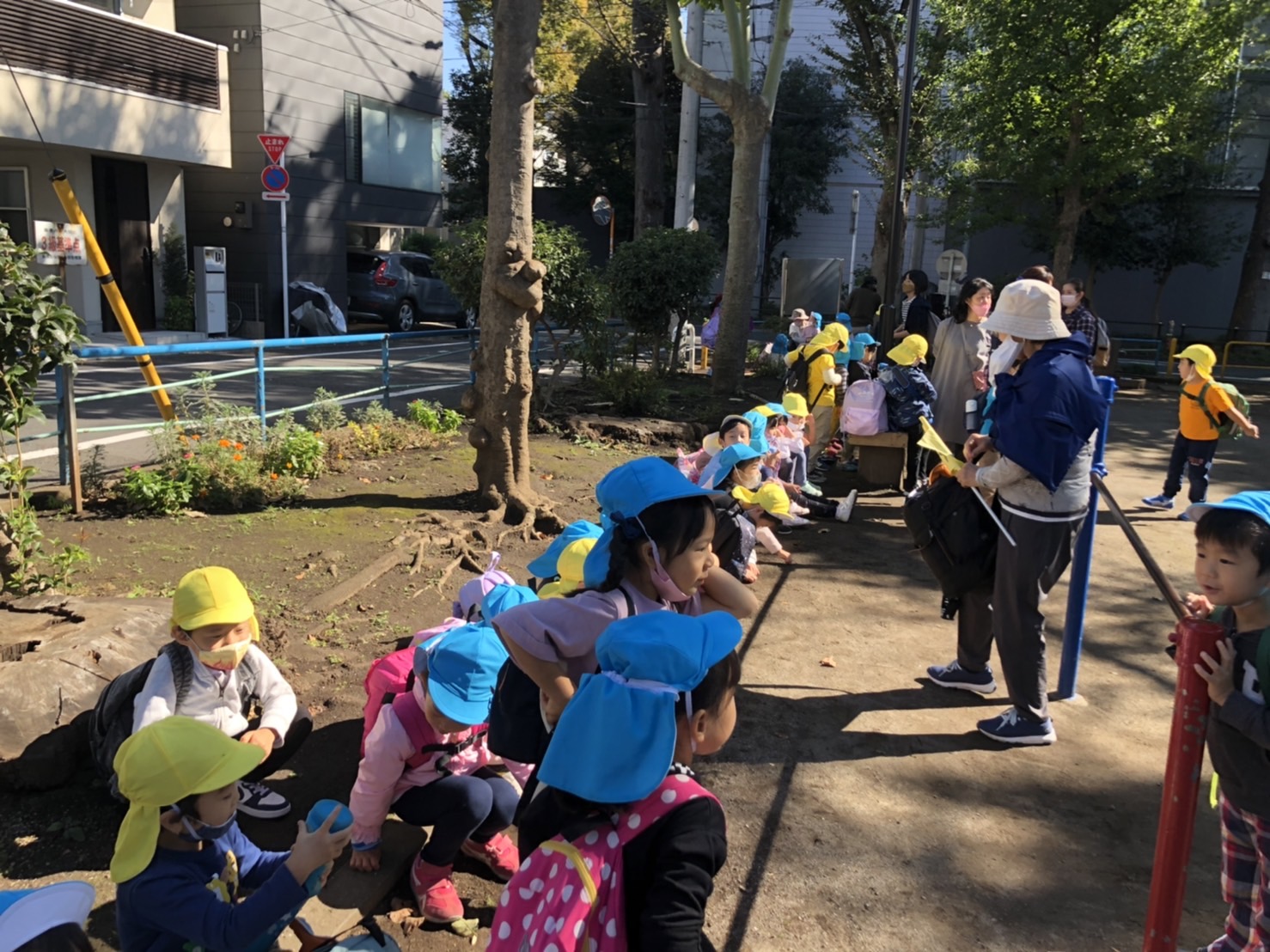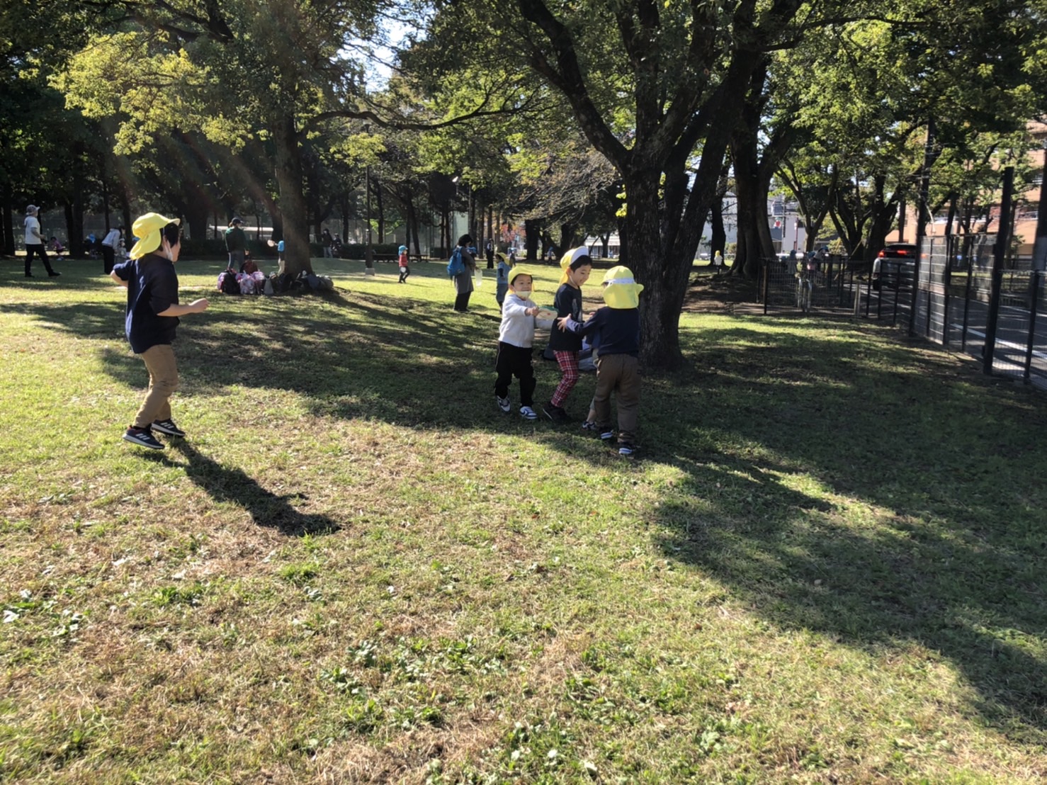 幼稚園を出発して、最初の休憩ポイントは緑ヶ丘第二公園。ブールドネージュのおやつを食べて再び出発し、城北公園に到着しました。