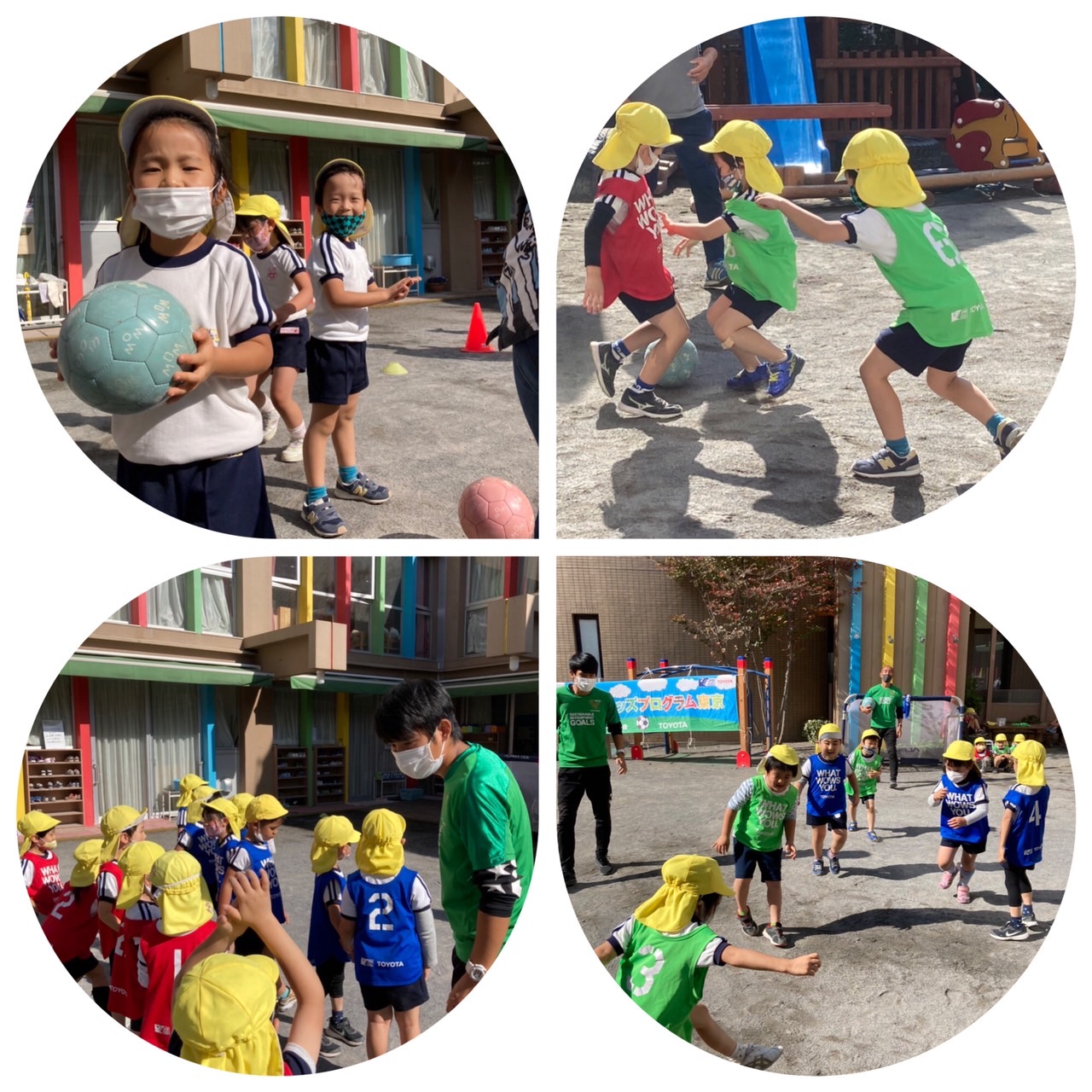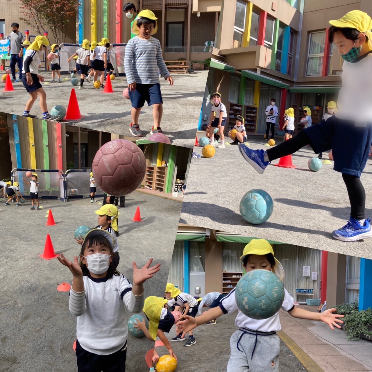 今日は、サッカー教室がありました。さくら組の子どもたちは、ニックネームの愉快な3人のコーチに、トレーニング・ボールの扱い方を教えてもらいました。
