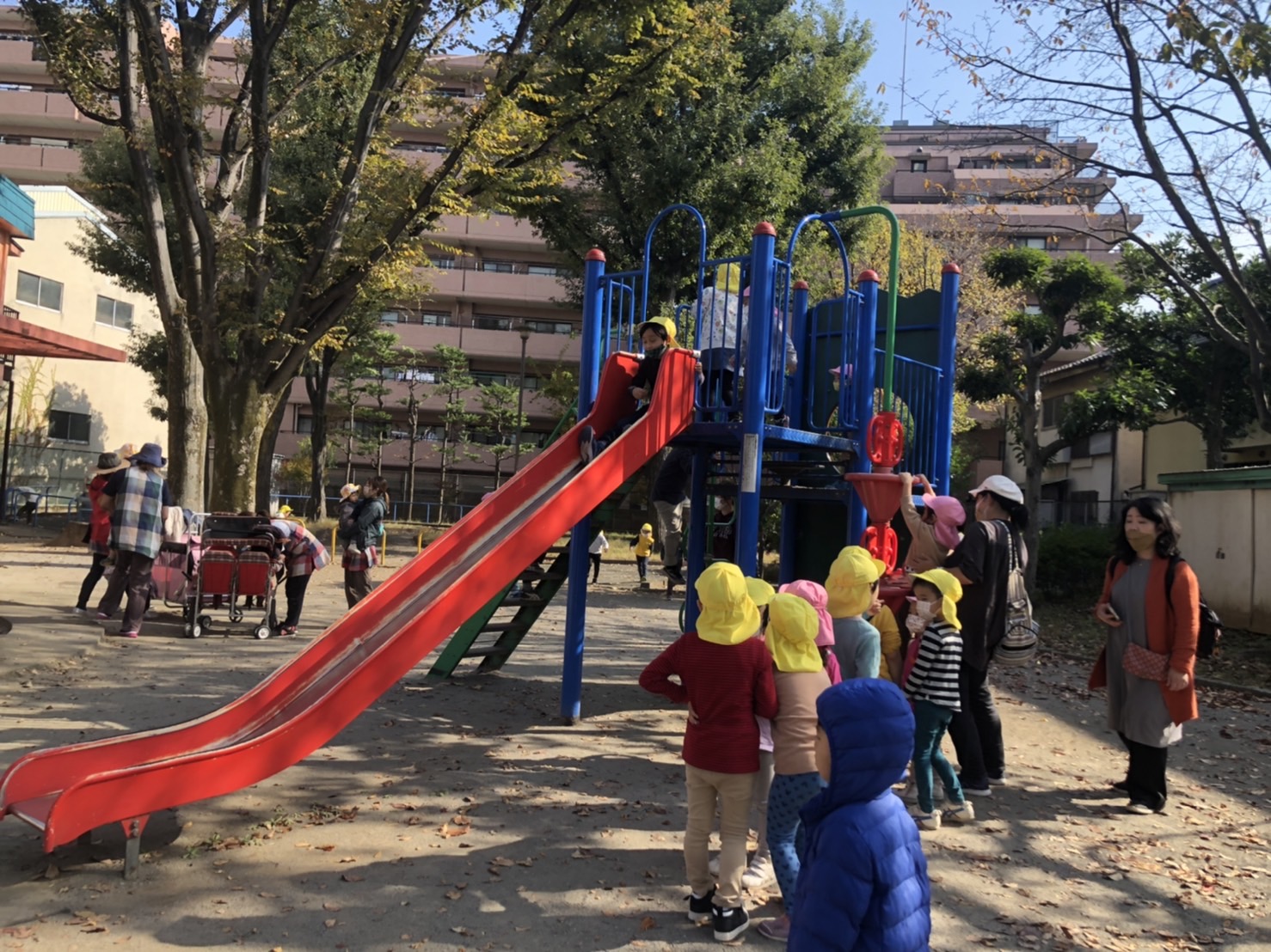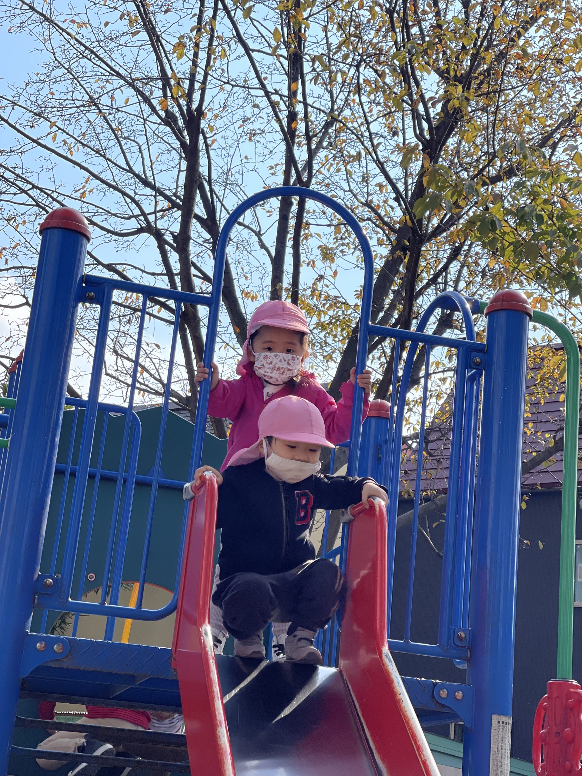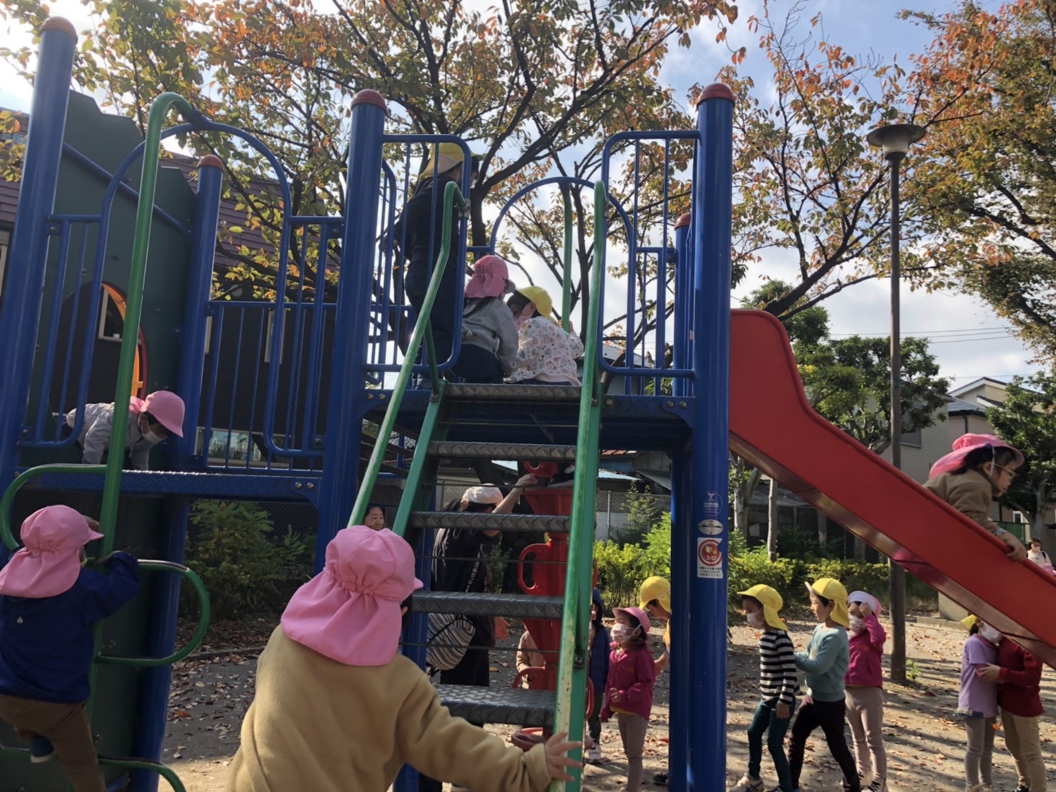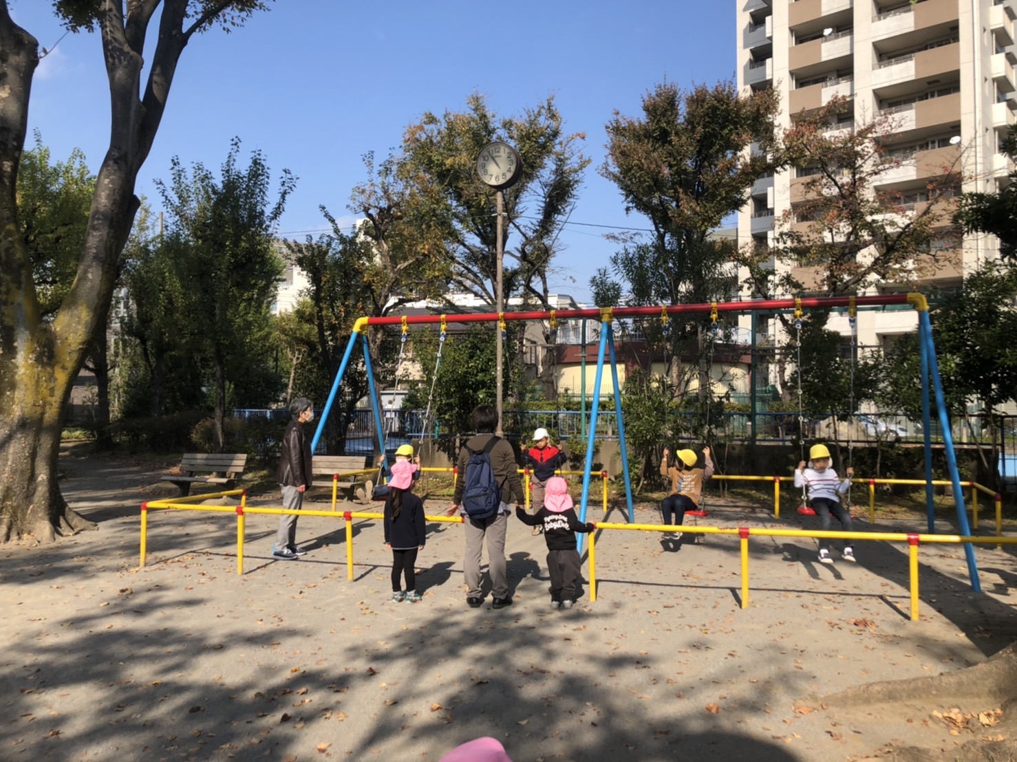 東山公園でブランコや、アスレチック滑り台をして遊び帰ってきました。移動では、壁側にゆり組さん、車道側はさくら組の子どもたち、お互いに息ぴったり交代しながら、歩く姿に成長を感じました!またお散歩にいきましょうね。
