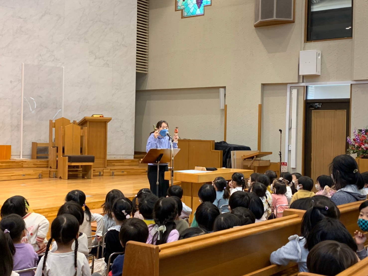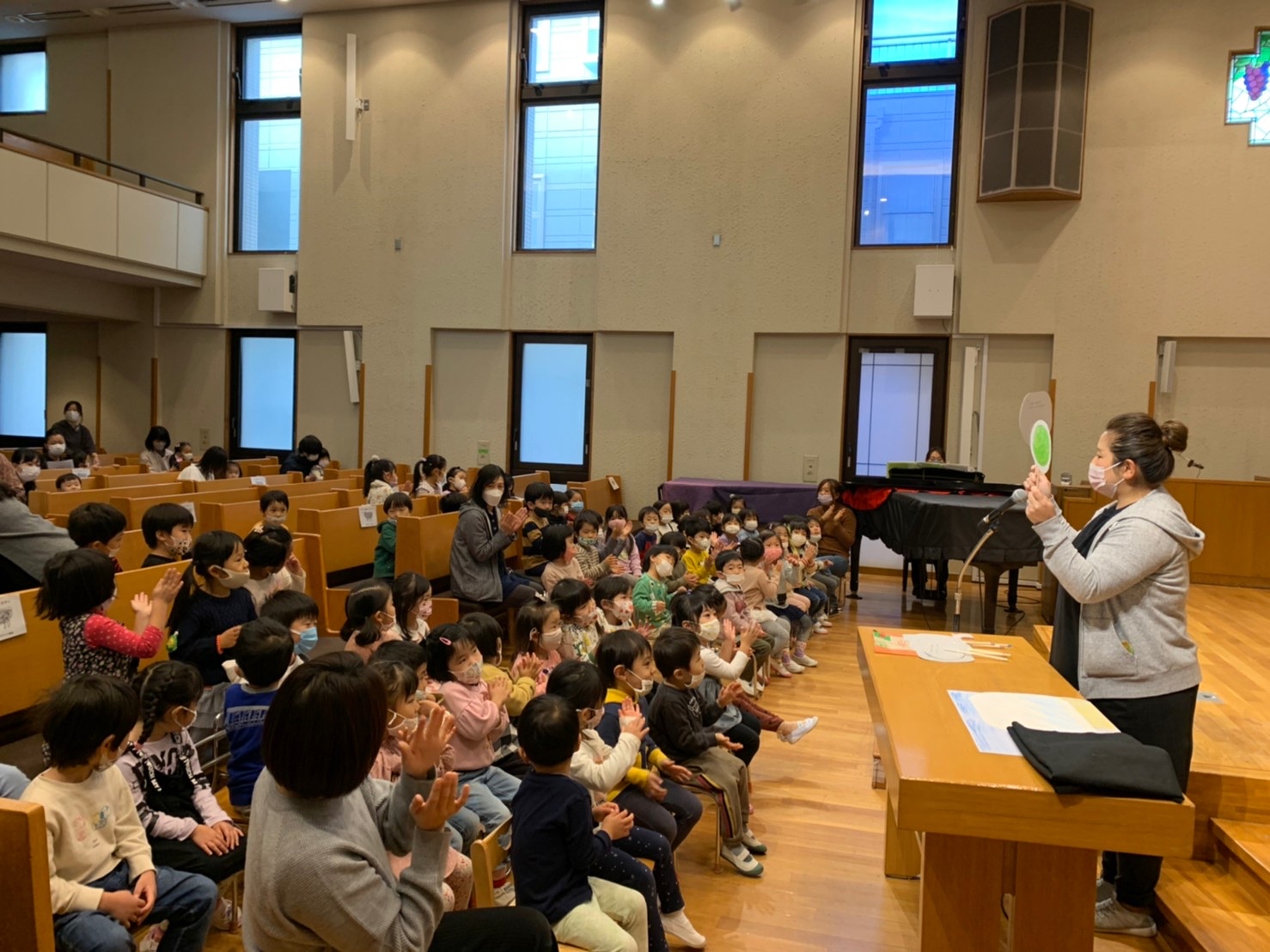 今日は教会で、在園のお兄さんお姉さん達と一緒に合同礼拝をしました。