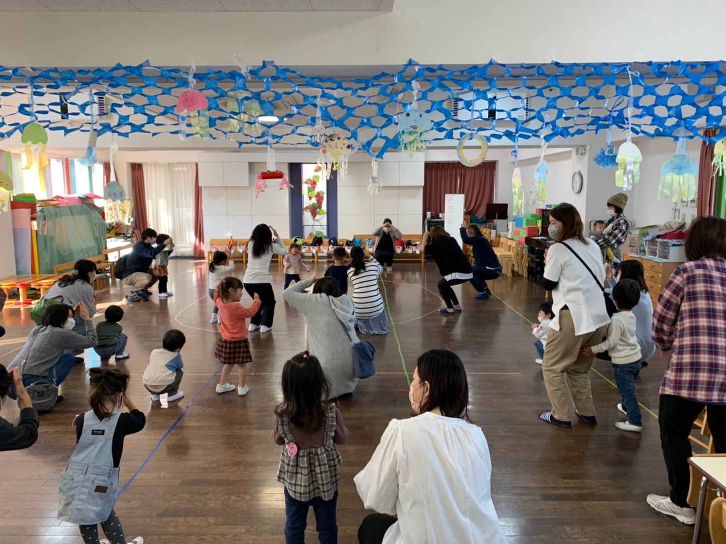 ホールに戻ってから、きのこ体操をして、音楽あそびの中からフリーウォークをしました。