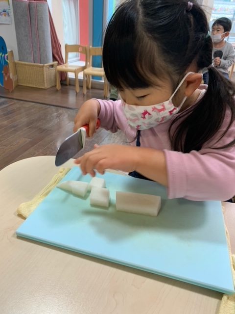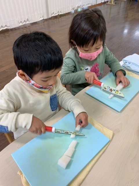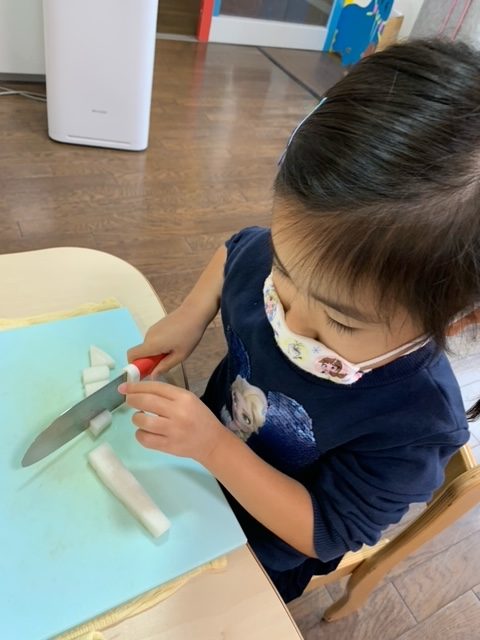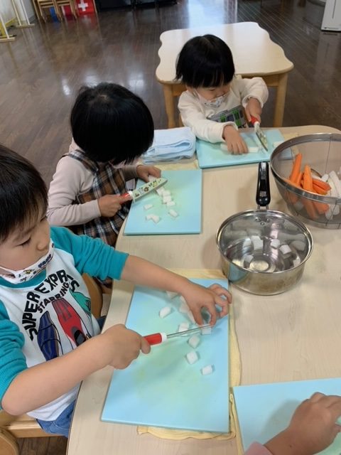 今日のゆり組 今日のひとこま 2021.11.22 月曜のお味噌汁はゆり組さんが作りました! 包丁を使うの上手になりましたね。自分達で作ったお味噌汁美味しかったですね。 クリスマス製作もやりました。出来上がりを楽しみにしていて下さいね。