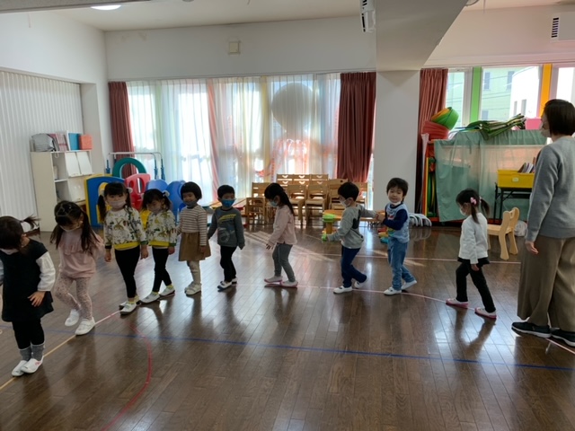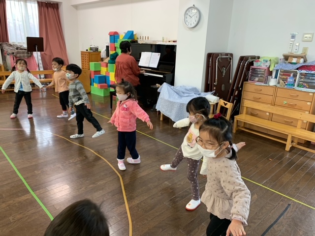 今日は久しぶりの音楽遊びがありました。ピアノに合わせて、歩いたり、楽器を使ったり、楽しかったですね。