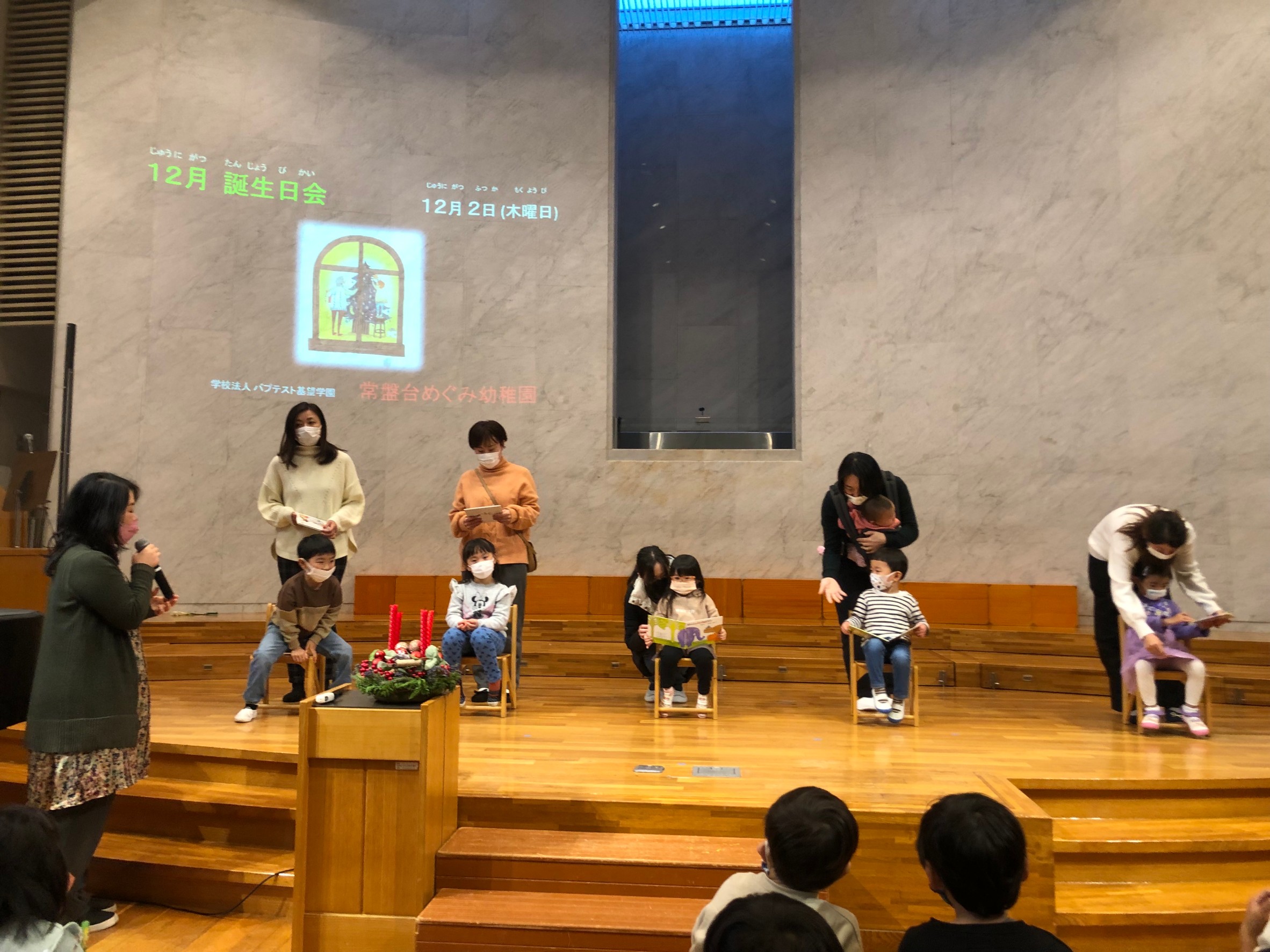 今日は12月生まれのお友だちのお誕生日会でした。礼拝ではアドベントクランツに火を灯して、心静かに、園長先生の優しい声の読み聞かせでクリスマスマーケットのお話しを聞きました。お祝いの後には、さくら組お母さま方のお楽しみ会!